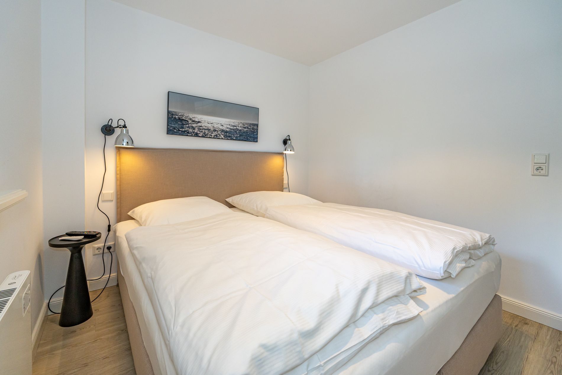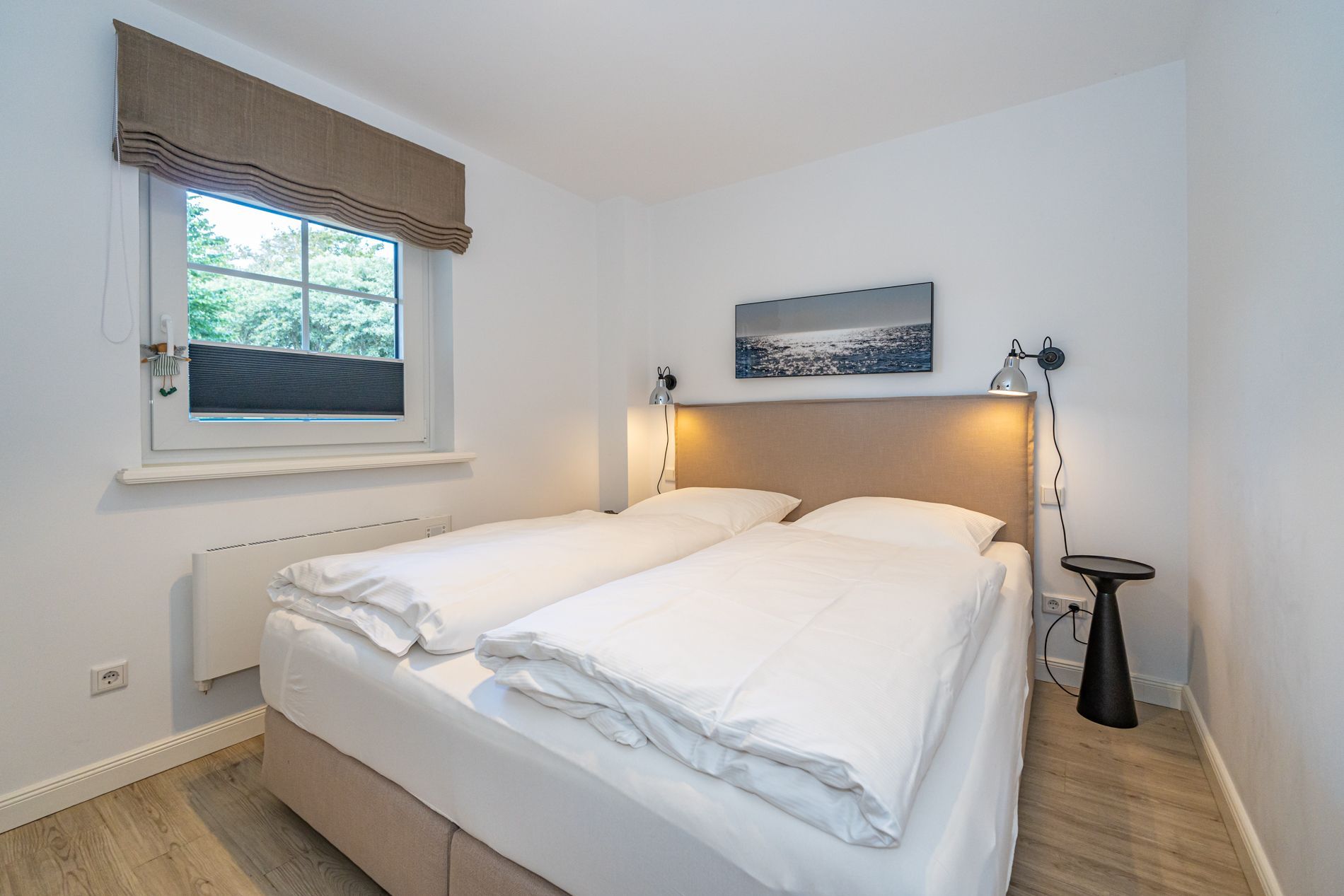 Das Schlafzimmer ist mit einem guten Boxspring-Doppelbett (Überlänge, zwei Einzelmatratzen je 0,90 x 2,10 m, mit durchgehendem Topper), Kleiderschrank und weiterem Flachbild-TV eingerichtet.