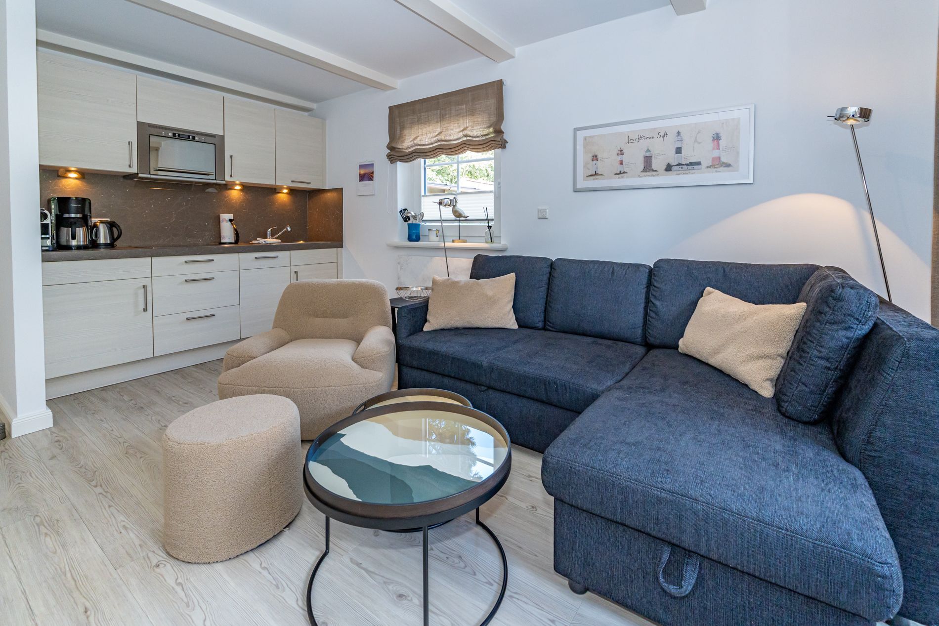 Der Wohnraum verfügt über eine moderne Sitzecke (gute Schlafcouch) mit Sessel und Fußhocker, einen Essplatz, Flachbild-TV (Bildschirmdiagonale 105 cm), Radio-CD sowie DVD-Player.