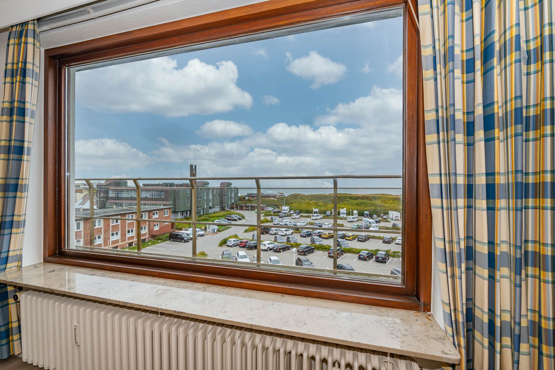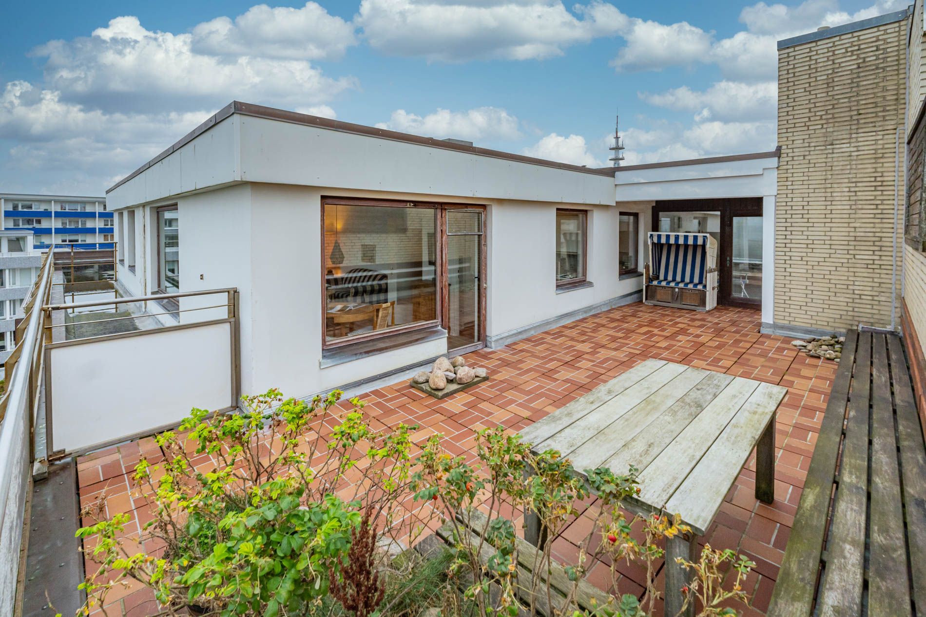 2-Zimmer-Nichtraucher-Ferienwohnung mit traumhaften Meerblick (ca. 50 qm) in der 4. obersten Etage für max. 4 Personen mit großzügiger Dachterrasse (sonnige Südwestlage, mit Gartenmöbeln und Auflagen) und Strandkorb.