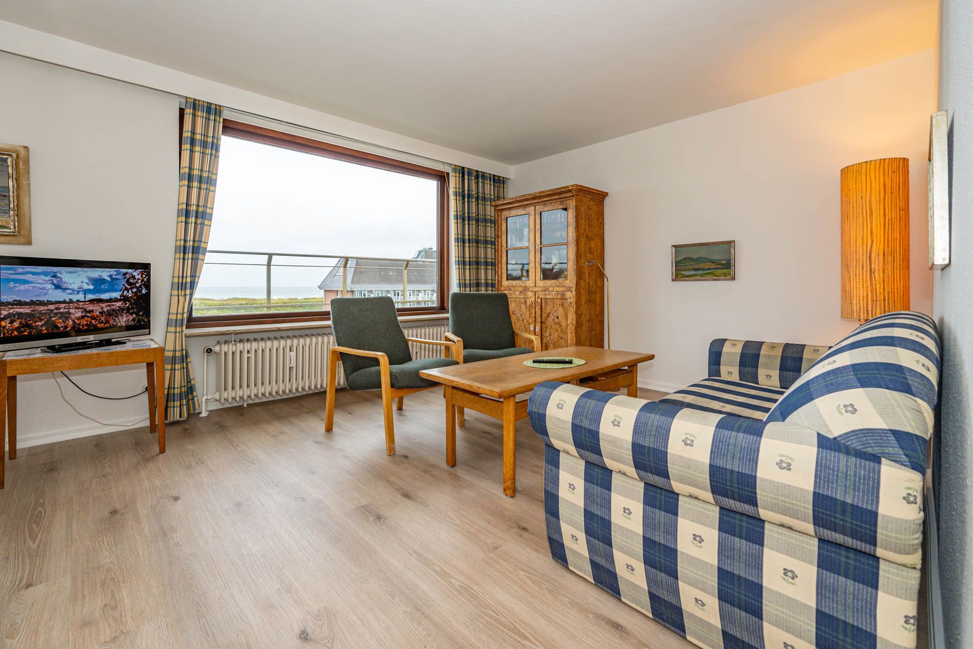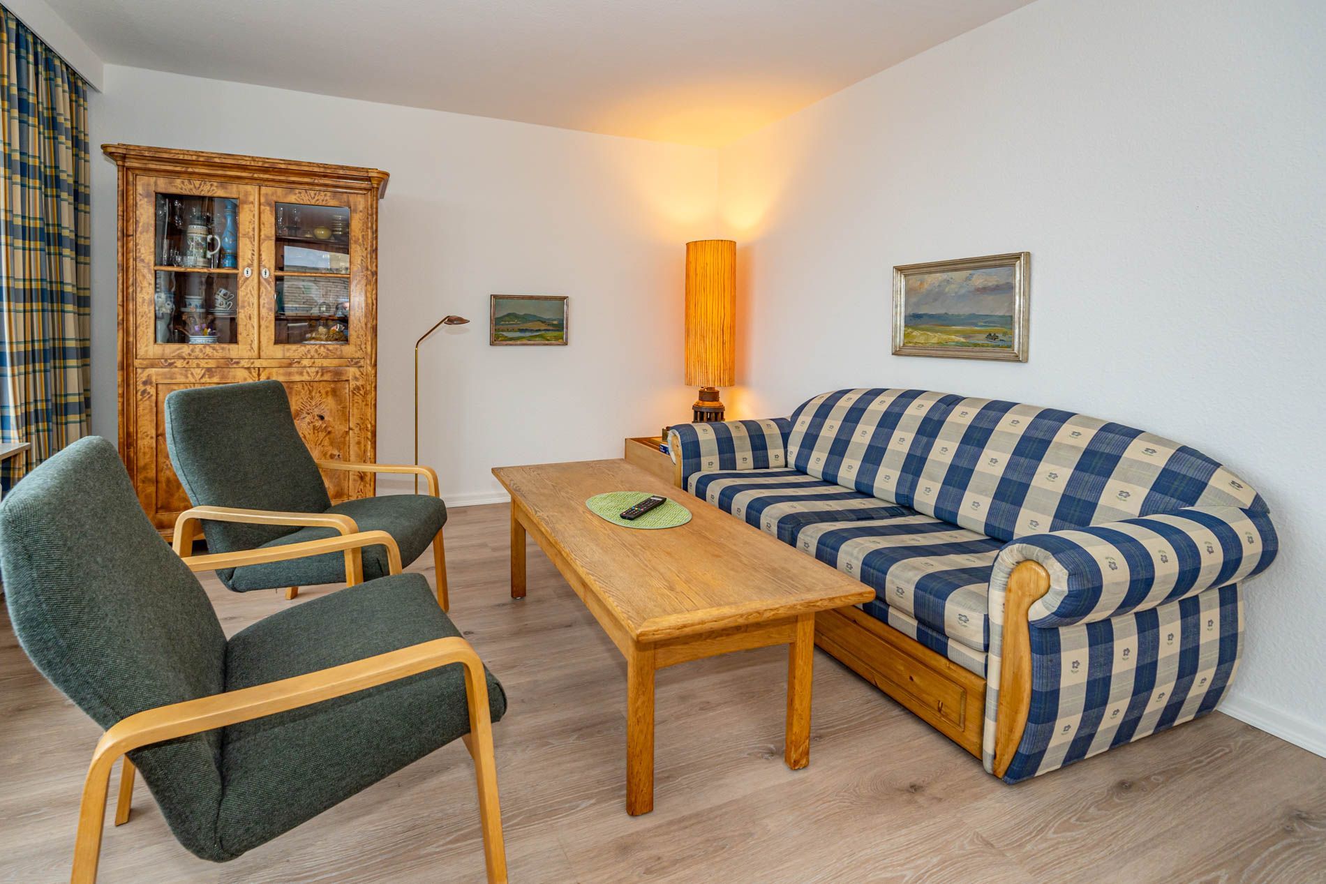Der Wohnraum besteht aus einer 2-Sitzer-Doppelschlafcouch (1,40 x 2,00 m) und zwei Armlehnstühlen, einem Essplatz, Kabel-TV und einer hellen zum Wohnraum hin offenen Küche.
