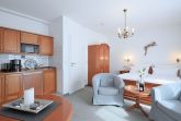 Das Appartement in Hochparterre mit 28m² befindet sich in der Appartement-Villa Steinfurth, welche direkt am Meer liegt. Dem Wohn-/ Schlafraum ist ein Balkon in Südostausrichtung vorgelagert. Der helle, große Wohnraum mit Schlafbereich, Küchenzeile, Essplatz und TV ist gemütlich und klassisch möbliert. Die Küchenzeile ist ausgestattet mit 4-Platten-Cerankochfeld, Mikrowelle, Kühlschrank, Kaffeemaschine, Wasserkocher und Toaster. Das Doppellbett mit einer Liegefläche von 180 x 200 cm schläft sich herrlich komfortabel. Ein Duschbad mit WC und Haartrockner ist ebenfalls vorhanden.
