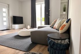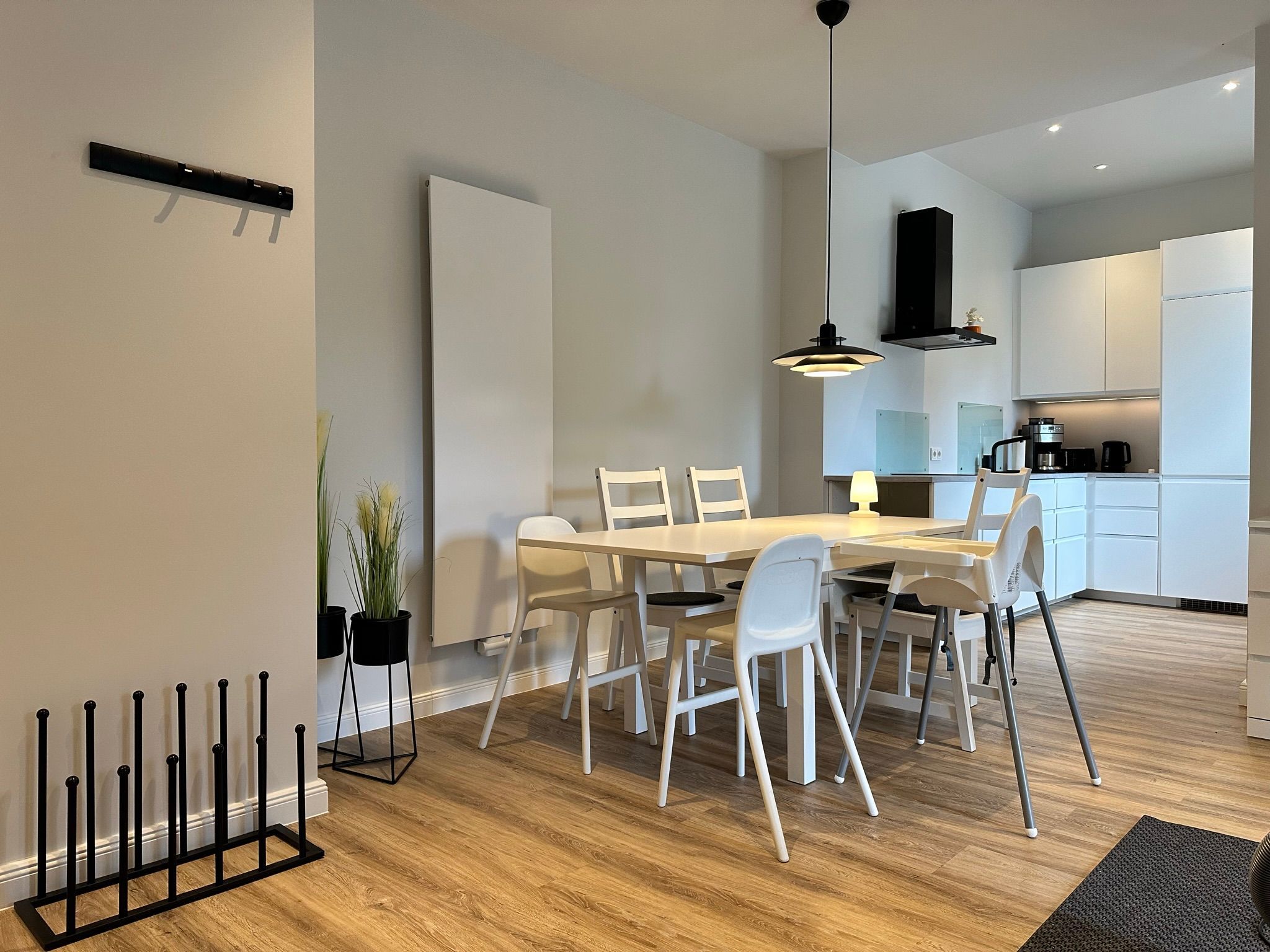 Ideal für große Familien ist das Apartment „Matthias Claudius“ im Erdgeschoss des Landhauses. Die helle und charmante Wohnung (ca. 84 m²) besticht durch sehr viel Liebe zum Detail: 3 großzügige Räume mit hohen Decken und einem tollen Lichteinfall durch die doppelflügigen und bodentiefen Fensterelementen in allen Räumen.