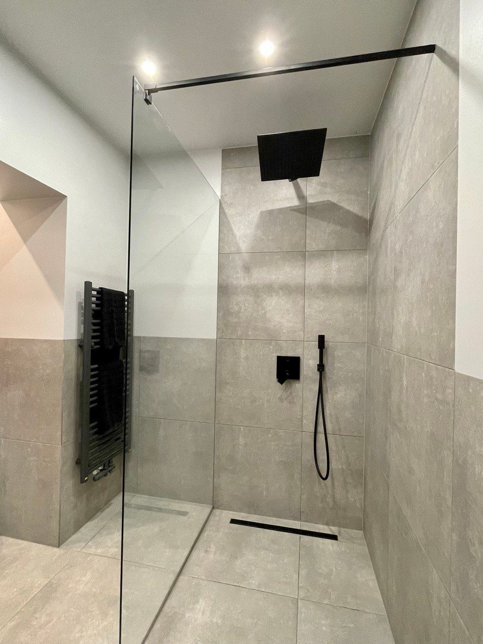 Die Wohnung verfügt über ein sehr modernes, großzügiges Vollbad mit Regendusche mit hochwertigen schwarzmatten Armaturen und Waschmaschine inkl. Trockner.