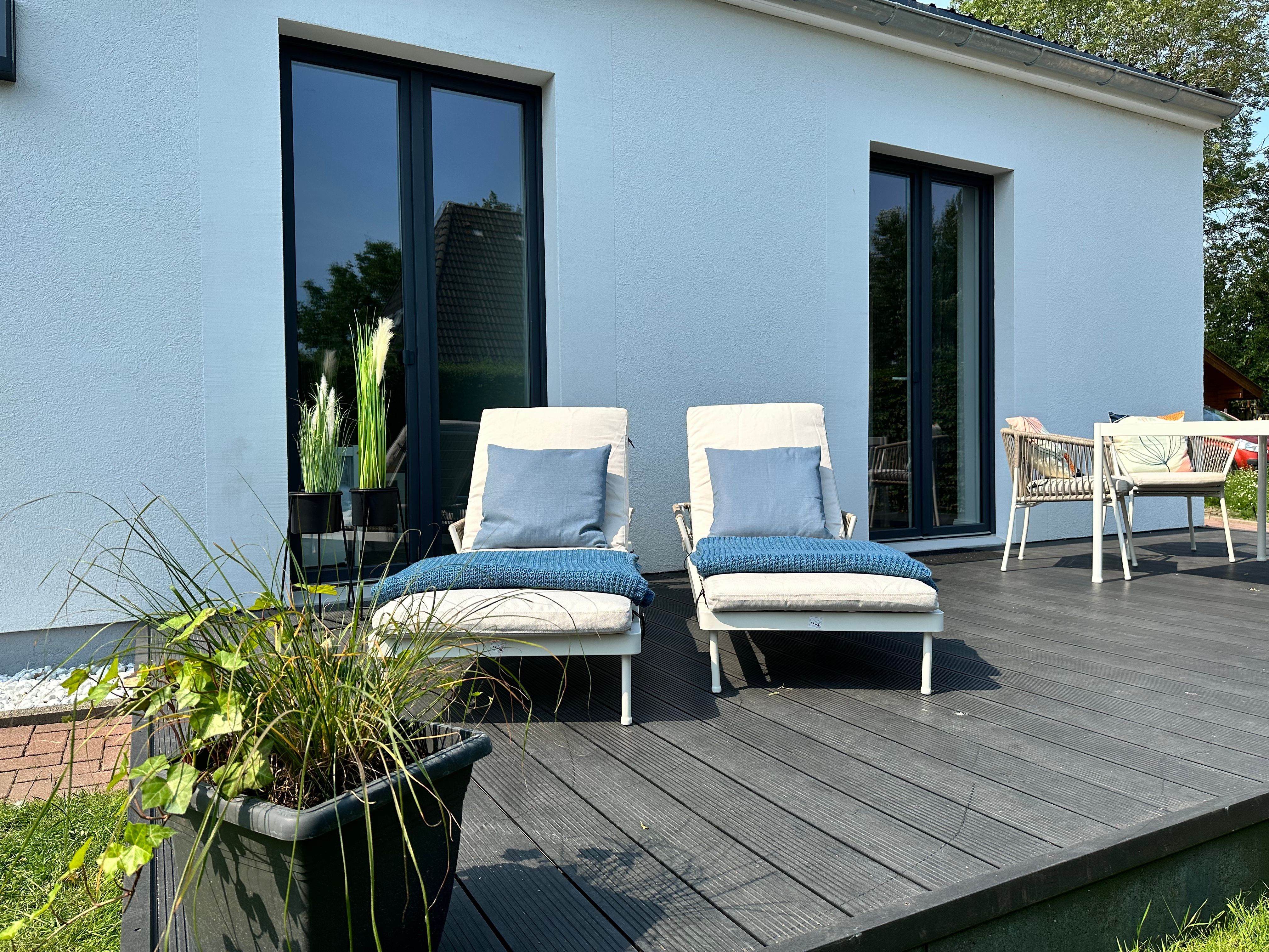 Ein Highlight ist der eigene Terrassenbereich im Garten. Die ca. 20 m² große Terrasse ist durch die schön gewachsene Hecke von der Straße nahezu komplett uneinsehbar eingezäunt und wird zur Ruheinsel im hinteren Bereich des Landhauses - ideal für Hunde- und Nordseefreunde! Hier lässt sich hier wunderbar entspannen und es kommen Urlaubsgefühle auf.