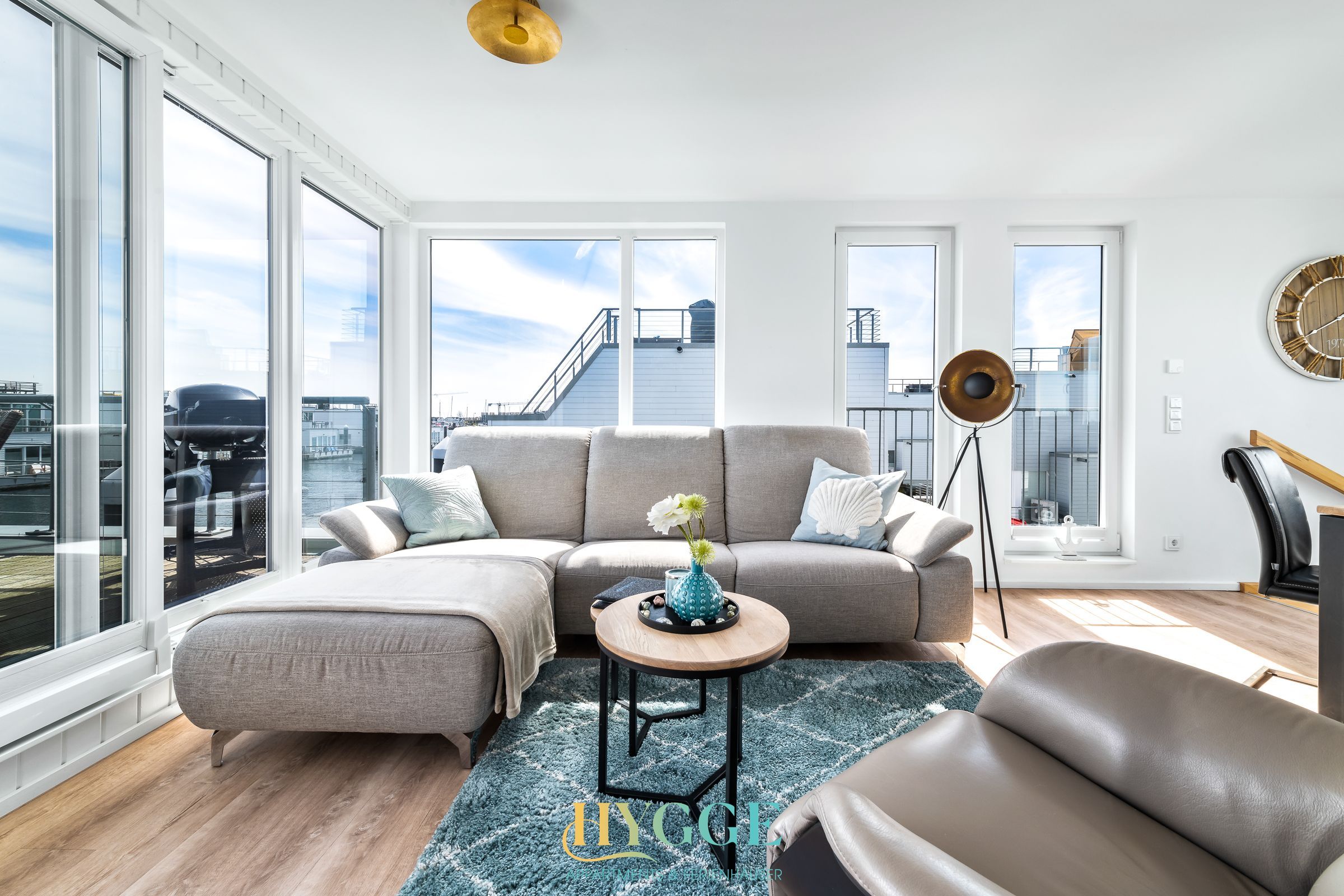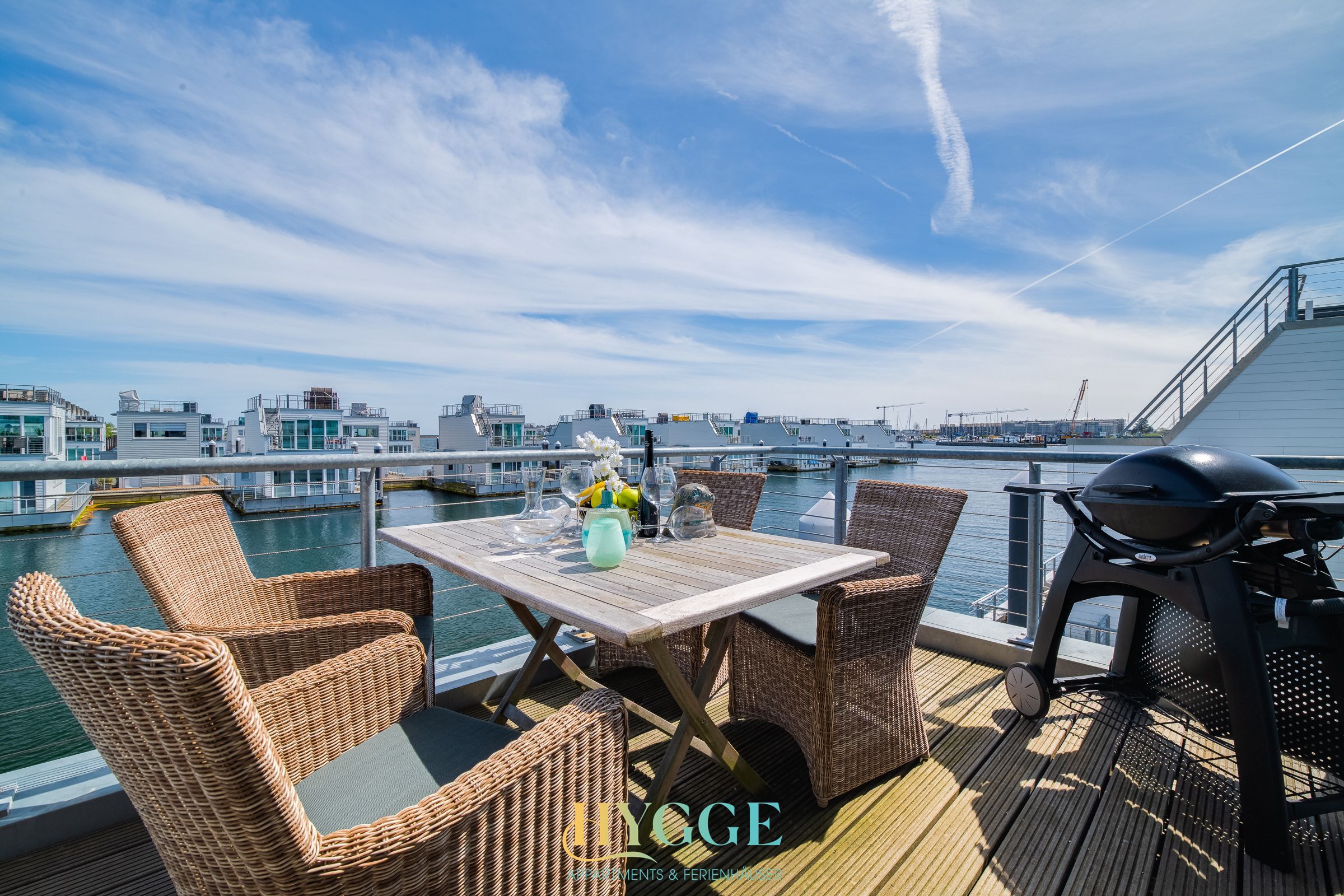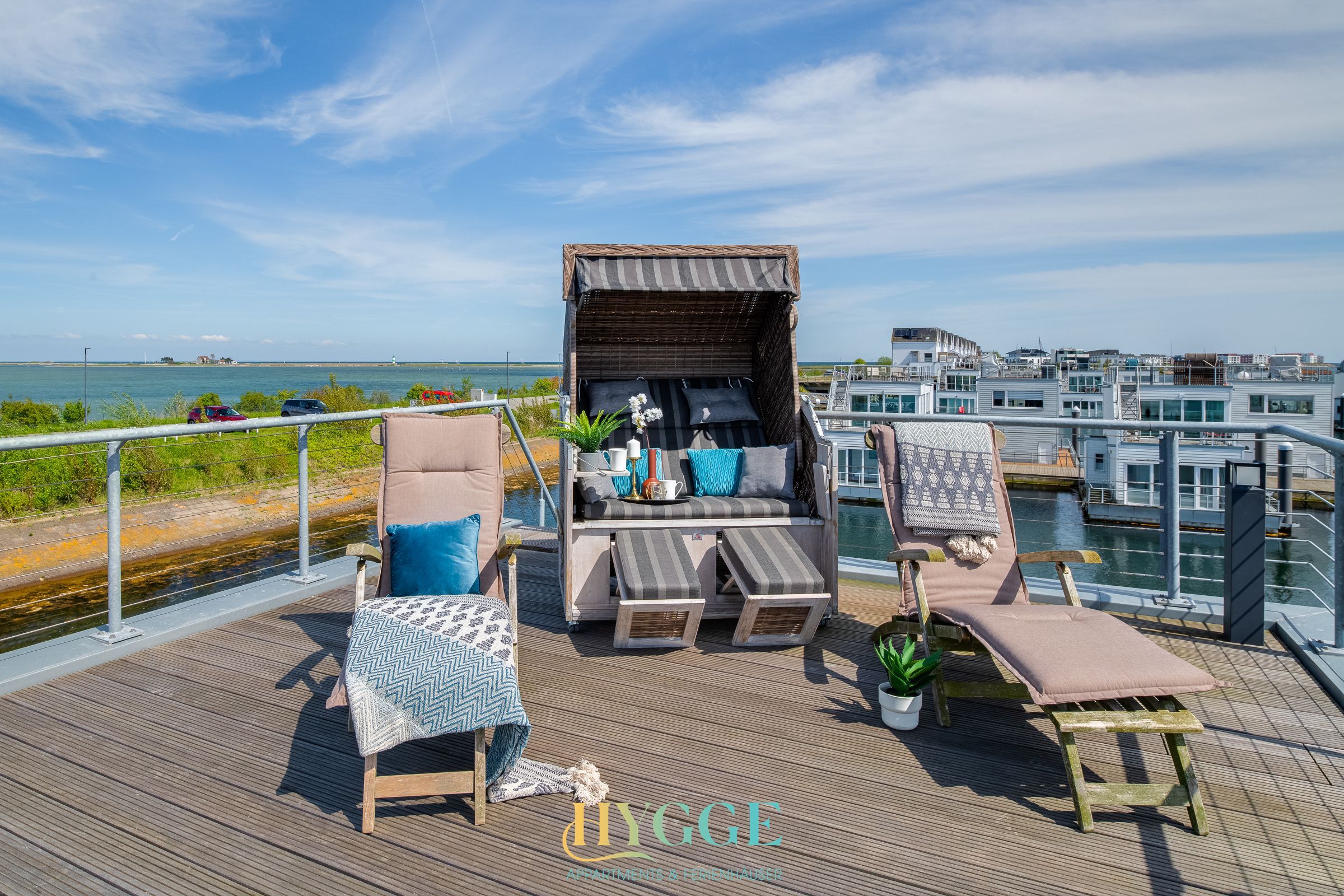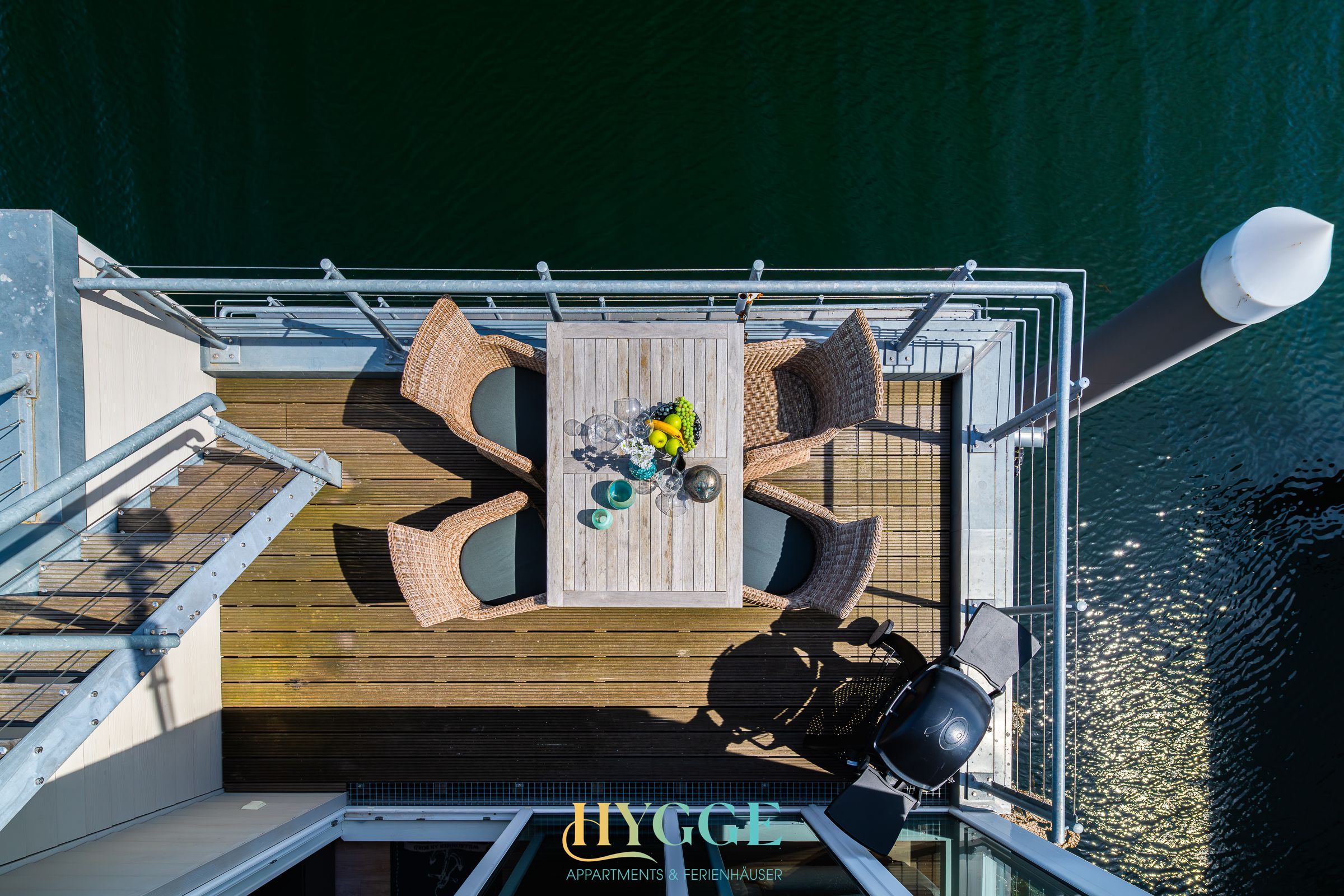 Das schwimmende Haus erstreckt sich über drei Ebenen. Im Obergeschoss befindet sich der offen gestaltete Wohn- und Essbereich mit rundum Wasserblick, voll ausgestatteter Wohnküche und angrenzender Terrasse. Von hier aus gelangt man auf die spektakuläre Dachterrasse mit Blick über den Segel- und Sportboothafen, die Schlei und deren Mündung in die Ostsee. Ausgestattet mit hochwertigen Gartenmöbeln, Strandkorb und Weber Elektrogrill bieten die Terrassen pures Urlaubsfeeling und atemberaubende Sonnenuntergänge. Der Bootsanleger ist direkt von der Tür, sodass die Anreise mit dem eigenen Boot kein Problem ist.