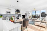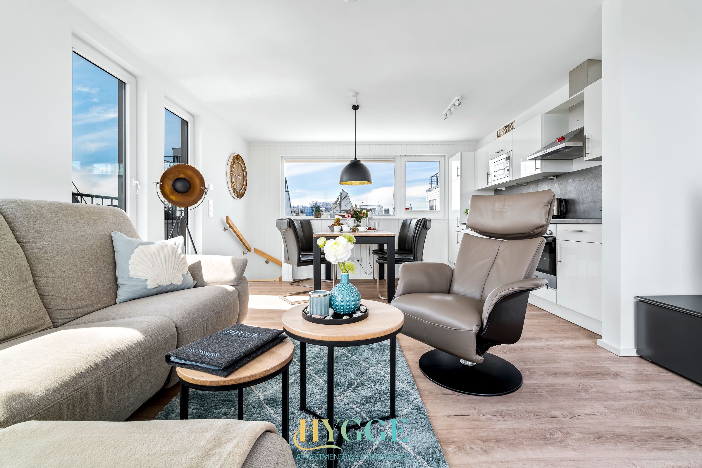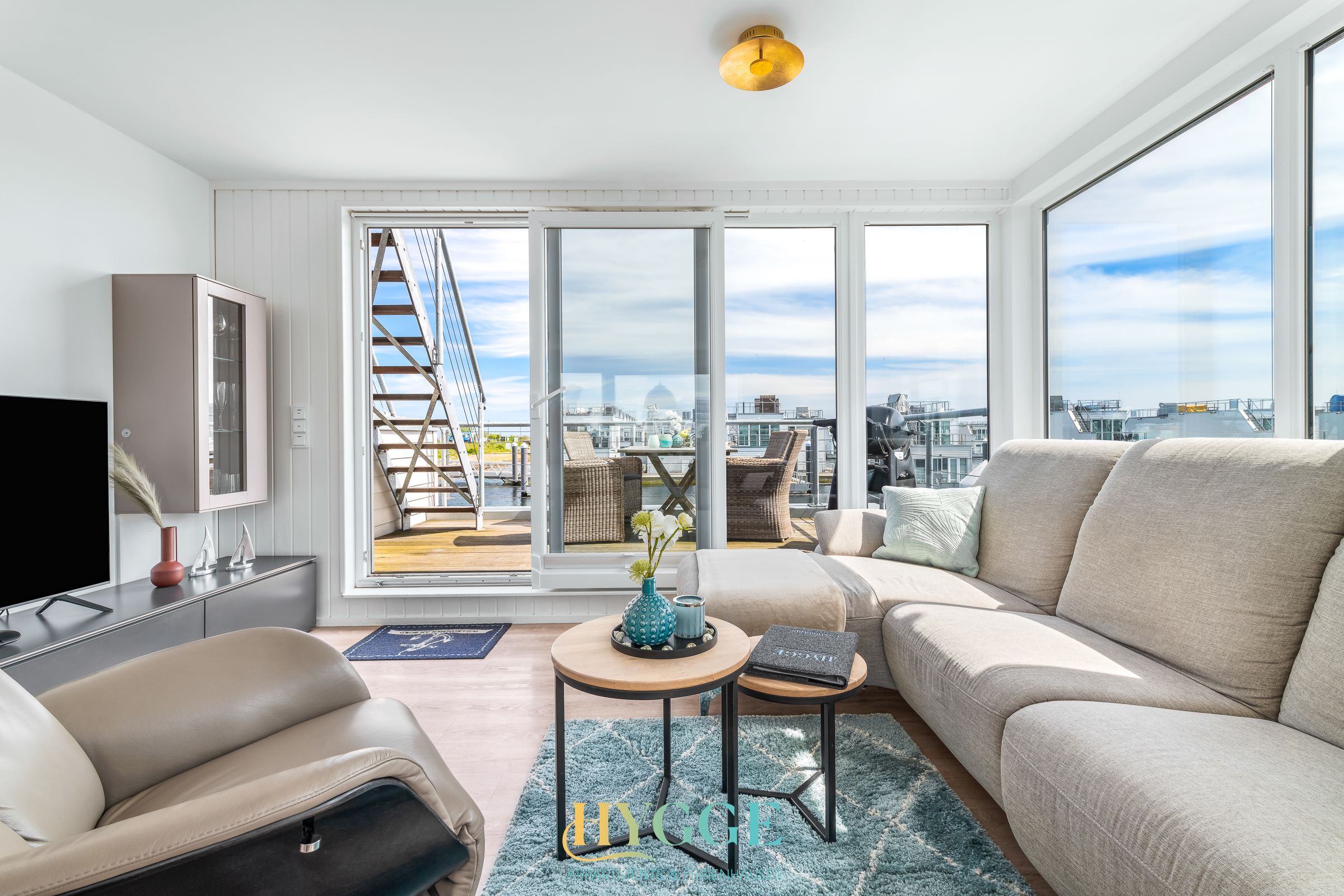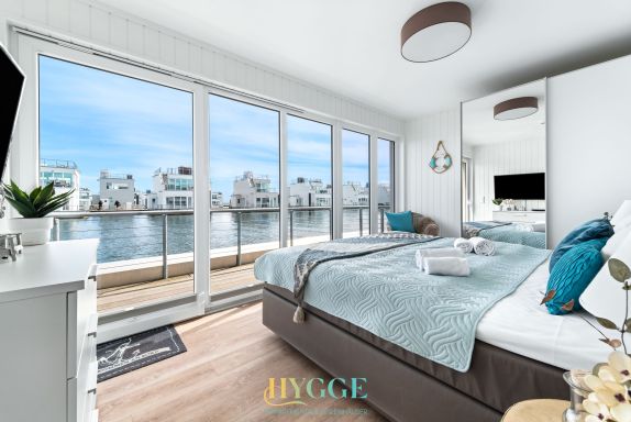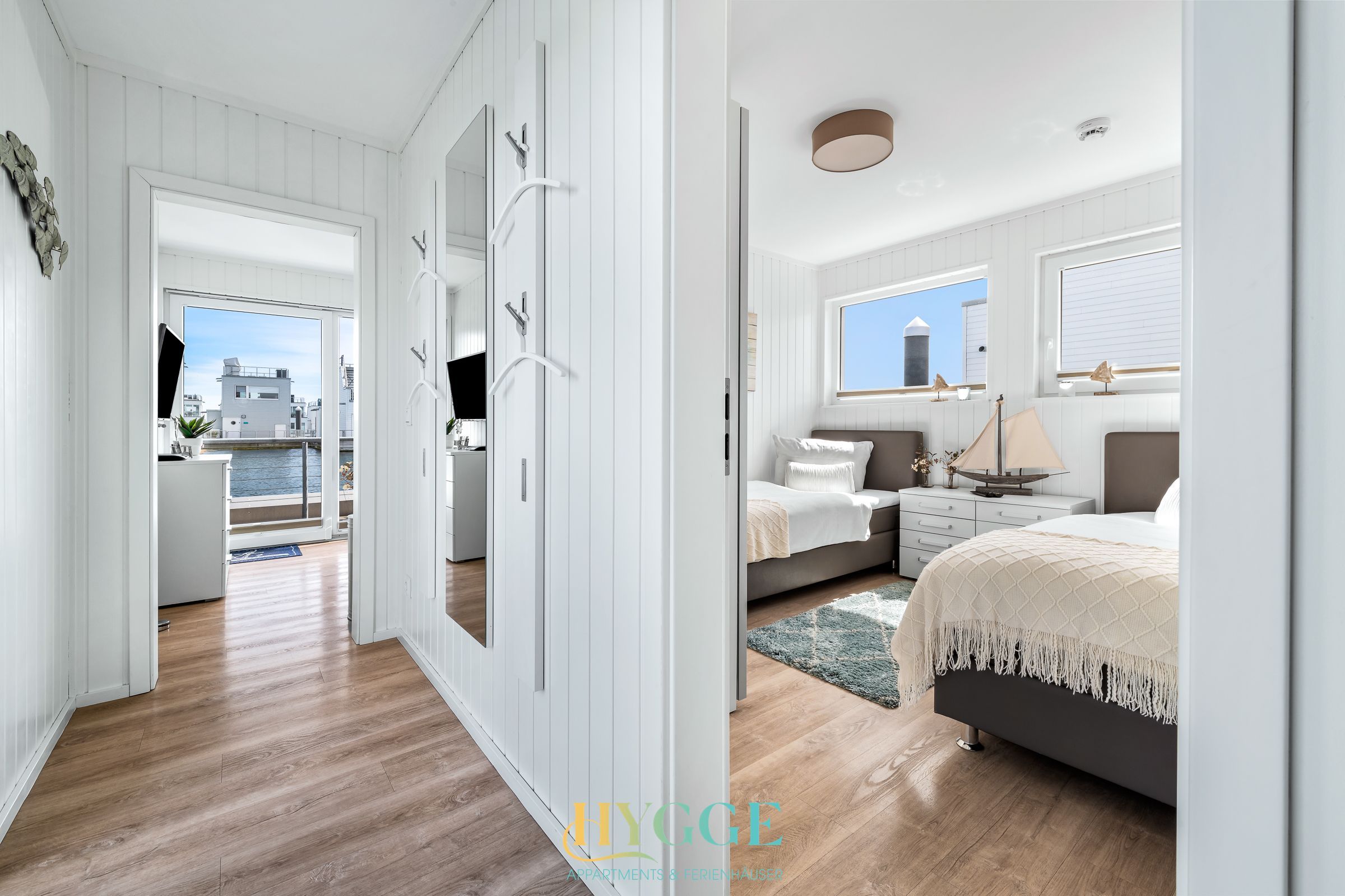 Das schwimmende Haus erstreckt sich über drei Ebenen. Im Obergeschoss befindet sich der offen gestaltete Wohn- und Essbereich mit rundum Wasserblick, voll ausgestatteter Wohnküche und angrenzender Terrasse. Von hier aus gelangt man auf die spektakuläre Dachterrasse mit Blick über den Segel- und Sportboothafen, die Schlei und deren Mündung in die Ostsee. Ausgestattet mit hochwertigen Gartenmöbeln, Strandkorb und Weber Elektrogrill bieten die Terrassen pures Urlaubsfeeling und atemberaubende Sonnenuntergänge. Der Bootsanleger ist direkt von der Tür, sodass die Anreise mit dem eigenen Boot kein Problem ist.
