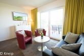 Der helle Wohnbereich verfügt über ein Schlafsofa, ein Couchtisch und zwei Sessel. Durch das Schlafsofa ist es möglich mit max. vier Personen zu übernachten. Ein Fernseher mit Satellitenempfang steht zur Verfügung.