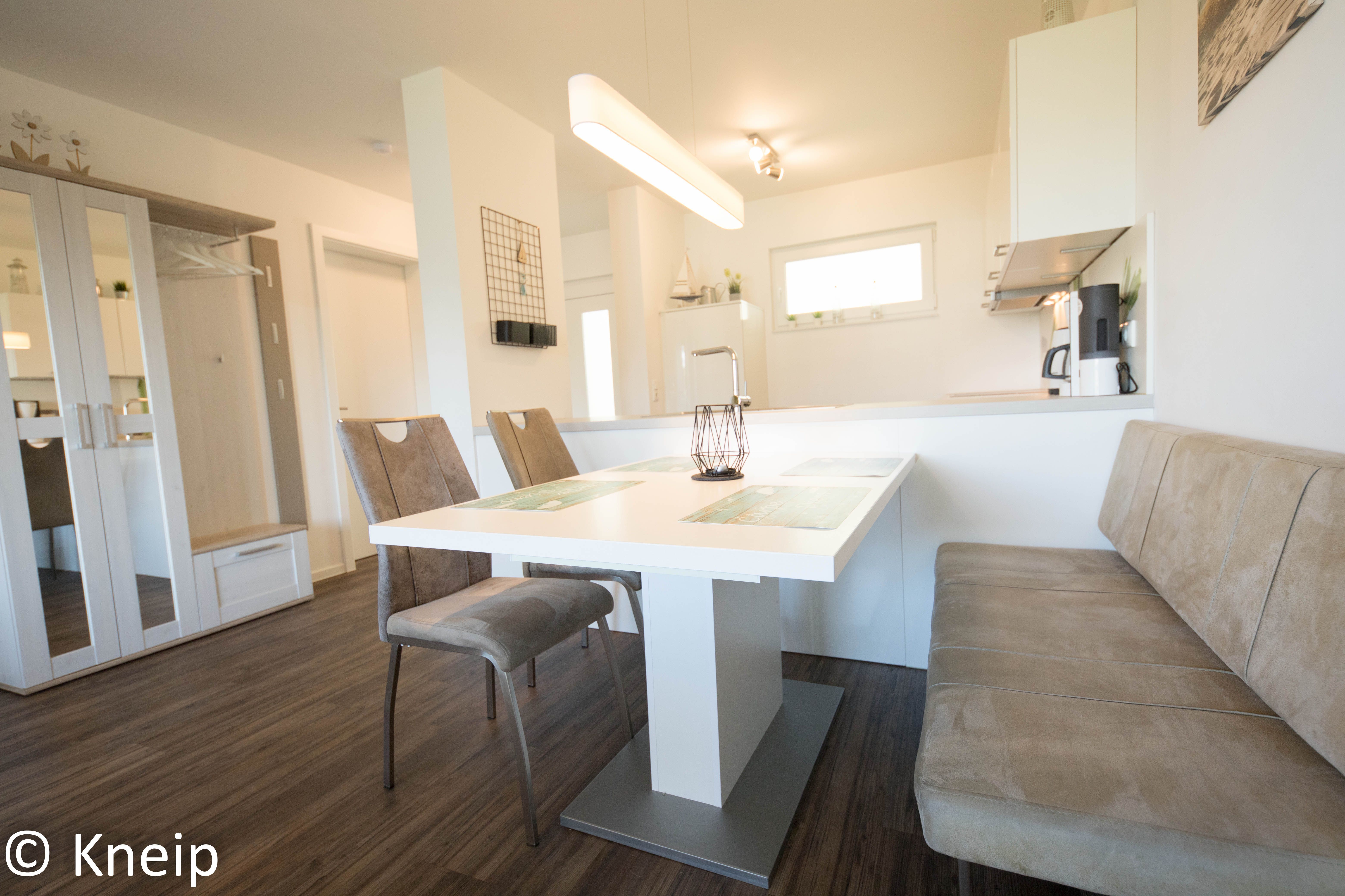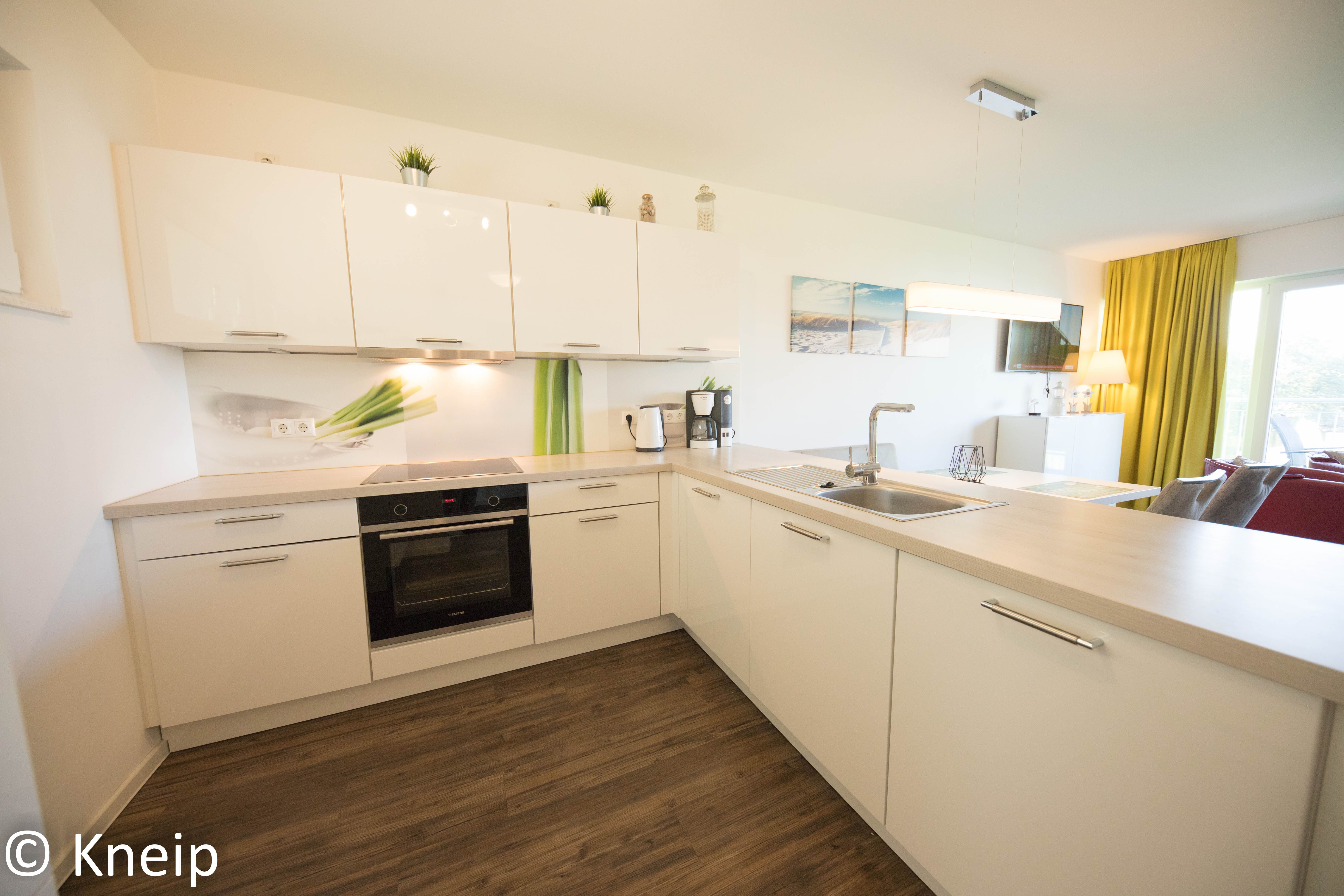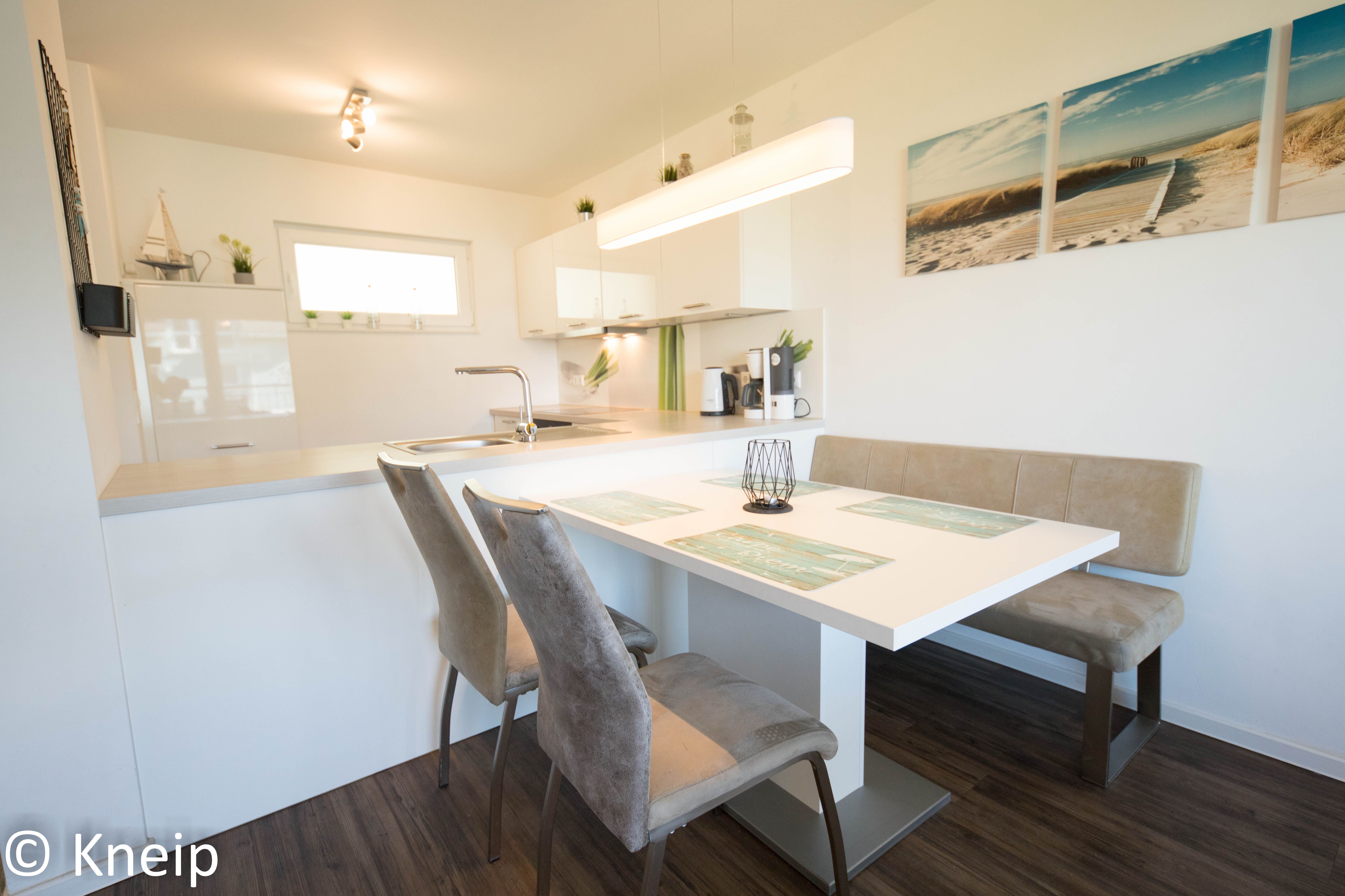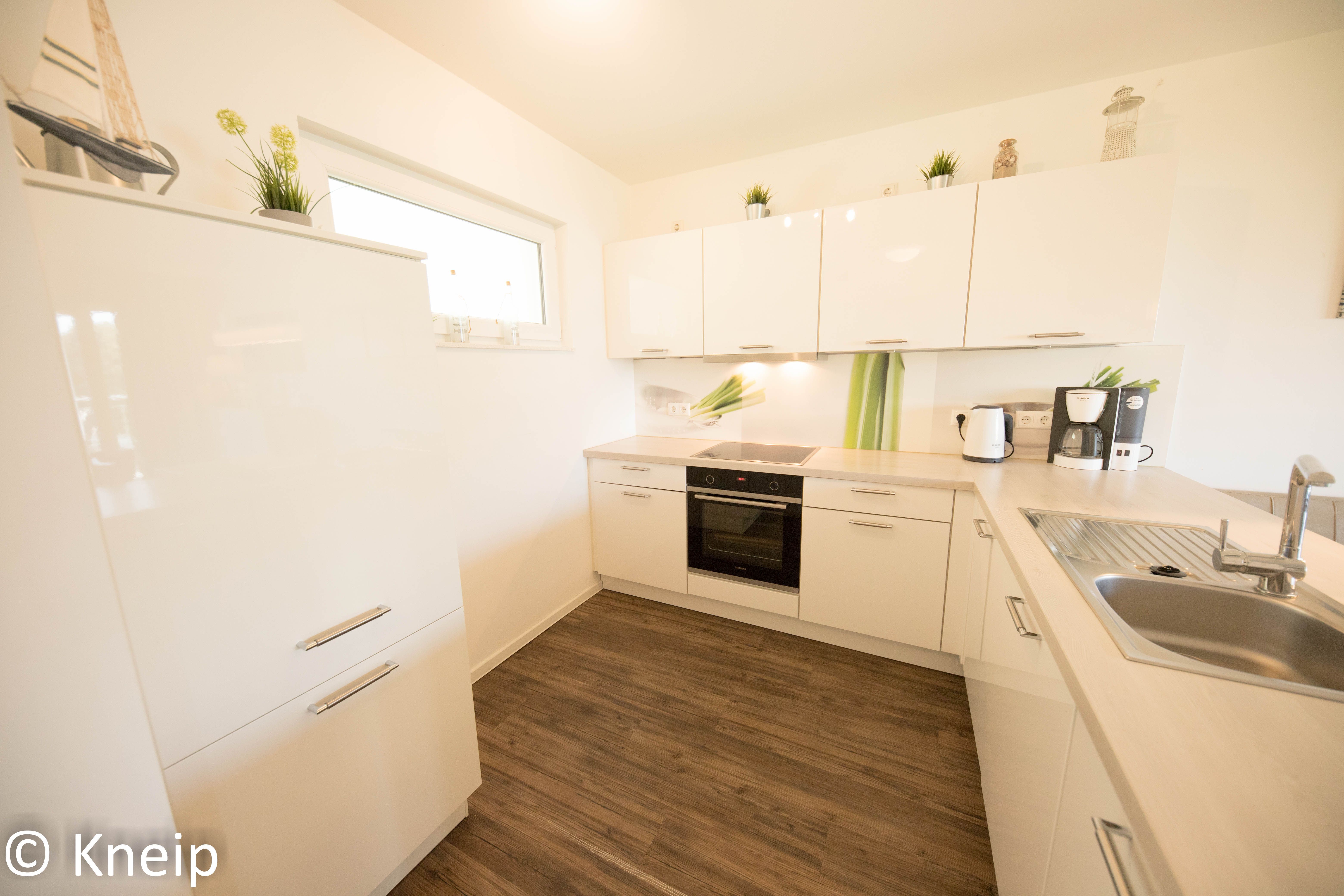 Der Küchenbereich ist modern offen zum Wohn-Essbereich gehalten und mit einer hochwertigen Einbauküche ausgestattet. Geschirr, Besteck, Gläser sowie Töpfe und Pfanne sind vorhanden. Beachten Sie bitte, dass Gebrauchs- und Verbrauchsmittel wie Spülmaschinen Tabs, WC-Papier etc. nur als Starterpaket vorhanden sind und nicht zur Ausstattung gehören, diese sind bitte von Ihnen mitzubringen.