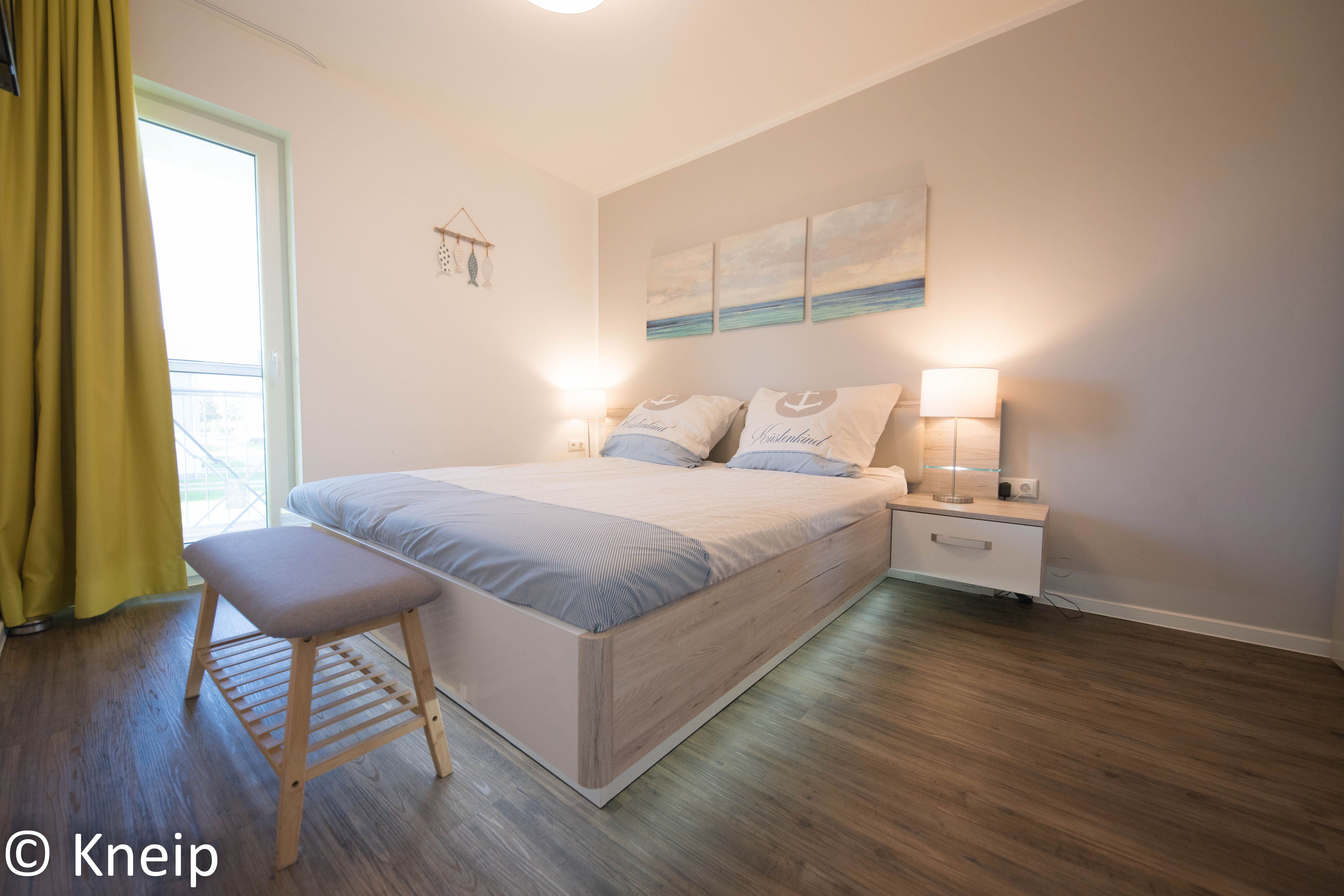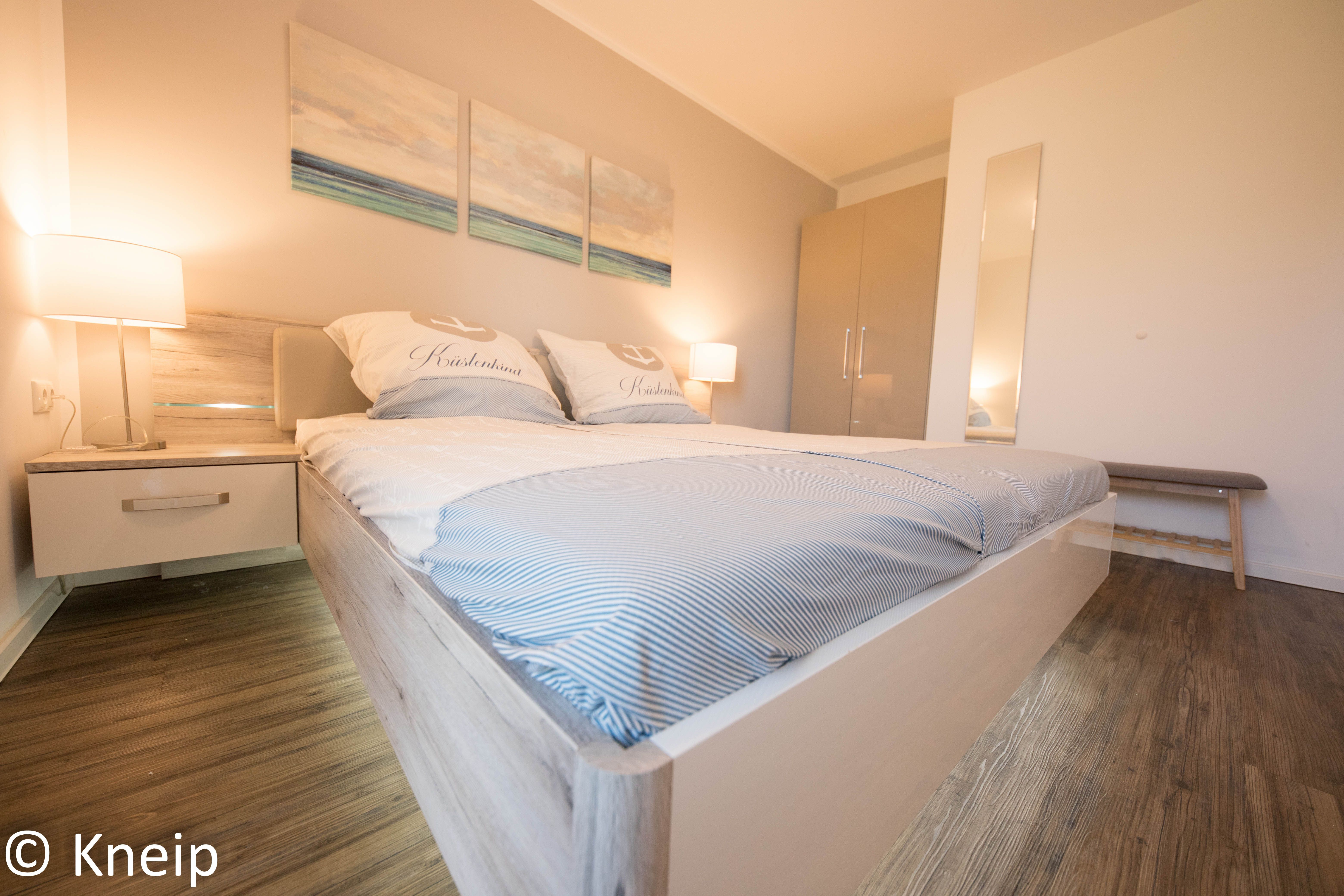 Im Schlafzimmer steht Ihnen ein modernes Doppelbett mit Nachtkonsolen und ein Kleiderschrank zur Verfügung. Die Einrichtung ist modern und hochwertig, Lichtquellen setzen hier Ihre Akzente. Ein weiterer Fernseher steht hier zur Verfügung.
