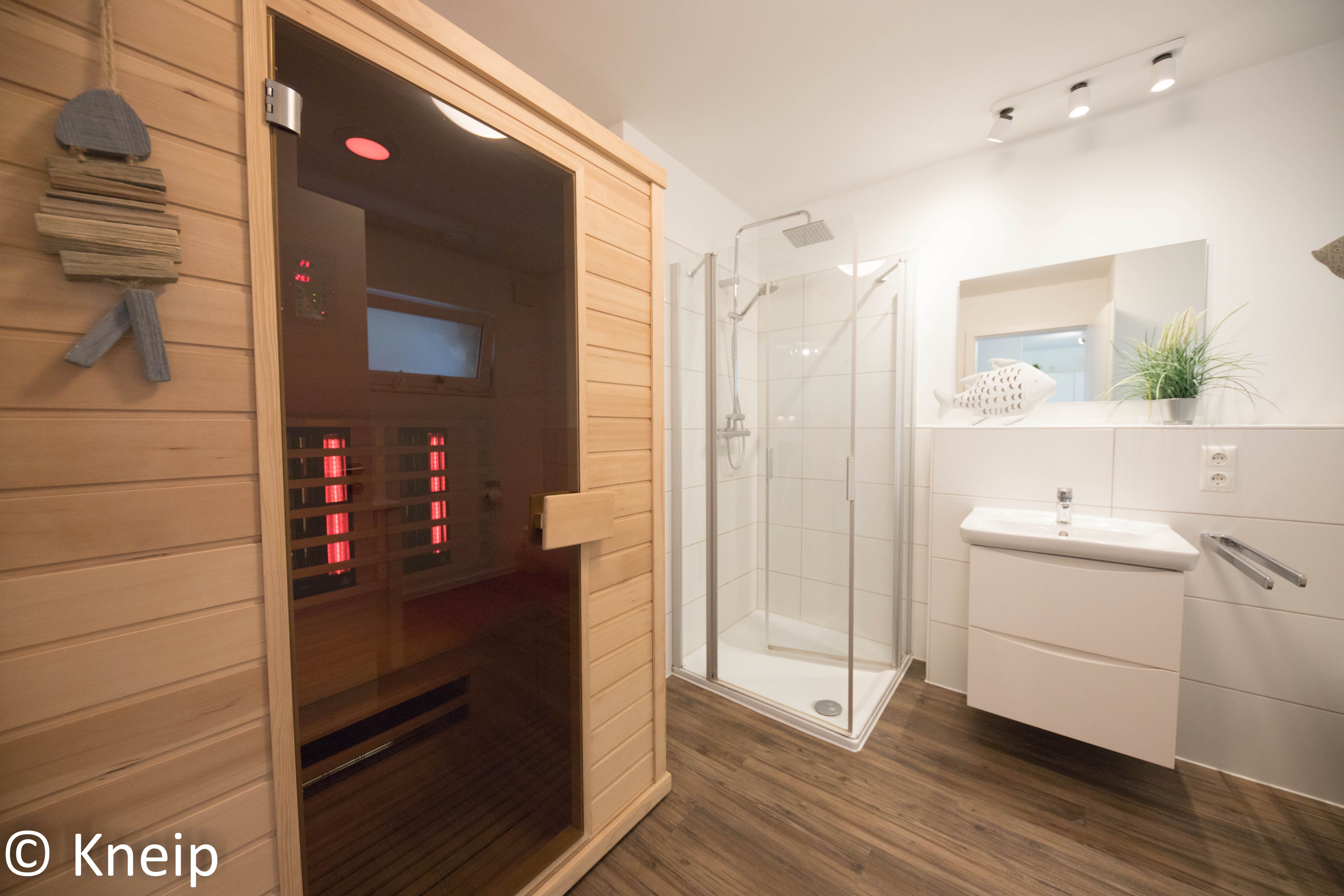 Das Bad als Wellnessoase! Das Badezimmer ist sehr großzügig geschnitten und mit einer modernen Dusche und einer Infrarotkabine ausgestattet. Hier können Sie bei jedem Wetter die Seele baumeln lassen.