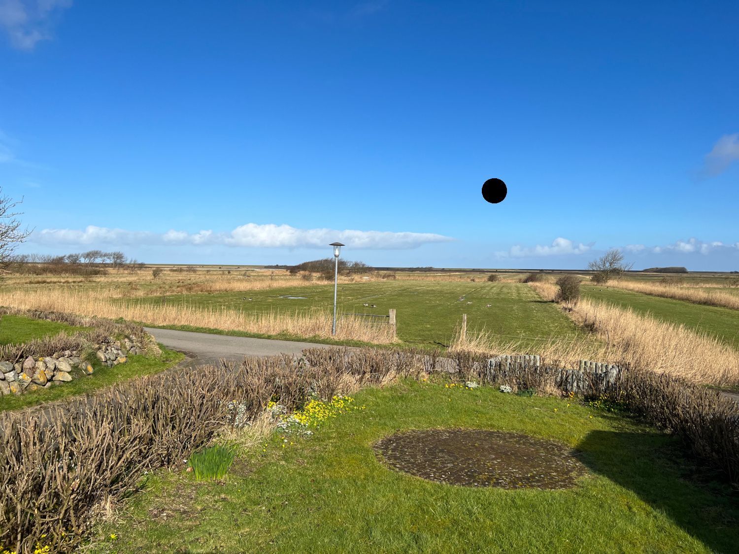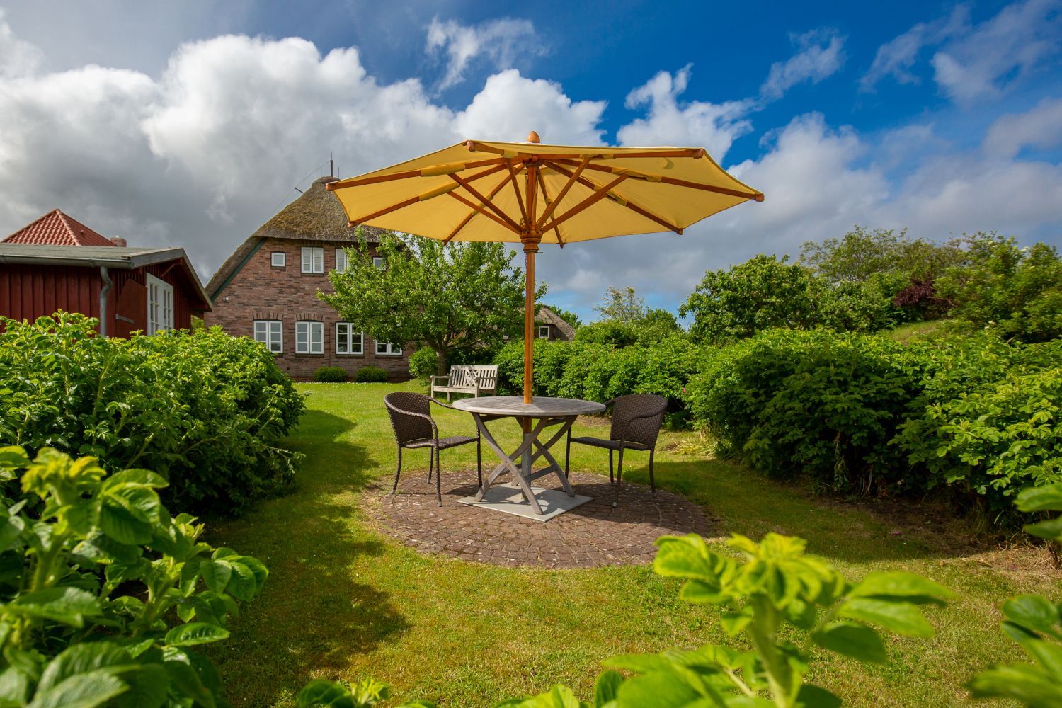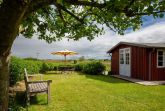 Der Garten ist umgeben von einem mit Heckenrosen bewachsenem Friesenwall und bietet freien Blick in die Marsch. Auf den bequemen Gartenmöbeln mit Polstern kann man es sich in der Sonne gemütlich machen