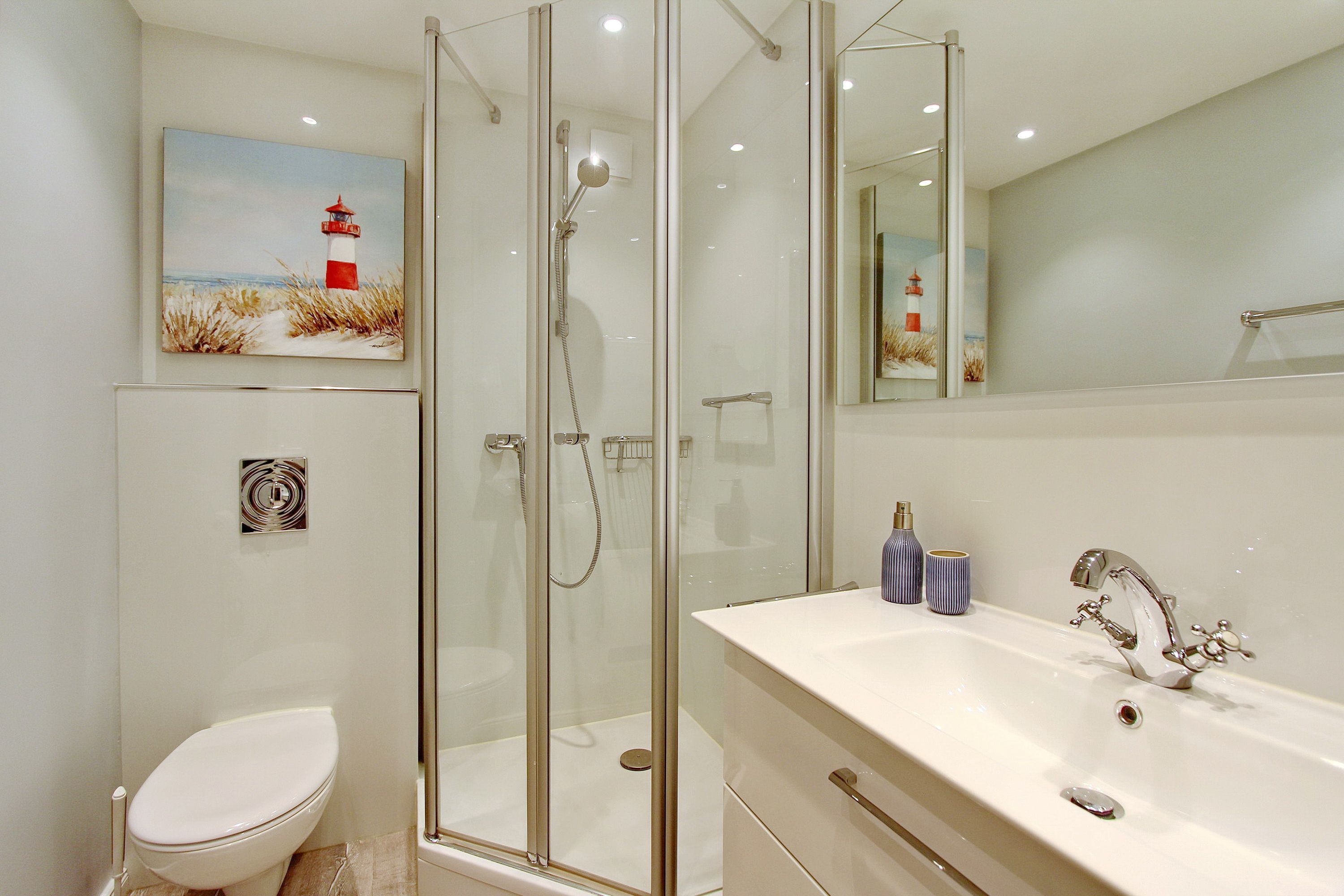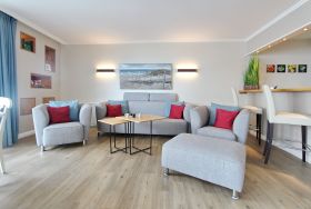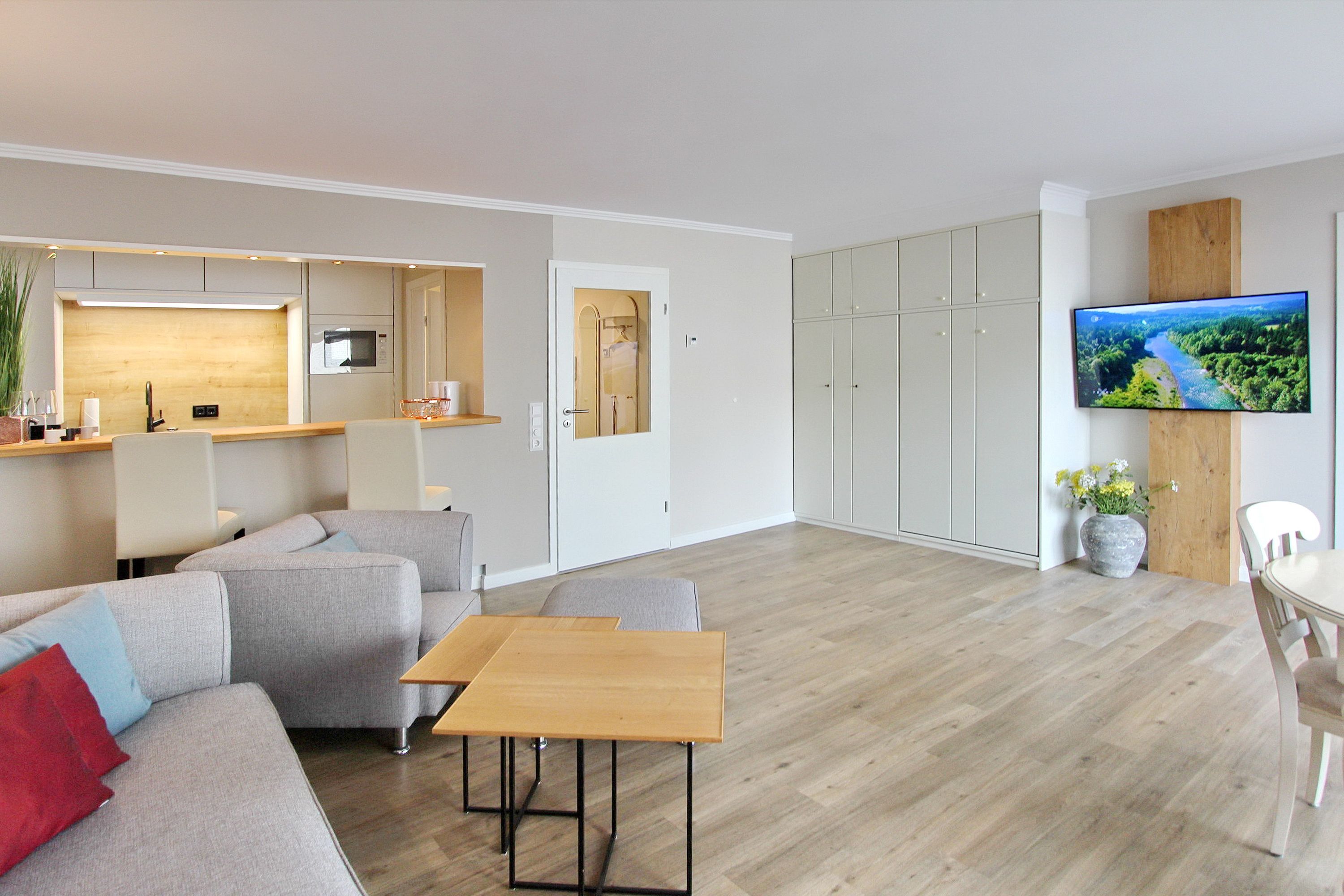Sehr gemütlich eingerichtete 2-Zimmer-Wohnung im Herzen der Inselmetropole Westerland mit Blick auf die Nordsee - direkt an der Fußgängerzone Strandstraße gelegen und in unmittelbarer Nähe des Strandübergangs Strandstraße zur Promenade. Das Appartement im Haus Westerhörn befindet sich in der 3. Etage mit Balkon zur Nordseite - von hier genießen Sie den Blick die Strandstraße hoch auf die Nordsee. Der Wohnraum ist mit einer großen Couchgarnitur mit 2 Sesseln und einem Fußhocker und einem Essplatz mit 3 Stühlen am Fenster und einem Einzelschrankbett ausgestattet. Die Küchenzeile ist im Wohnraum integriert und durch einem offenen Tresen etwas abgeteilt. - hier finden Sie ein Cerankochfeld, eine Mikrowelle und ein Geschirrspüler. Das, vom Wohnraum abgehende, Schlafzimmer verfügt über ein gemütliches Boxspringbett (1,6 m x 2,00 m). Duschbad/WC mit Halbrunddusche. Zur technischen Ausstattung gehört ein Smart-TV und ein Radio. Den kostenfreien WLAN Zugang des Eigentümers können Sie nutzen (die Zugangsdaten finden Sie im App.). Wohnungsgröße 54 m². Nichtraucherwohnung.