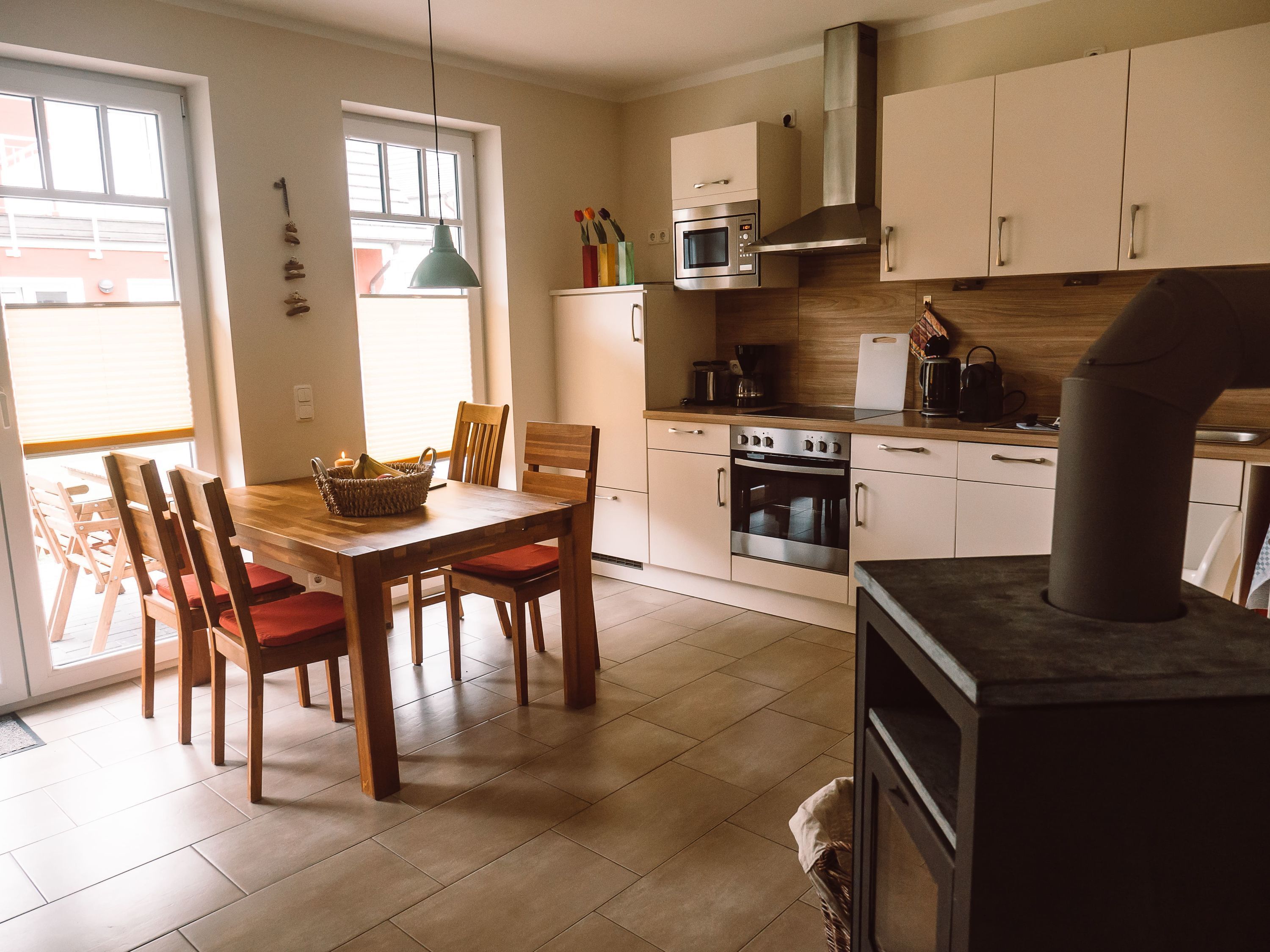 Vom geräumigen Eingangsbereich aus betreten Sie das komplett geflieste Badezimmer mit einer modernen, bodengleichen Dusche, einem WC und einem stilvollen Waschbecken. Im großzügigen Schlafzimmer erwartet Sie ein komfortables Doppelbett (180 x 200 cm) sowie ein geräumiger Kleiderschrank, um all Ihre Sachen unterzubringen. Für Gäste im zweiten Schlafzimmer haben wir ein Ausziehbett (ebene Liegefläche von 160 x 200 cm) und eine große Kommode als Stauraum bereitgestellt. Und auch Ihre Kleinsten haben wir nicht vergessen! Ein Reisebabybett (ohne Matratze) und ein Kinderhochstuhl stehen zur Verfügung. In unserem behaglichen Wohnbereich können Sie entspannte Stunden verbringen. Neben einem Flachbildfernseher, DVD-Player und Stereoanlage sorgt ein Kaminofen für wohlige Wärme in den kühleren Jahreszeiten (Kaminholz wird nicht gestellt.) Die hochwertige, offene Wohnküche bietet Ihnen alles, was Sie benötigen, einschließlich Herd mit Cerankochfeld, Umluftbackofen, Geschirrspülmaschine, Mikrowelle und Kühlschrank inklusive Gefrierfach. Vom Wohn-Essbereich aus gelangen Sie direkt auf unsere großzügige und teilweise überdachte Terrasse. Dort stehen Ihnen Terrassenmöbel inklusive Sonnenschirm zur Verfügung, damit Sie die Natur in vollen Zügen genießen können. Unsere angrenzende, große Rasen- und Liegefläche ist der ideale Ort für Entspannung der Eltern und Spielspaß für die Kinder.