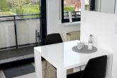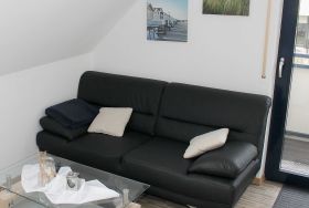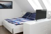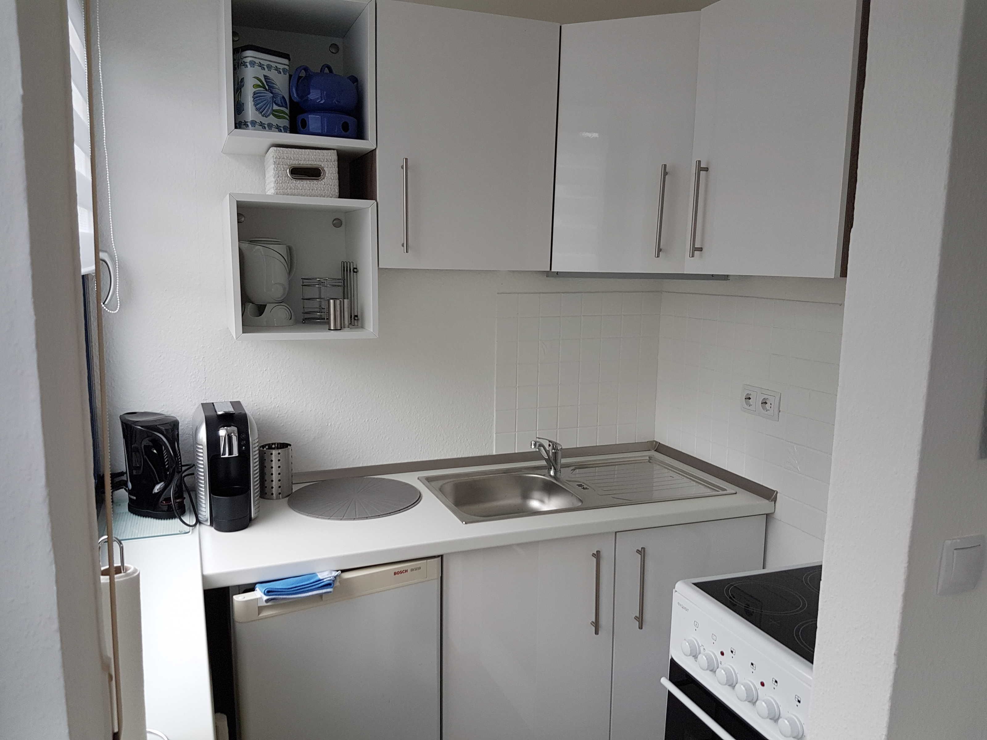 Die Wohnung befindet sich im 1.OG eines gepflegten 3 Familienhauses. Der kombinierte Wohn - Schlafraum verfügt über 1 Doppelbett 1,60 m breit, Couch, Esstisch für 2 Personen. Das Sideboard mit Flachbildschirm stellt eine kleine Trennung   Zwischen Wohnen & Schlafen da. Den Fernseher kann man sowohl zum Schlaf -als auch zum Wohnbereich ausrichten. Die separate Kochecke verfügt über einen Kühlschrank mit kleinem Gefrierteil, 4 Flammen Ceran Kochfeld und Backofen, Spülmaschine. Küchenutensilien des täglichen Bedarfs, Wasserkocher, Toaster, Kaffeemaschine etc. sind selbstverständlich ausreichend vorhanden. Das Tageslichtbad ist hell, freundlich mit einer Dusche ausgestattet.  Ein Parkplatz gehört zur Ferienwohnung, ebenso ein Abstellraum für Fahrräder.