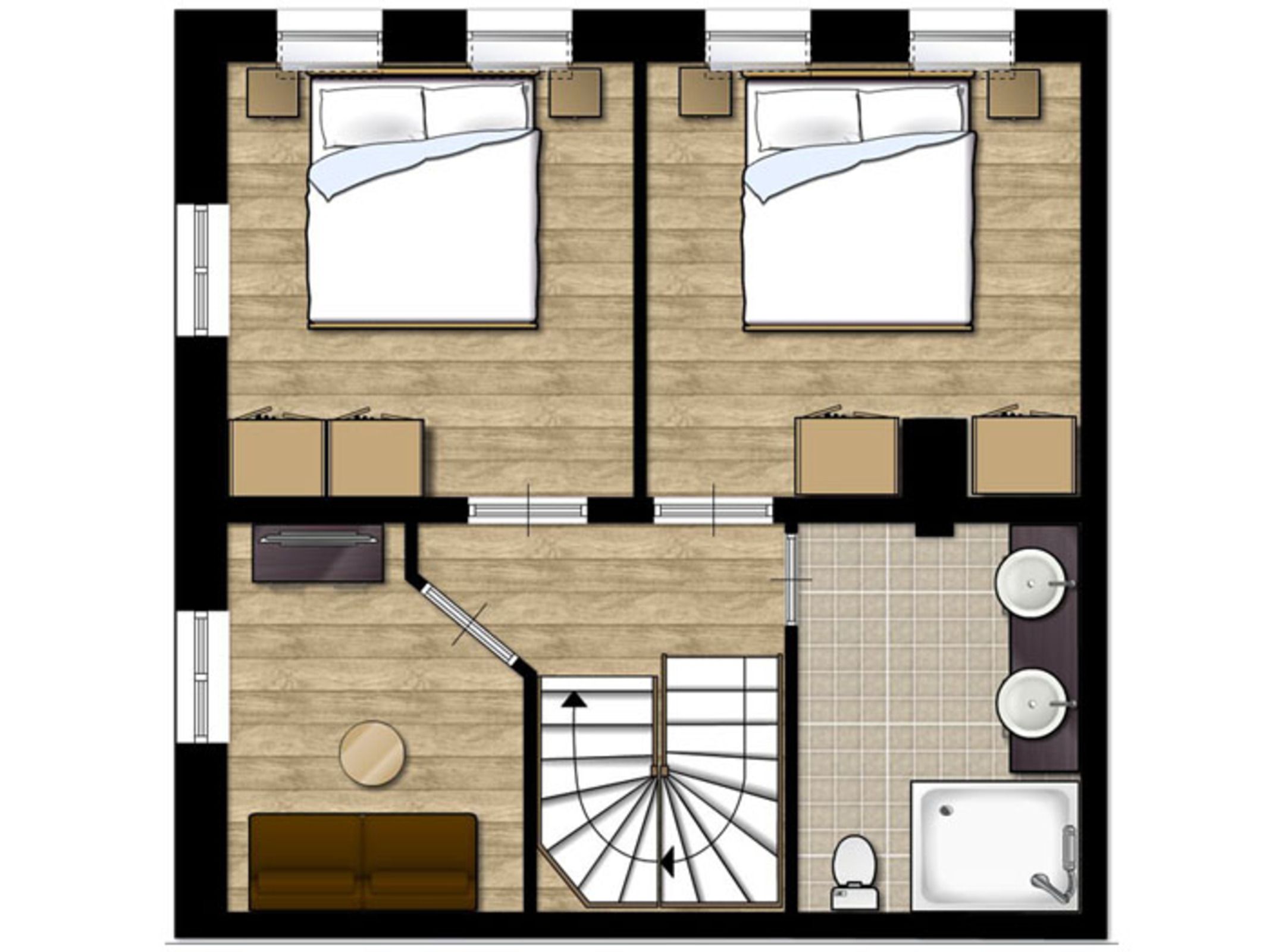 Die großzügige Suite umfasst zwei Etagen und verfügt über zwei Schlafzimmer.