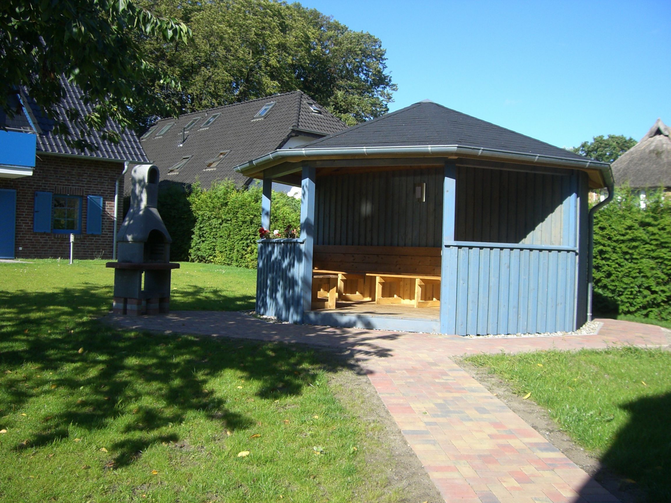 Auf dem weitläufigen Grundstück befinden sich zwei baugleiche Ferienhäuser. In der Ferienwohnung Nummer 7 befindet sich ebenerdig der Flur, ein Wohnraum mit Zugang zur Terrasse, 2 Schlafzimmer und ein Bad mit Fenster, Badewanne, Dusche und WC. Auf dem Grundstück befinden sich noch ein Grillplatz mit Pavillon und ein kleiner Spielplatz. Es gibt einen abschließbaren Fahrradschuppen. Der PKW-Stellplatz befindet sich direkt vor dem Haus.