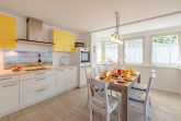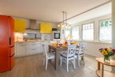 Die helle offene Küche ist komplett mit modernen Geräten und Zubehör von Siemens, Miele, Villeroy & Boch und Co. ausgestattet. Darunter enthalten sind: nutzerfreundliches Induktionskochfeld, Backofen auf Augenhöhe und mit Schienen, Dunstabzugshaube, Spülmaschine, großen Kühlschrank mit geräumigen Gefrierschubladen, Mikrowelle, Toaster, Wasserkocher, Teekanne, Filter-Kaffeemaschine, Tassimo-Kaffeemaschine, Handmixer, Eierkocher und Eierbecher, Küchenutensilien, Teller, Schüsseln, Gläser in sämtlichen Ausführungen von Sektflöten über Weingläser, Whisky-Gläser bis hin zu Grappa Gläsern.