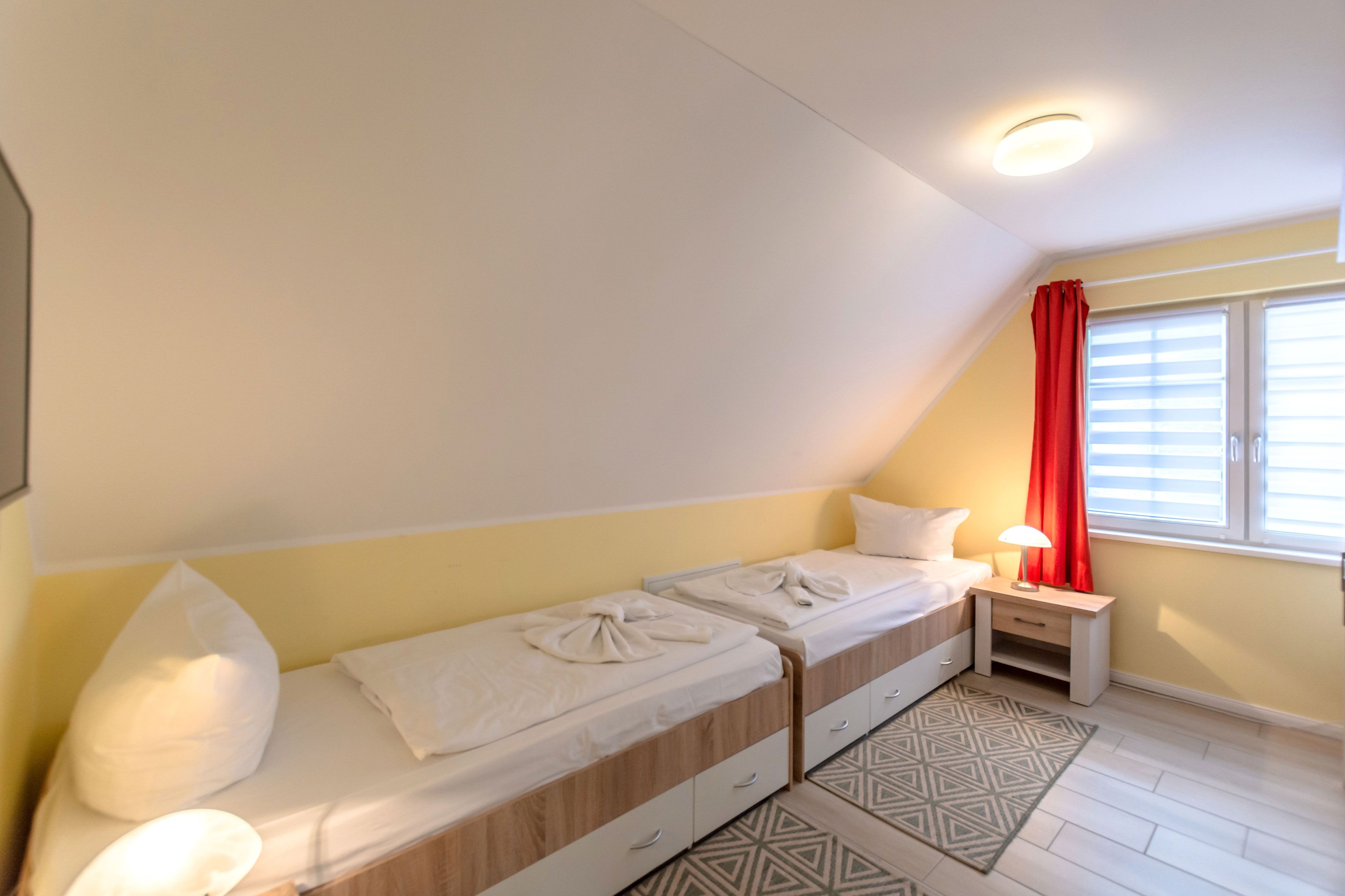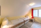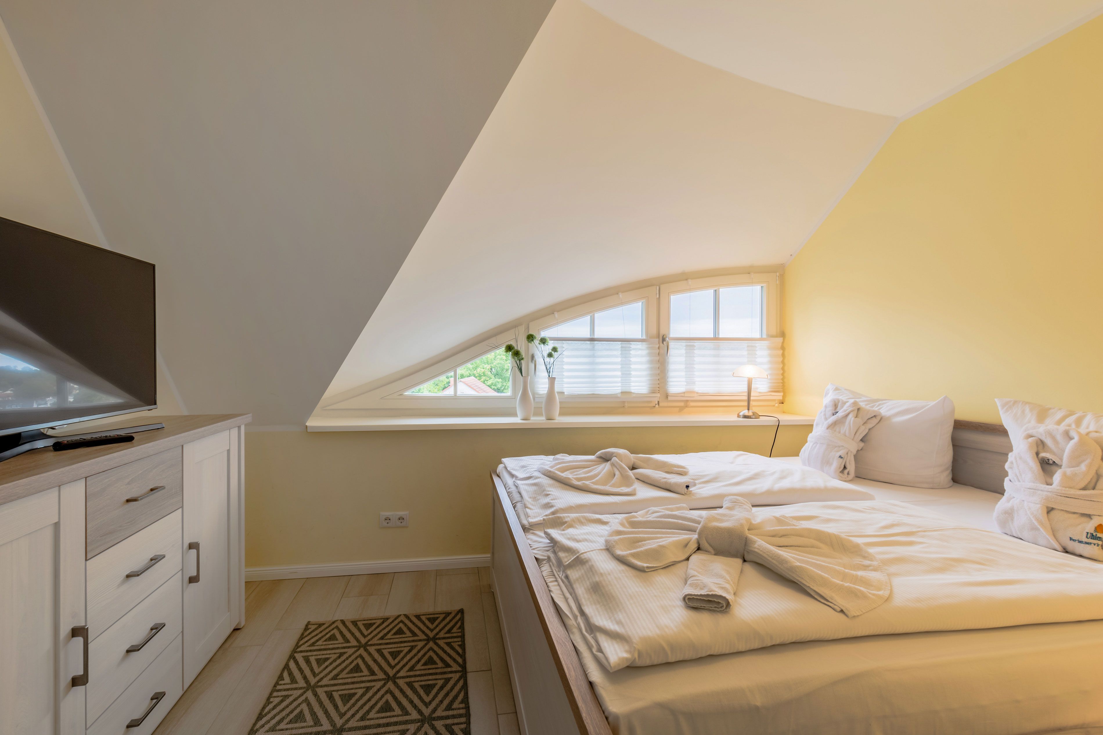 Angrenzend sind drei Schlafzimmer. Das erste Schlafzimmer besteht aus Doppelbett, Kommode, Drehspiegel- und Regal, Nachttischkästchen und TV. Das zweite Schlafzimmer besteht aus Doppelbett, zwei Kleiderschränken, zwei Nachttischkästchen und einer Kommode. Das dritte Schlafzimmer besteht aus zwei Einzelbetten, zwei Kleiderschränken, zwei Nachttischkästchen und TV. Letzteres ist ideal für Freunde oder Kinder. Alle Betten verfügen über eine Vierjahreszeitenbettdecke und Lattenroste die auf Härtegrad und Kopfneigung individuell und leicht einstellbar sind.