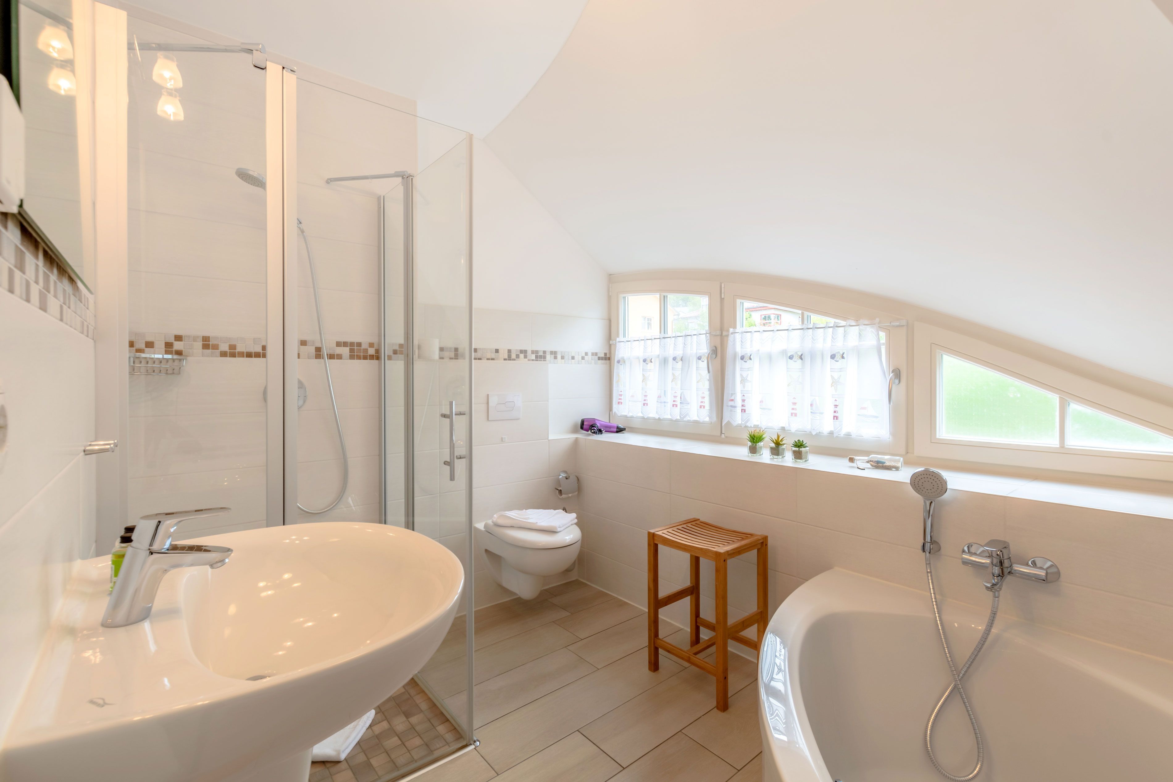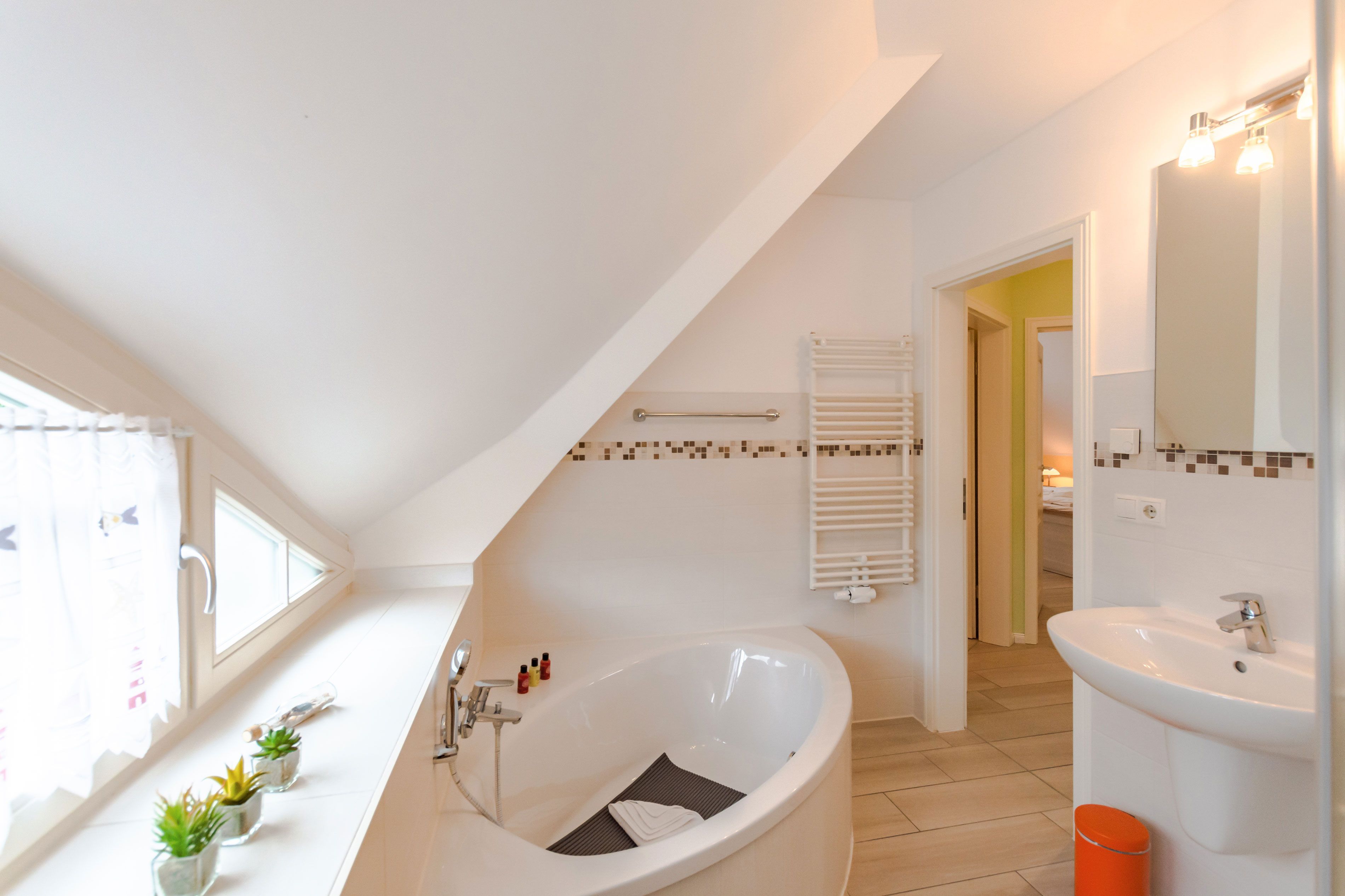 Im Obergeschoss ist ein weiteres Bad mit Fenster, ebenerdiger Dusche, WC und zusätzlich eine Eckbadewanne und Handtuchtrockner.