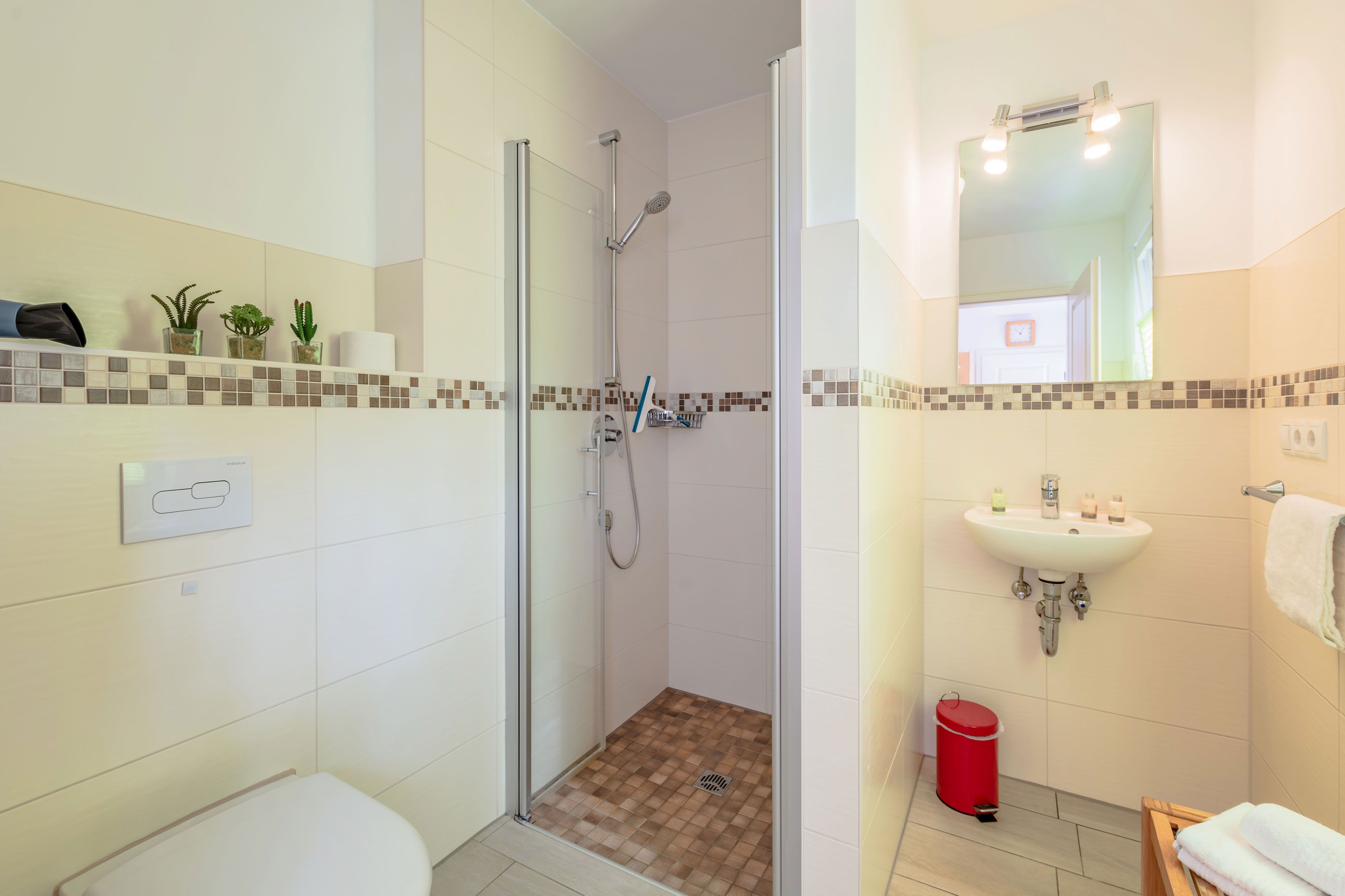 Im Erdgeschoss befindet sich ein Flur mit Garderobe und Schuhregal, der großzügig geschnittene Wohn- und Essbereich mit angrenzender Küche, ein Badezimmer mit Fenster, WC und ebenerdiger Dusche, eine sonnige Terrasse und ein ruhiger Garten. In den Sommermonaten steht Ihnen als Highlight eine möblierte Terrasse mit Strandkorb zur Verfügung.