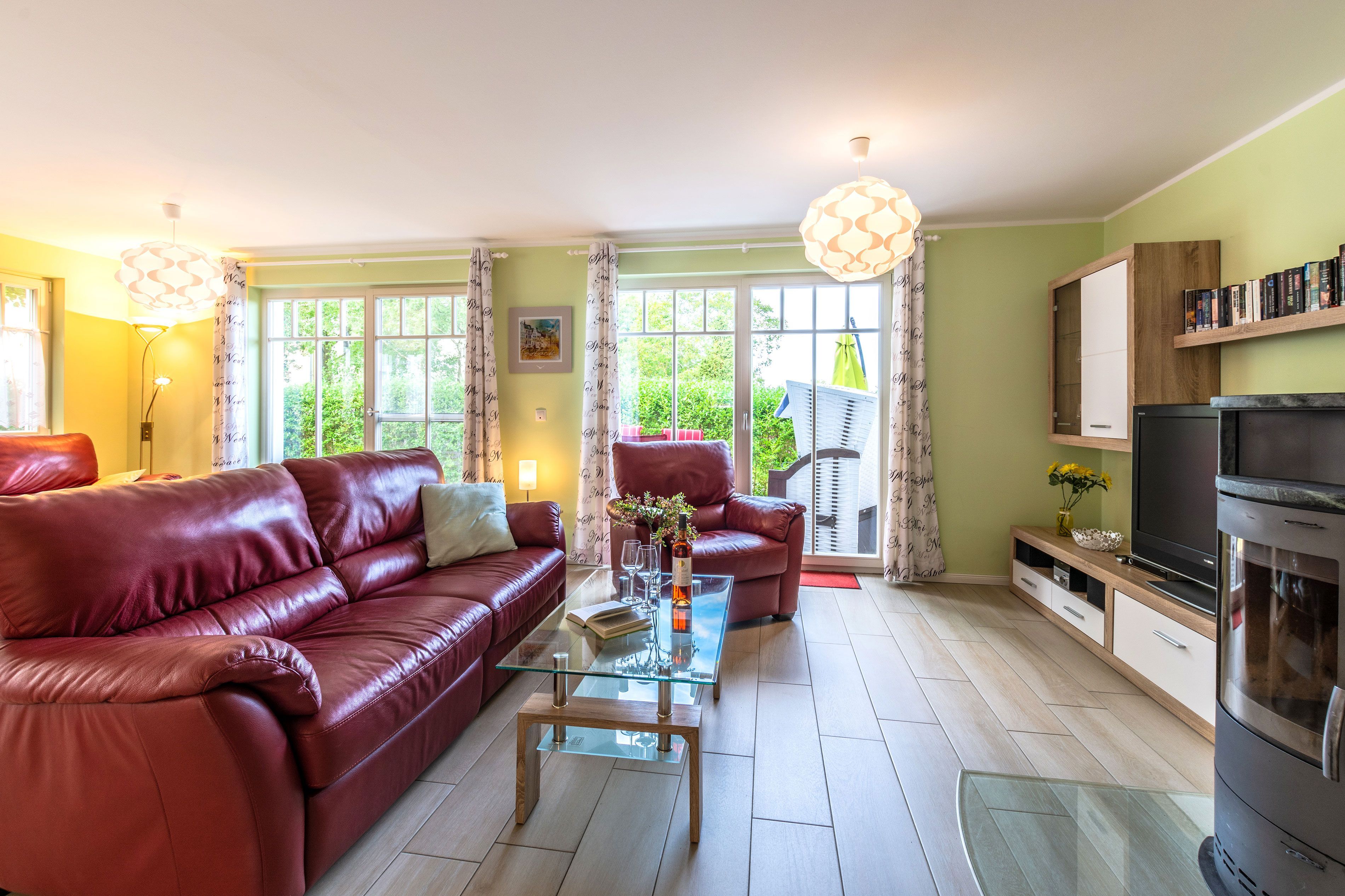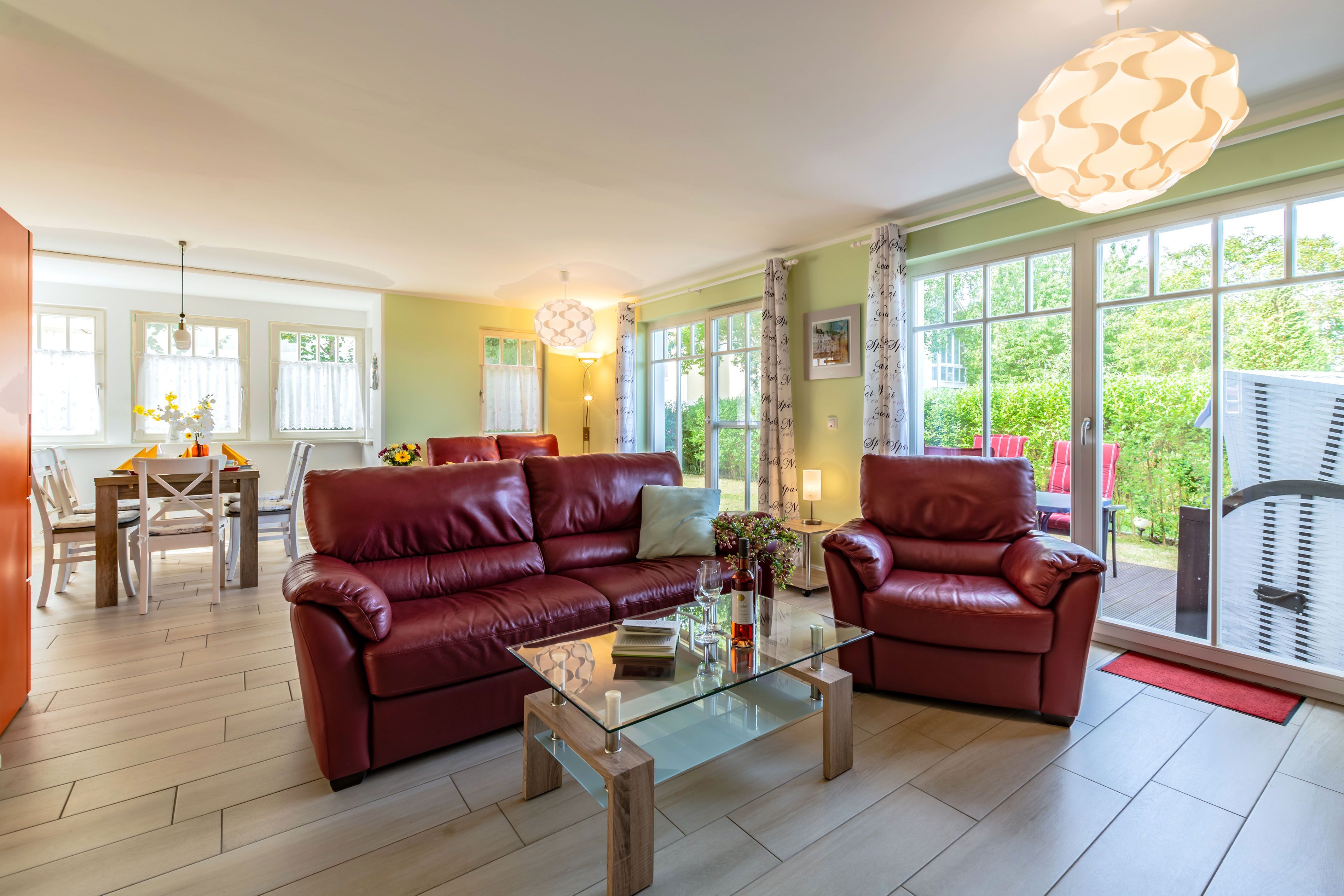Der Wohnraum verfügt über einen gemütlichen Sitzbereich aus hochwertigen Ledersofas und Ledersessel für bis zu sechs Personen.