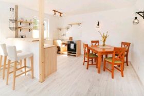 Das Objekt in dem sich die Wohnung befindet, ist ein ehemaliger Ferienpark, den wir vor drei Jahren übernommen haben und in das wir viel Zeit und Arbeit gesteckt haben. Im Zuge dessen haben wir auch diese Wohnung liebevoll umgestaltet. Sie bietet ein offenen Wohn-, Ess- und Küchenbereich, ein Schlafzimmer und ein Badezimmer mit Dusche.