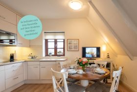 Wohn-/Koch-/Essbereich: Gemütlicher Wohnbereich mit Sofaecke und Rattansessel lädt zum Verweilen ein. Die offene und gut ausgestattete Küche wird perfekt von einem runden Esstisch mit Platz für 4 Personen zum Wohnbereich abgegrenzt.