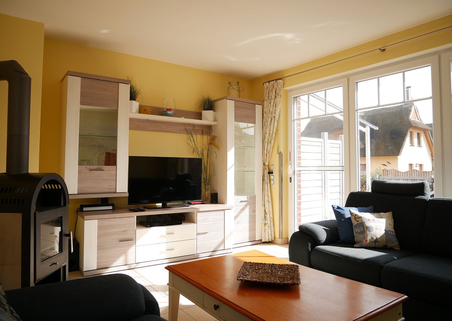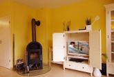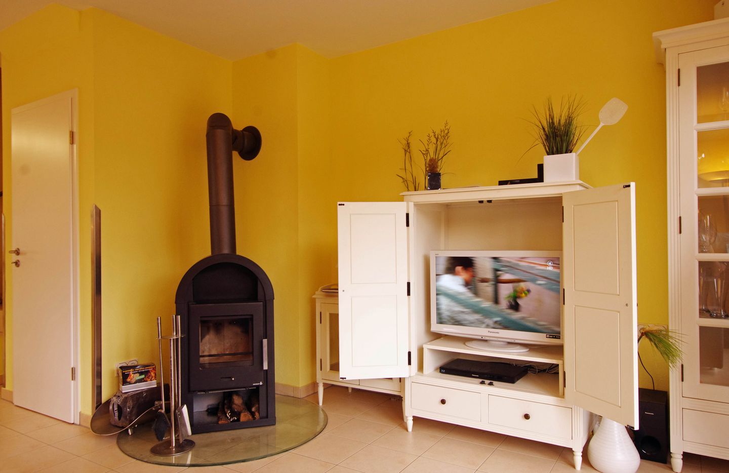 Im kombinierten Wohn- und Essbereich finden Sie eine gemütliche Sofaecke mit einem Fernseher für unterhaltsame Abende. Eine Auswahl an Büchern und ein Radio stehen ebenfalls zur Verfügung, um Ihre Freizeit zu bereichern. Der Kaminofen sorgt für eine behagliche Atmosphäre an kühlen Abenden, während der Esstisch Platz für gesellige Mahlzeiten bietet.