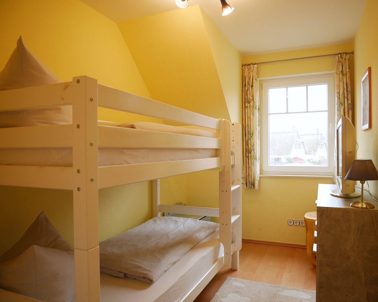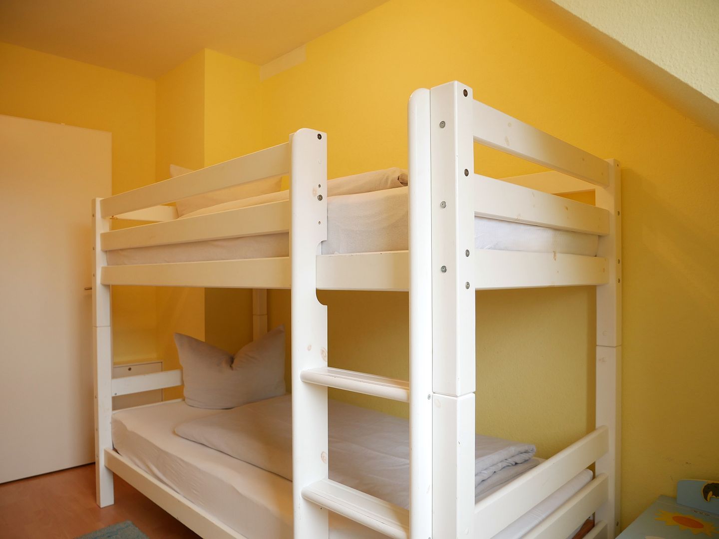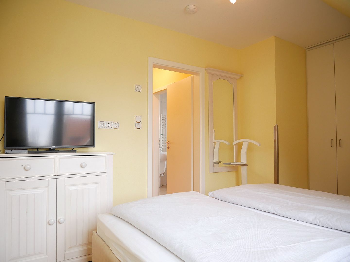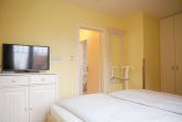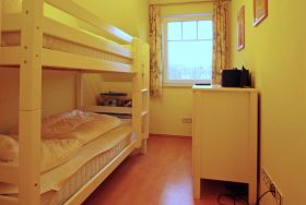 Im ersten Schlafzimmer erwartet Sie ein komfortables Doppelbett, das für erholsame Nächte sorgt. Hier finden Sie auch einen geräumigen Kleiderschrank, um Ihre Urlaubsgarderobe ordentlich zu verstauen. Im zweiten Schlafzimmer wartet ein Etagenbett, das ideal für Kinder oder Freunde ist, die die Ferien gemeinsam verbringen möchten. Das dritte Schlafzimmer bietet ein Bett mit einer ausziehbaren Liegefläche und einen weiteren Kleiderschrank.