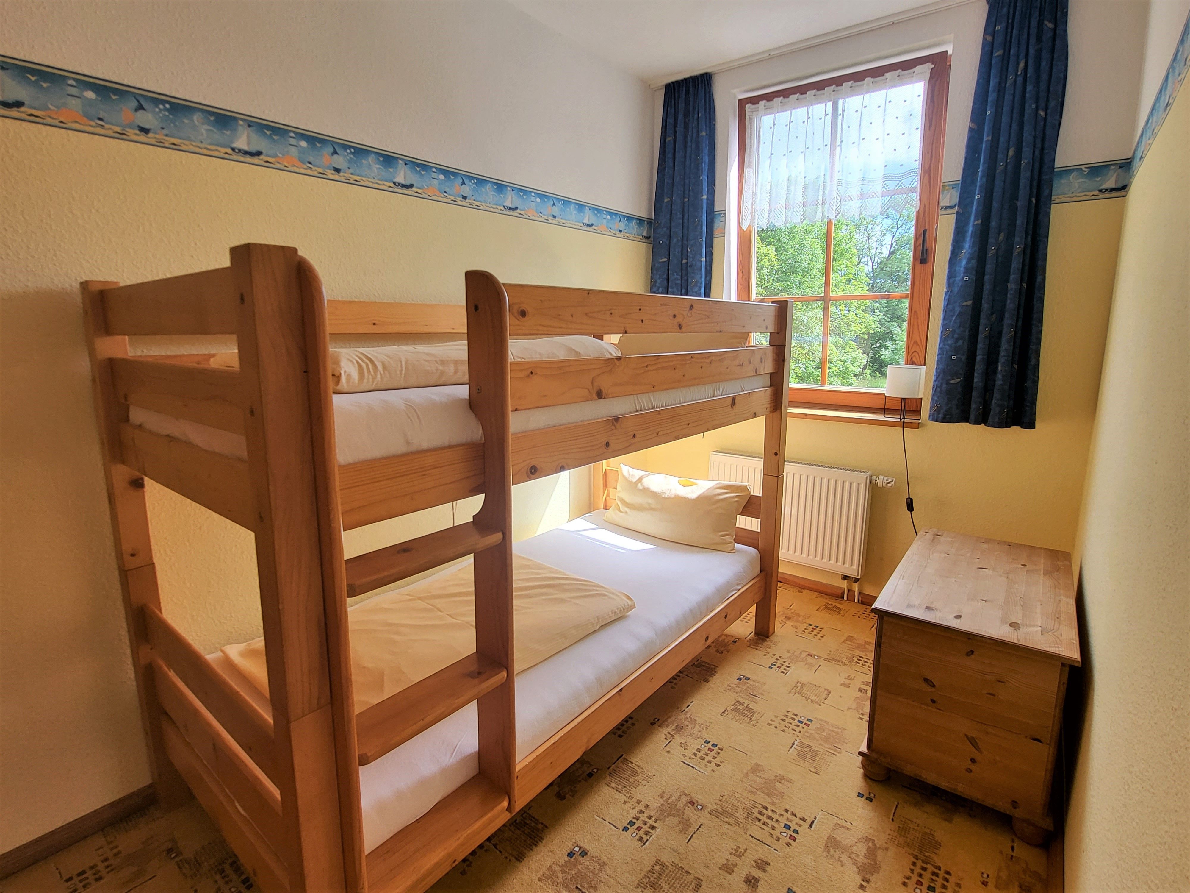 Im Kinderzimmer befindet sich ein Etagenbett und es liegt Teppichboden.