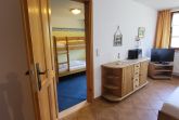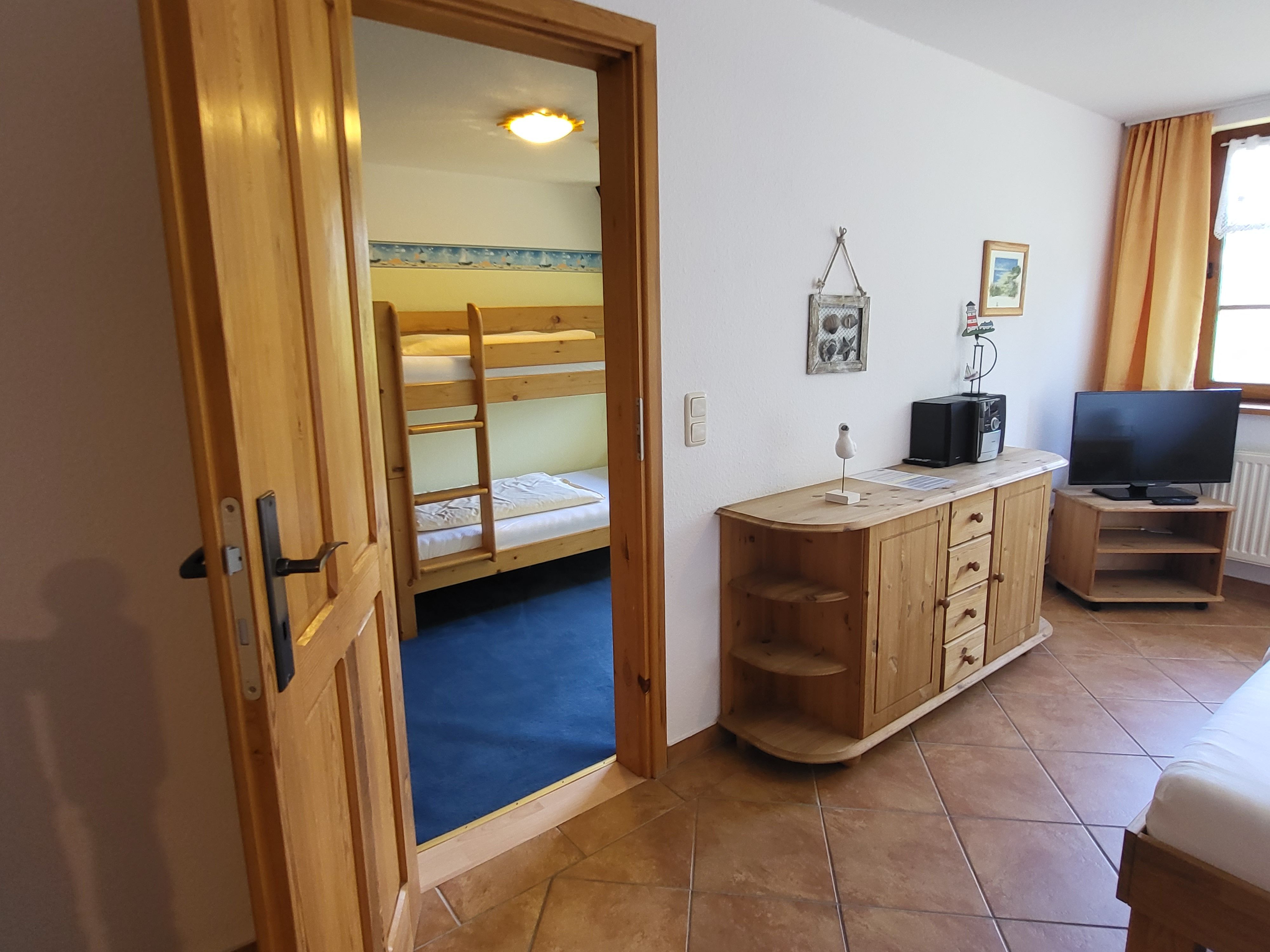 Im Kinderzimmer befindet sich ein Etagenbett und es liegt Teppichboden.