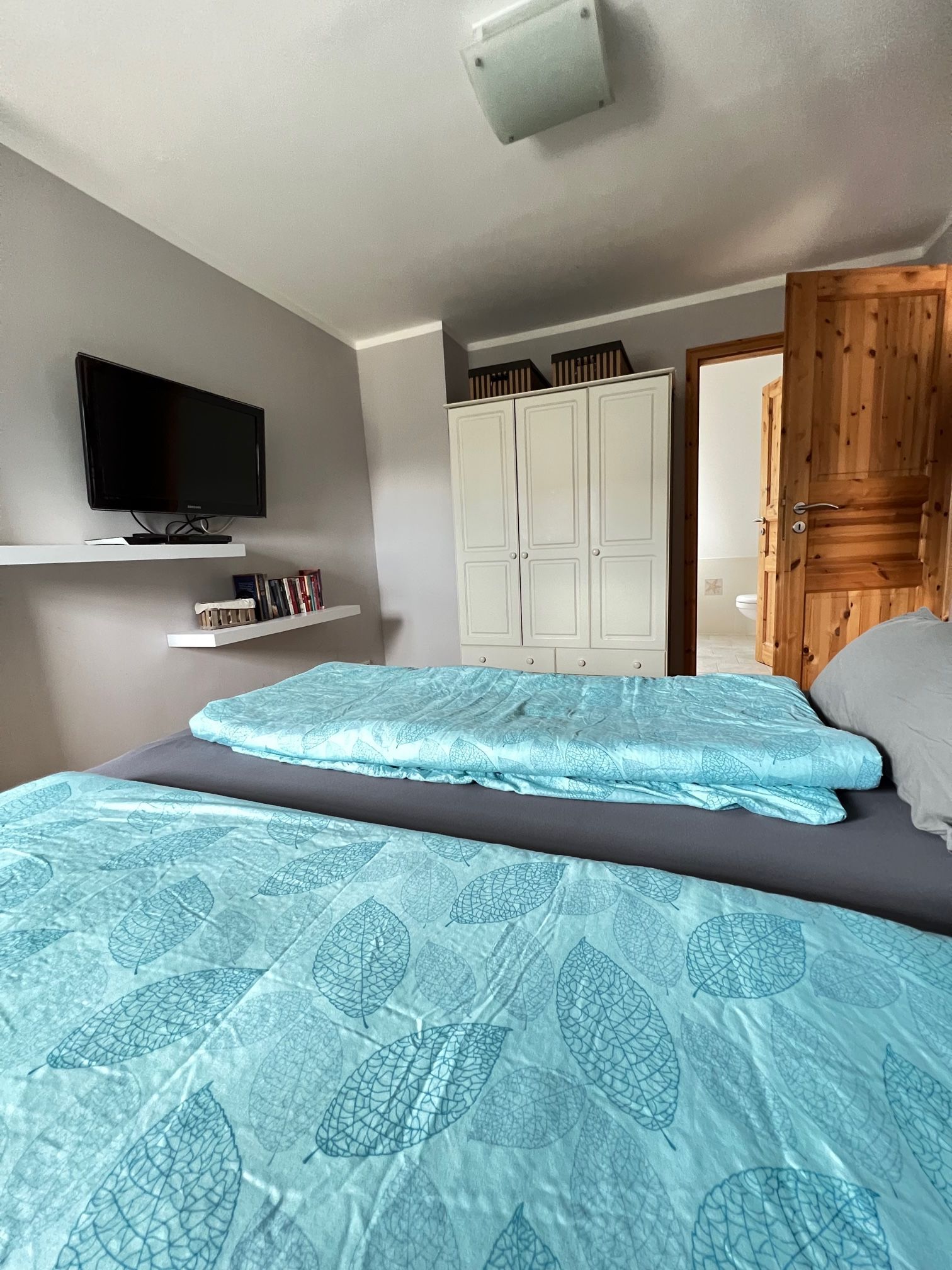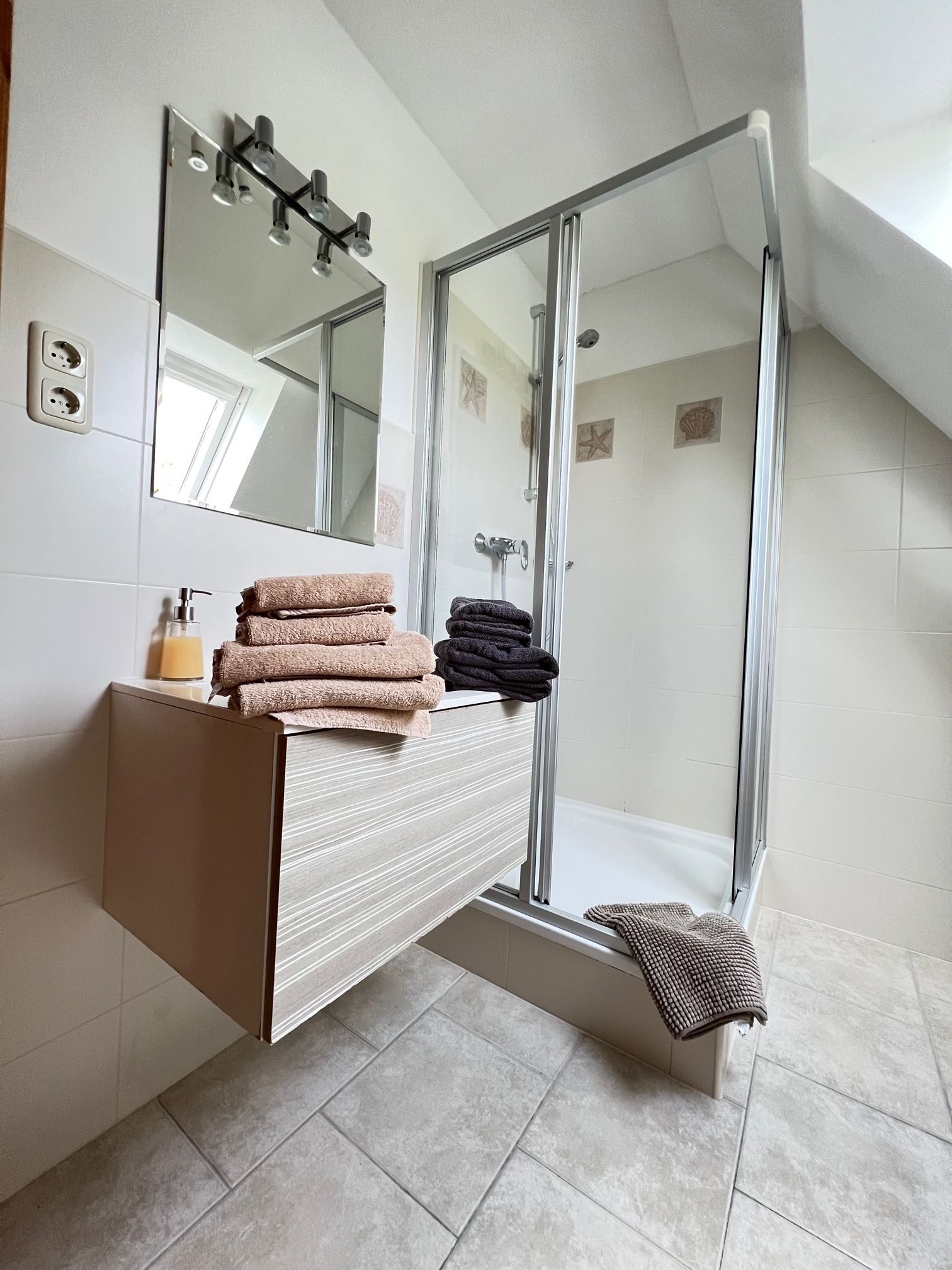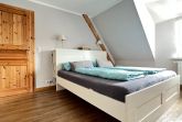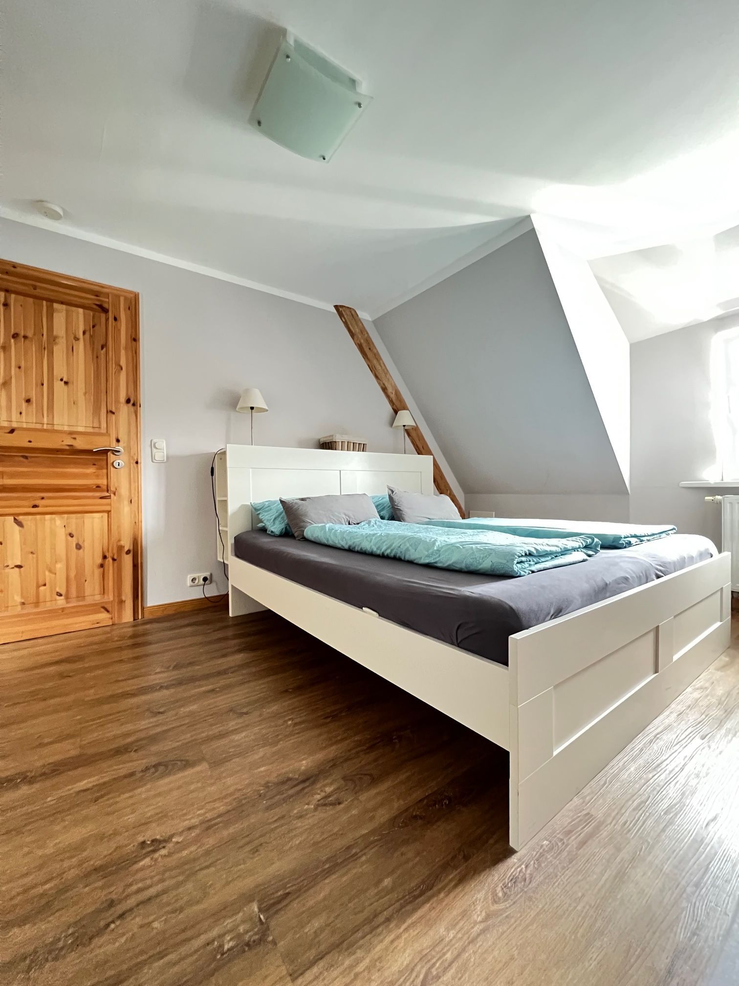 Doppelbett sowie ein Duschbad mit WC. Die Dachschrägen und der Holzdielenboden verleihen der Unterkunft