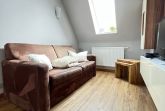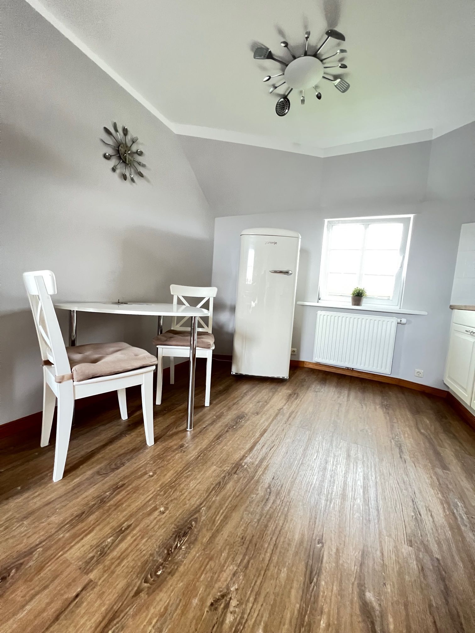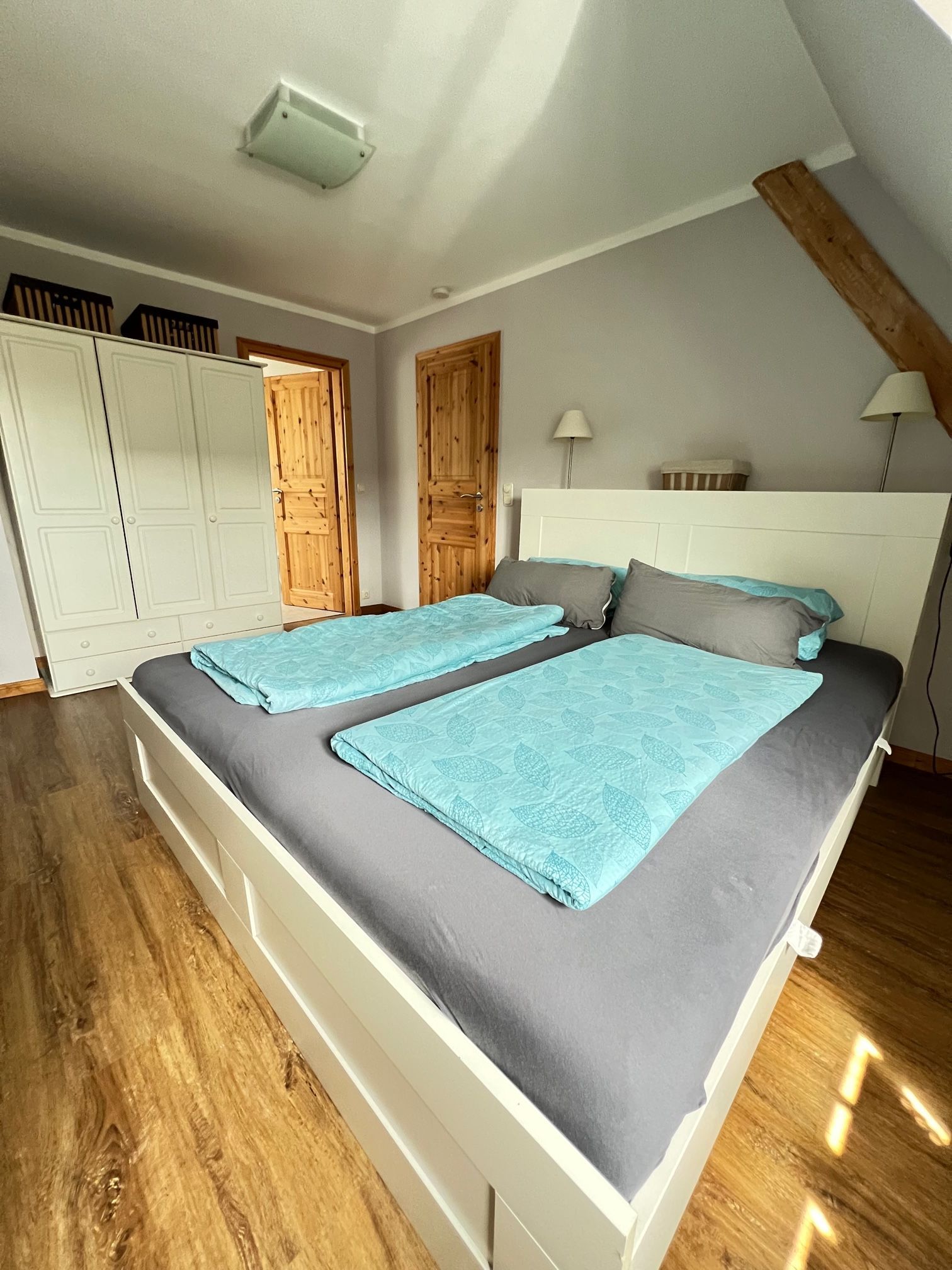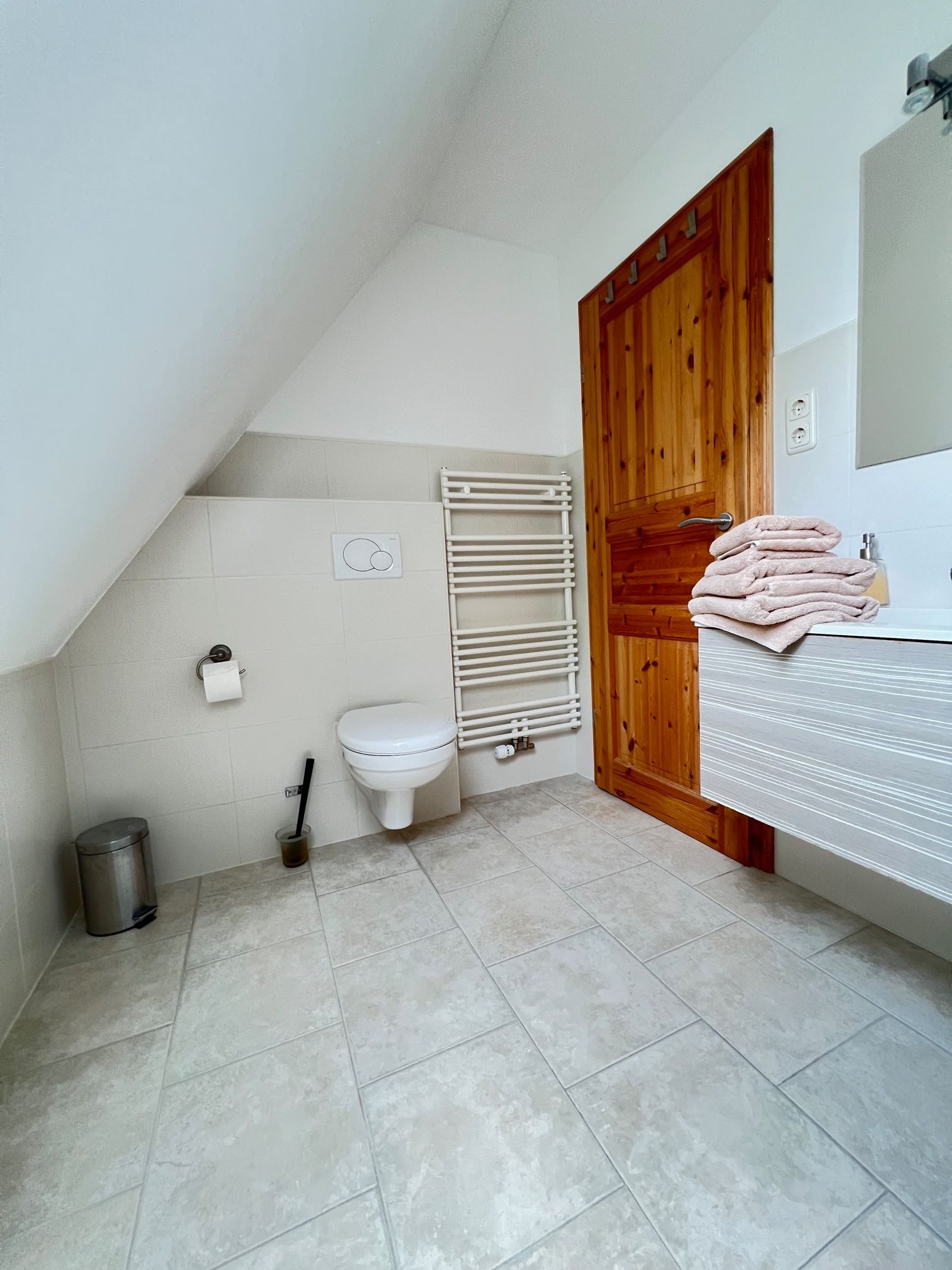 Doppelbett sowie ein Duschbad mit WC. Die Dachschrägen und der Holzdielenboden verleihen der Unterkunft