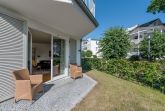 Vom Wohnzimmer aus kommt man auf die Terrasse mit schönen Gartenmöbeln und in den Garten mit seitlichem Ostsee-Blick. Aus dem eigenen Garten und der Wohnung gelangen die Gäste direkt auf die Strandpromenade und an den Strand.