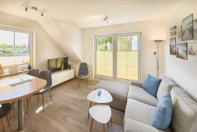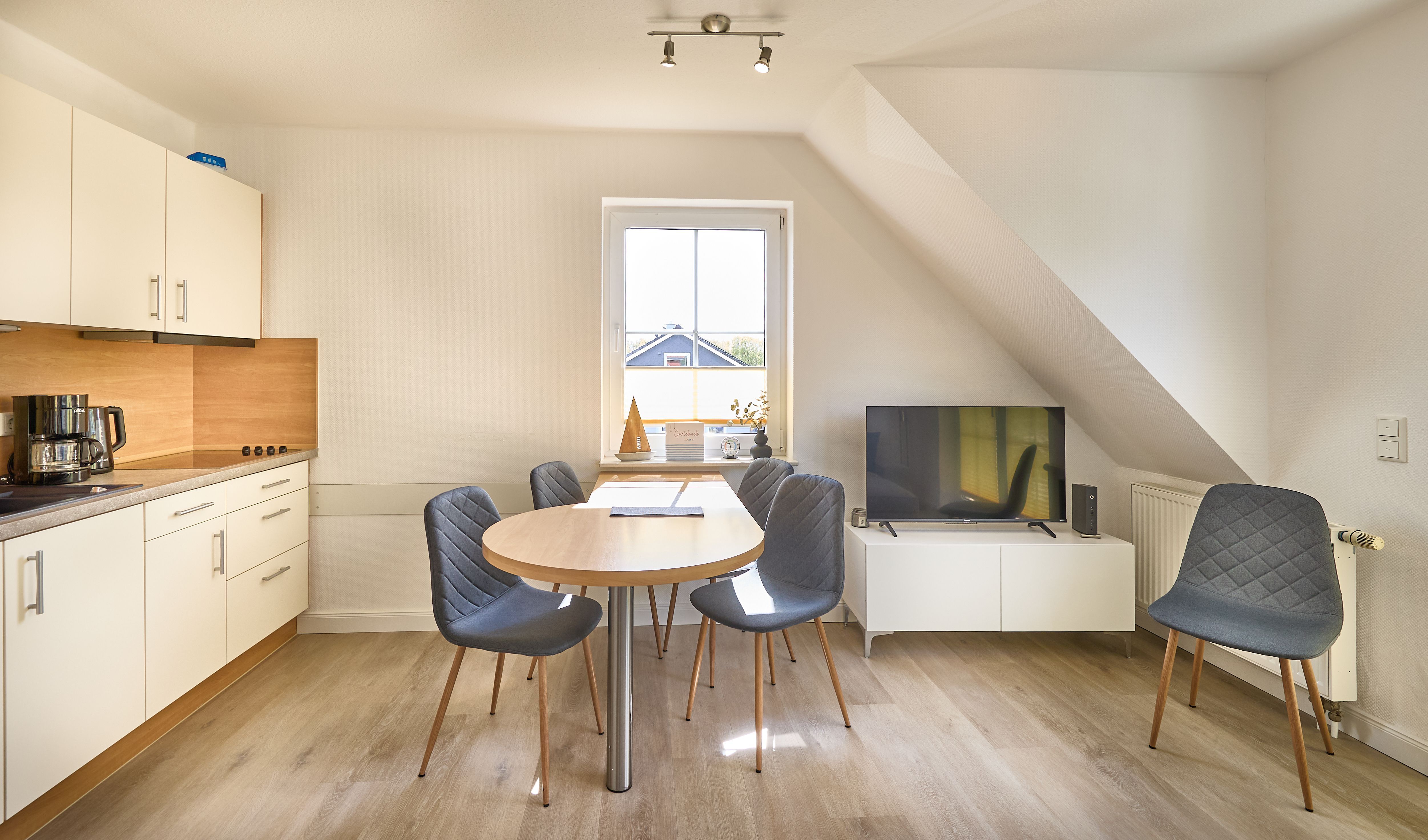 Die geräumige 3-Raum-Ferienwohnung erstreckt sich über ca. 64m² und bietet Platz für bis zu 4 Personen. Sie verfügt über ein separates Schlafzimmer mit einem gemütlichen Doppelbett sowie ein Kinderzimmer mit zwei Einzelbetten im Dachgeschoss. Für die kleinen Gäste gibt es einen speziellen Spielbereich im ausgebauten Dachgeschoss, wo sie sich austoben können.