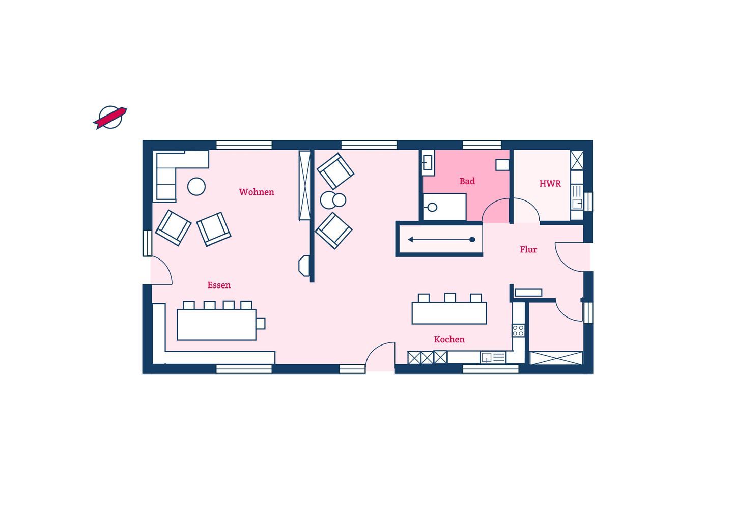Im Erdgeschoss befinden sich der großzügige Wohn- und Essbereich mit offener Küche, ein Gäste-WC sowie ein Hauswirtschaftsraum mit Waschmaschine und Trockner. An kühleren Abenden sorgt der Original Mylin-Kachelofen für eine angenehme Atmosphäre.