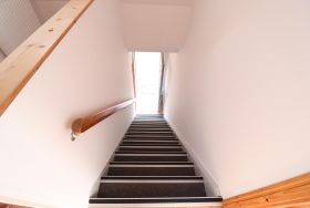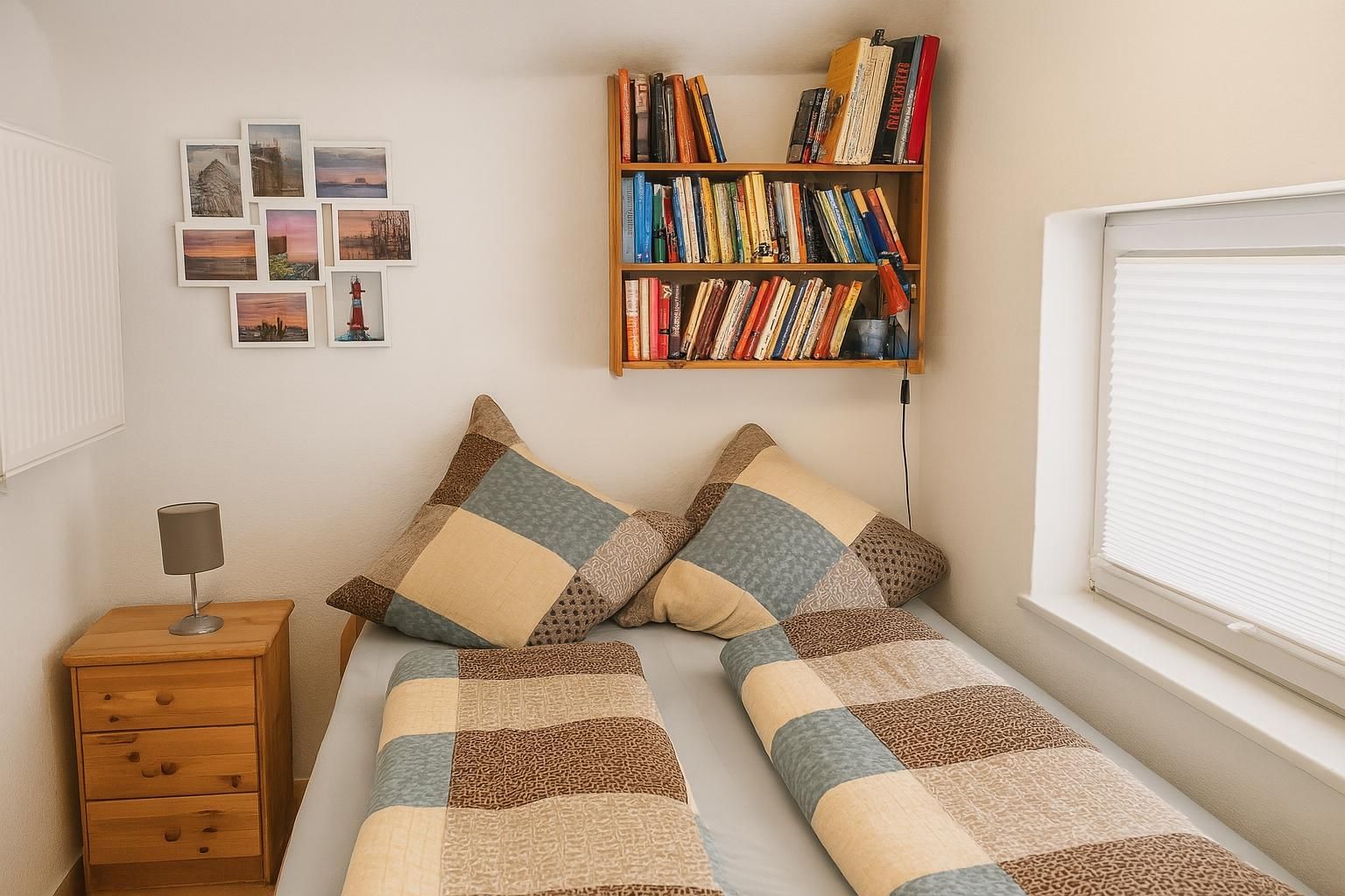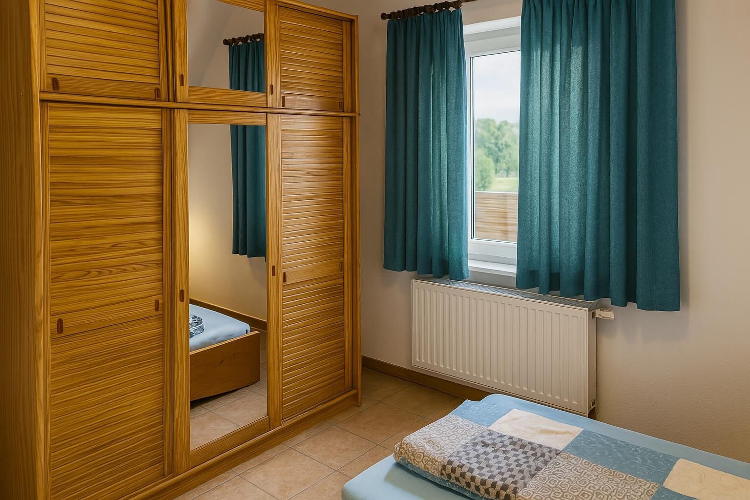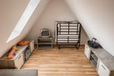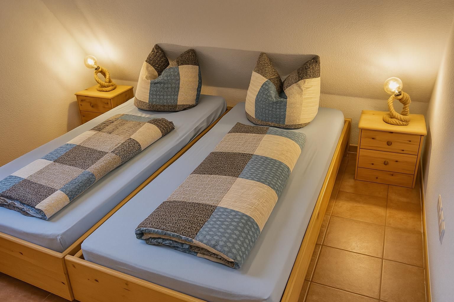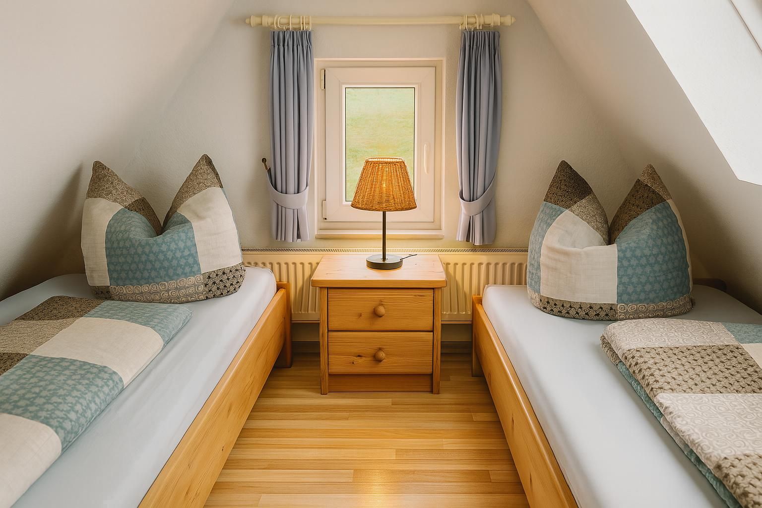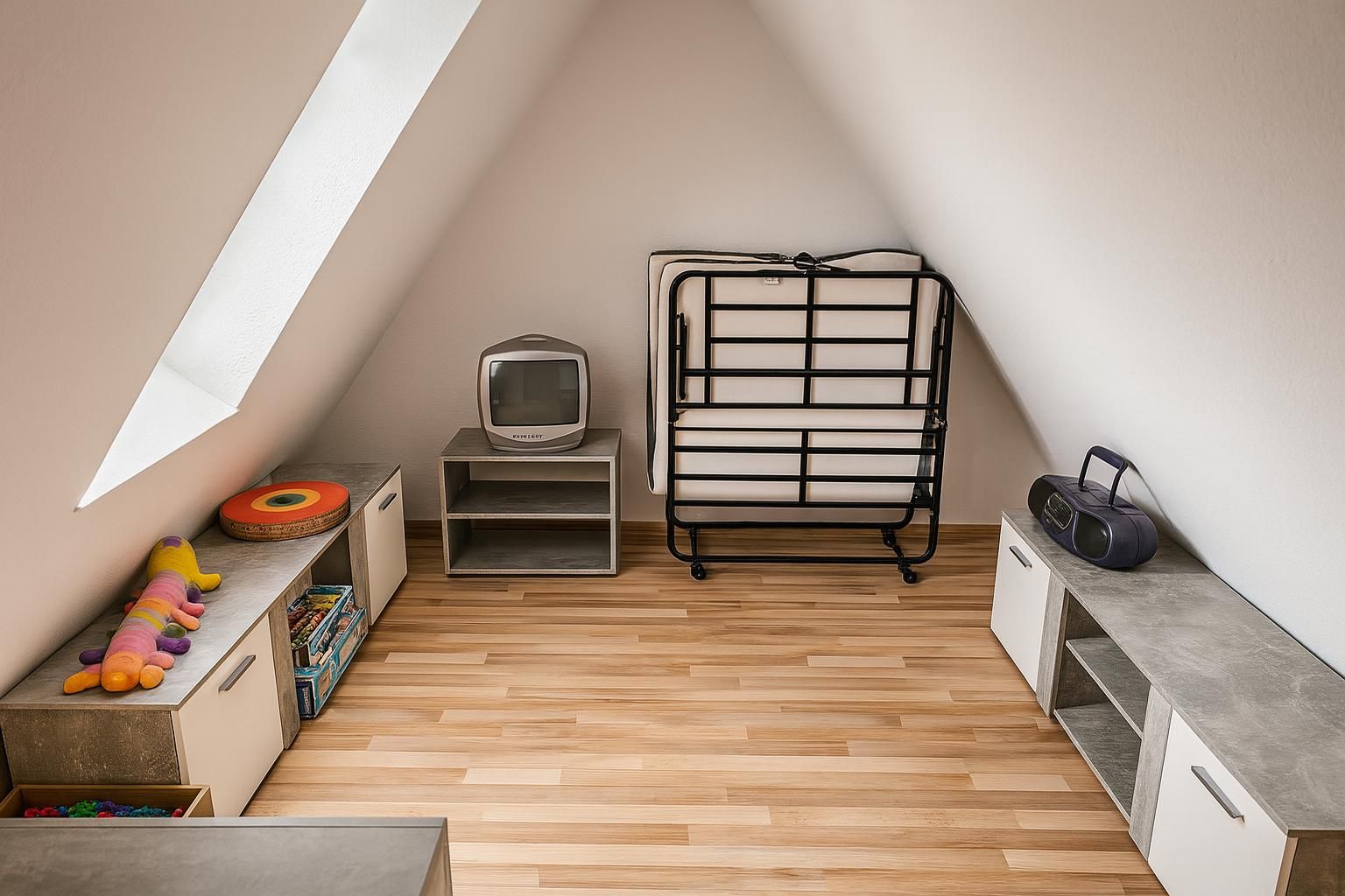 Das Kinderzimmer befindet sich auf dem ausgebauten Spitzboden, welchen man über eine schmale Holztreppe erreicht. Es verfügt über zwei Betten, einen Nachttisch, einen kleinen Kleiderschrank, eine Kommode und eine gemütliche Spielecke mit einigen Spielsachen. Außerdem gibt es einen kleinen Fernseher mit Sat-Receiver. Der Raum ist schön hell und freundliche, dank der eingebauten Fenster. Das Schlafzimmer ist ausgestattet mit zwei Betten, zwei Nachttischen mit Lampe und einem Kleiderschrank.