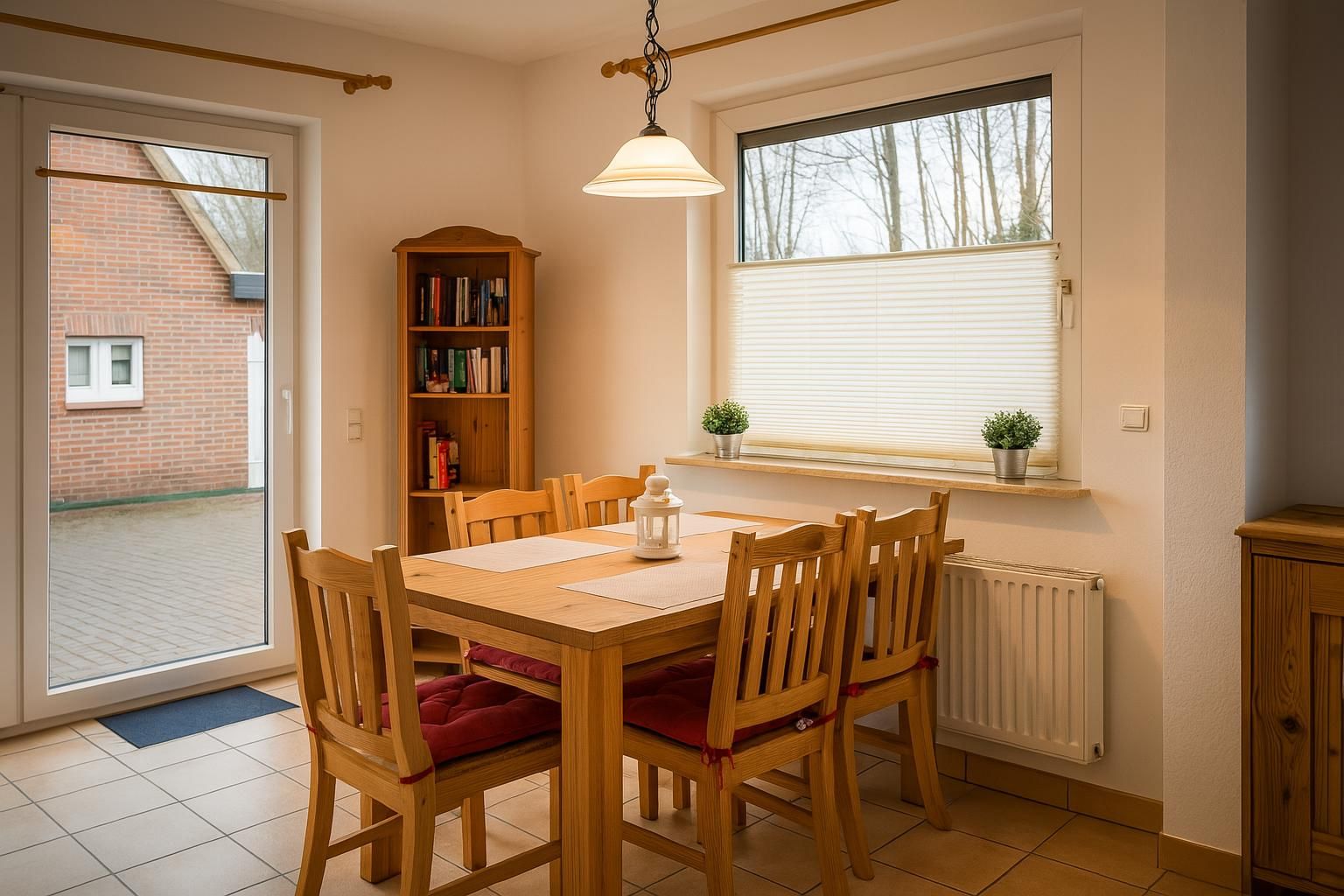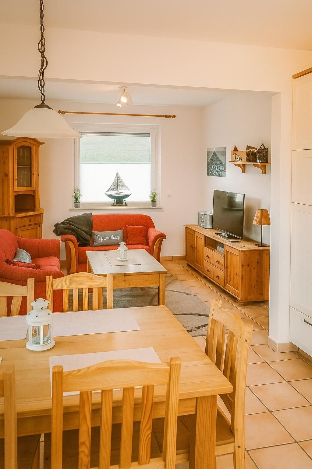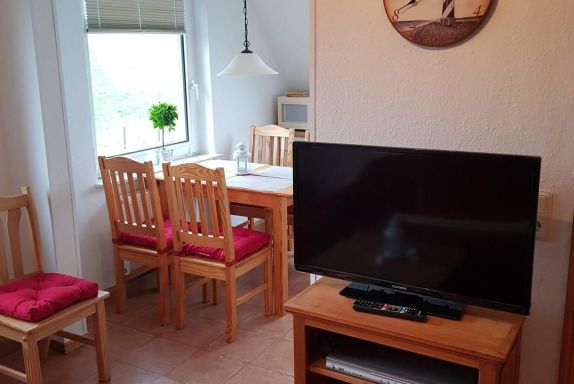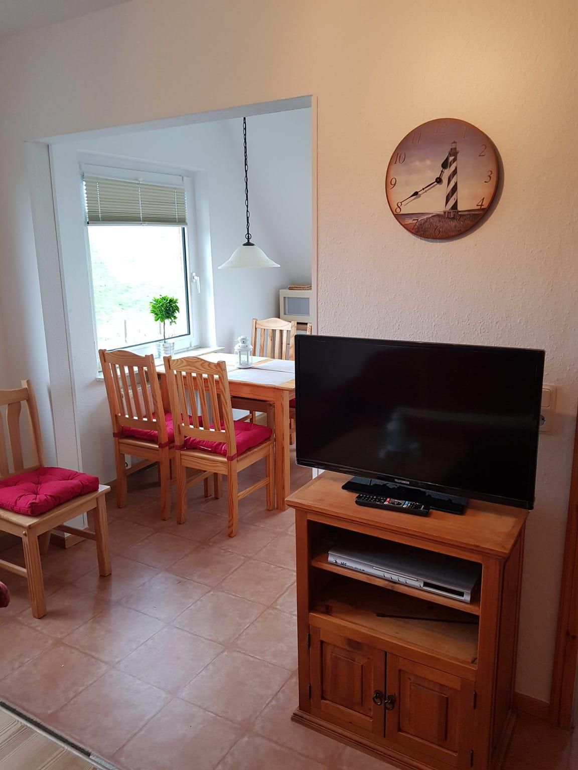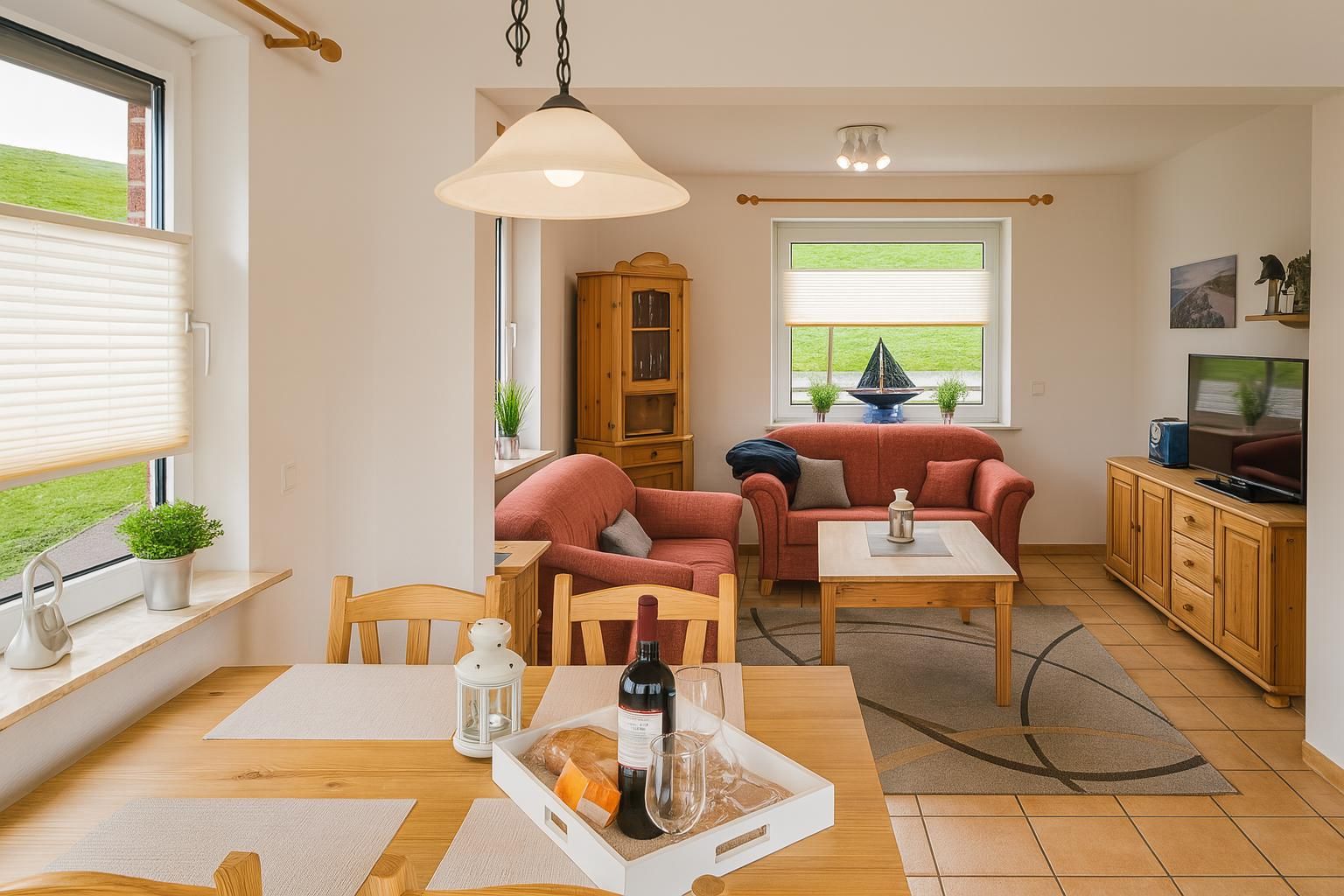 Der Wohnraum ist gemütlich eingerichtet. Durch das Wohnzimmer- und das Küchenfenster hat man direkten Blick auf den Deich. Das Wohnzimmer ist ausgestattet mit Smart-TV, DVD-Player, Stereoanlage mit Kassettendeck und CD-Player. Die gemütlichen Wohnzimmermöbel laden zum Verweilen ein. Weiterhin stehen Ihnen einige Bücher zum Lesen zur Verfügung.