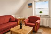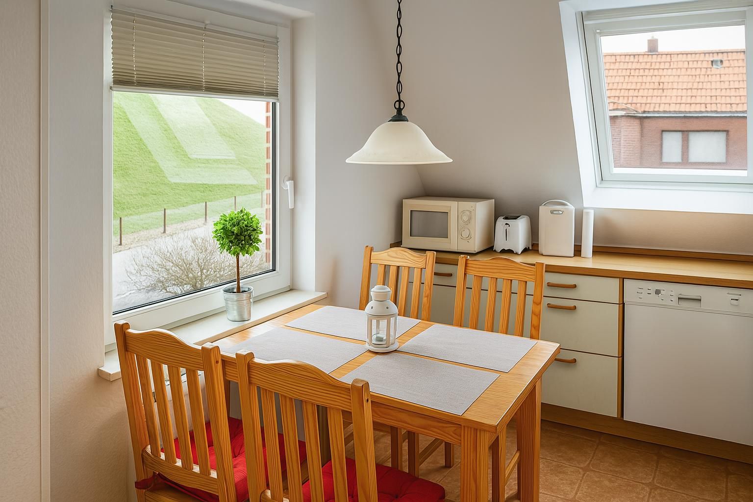 Die Ferienwohnung Möwennest im Obergeschoss ist knapp 50 qm groß und bietet vom Wohnzimmer und Esszimmer aus einen fantastischen Blick auf den Deich!