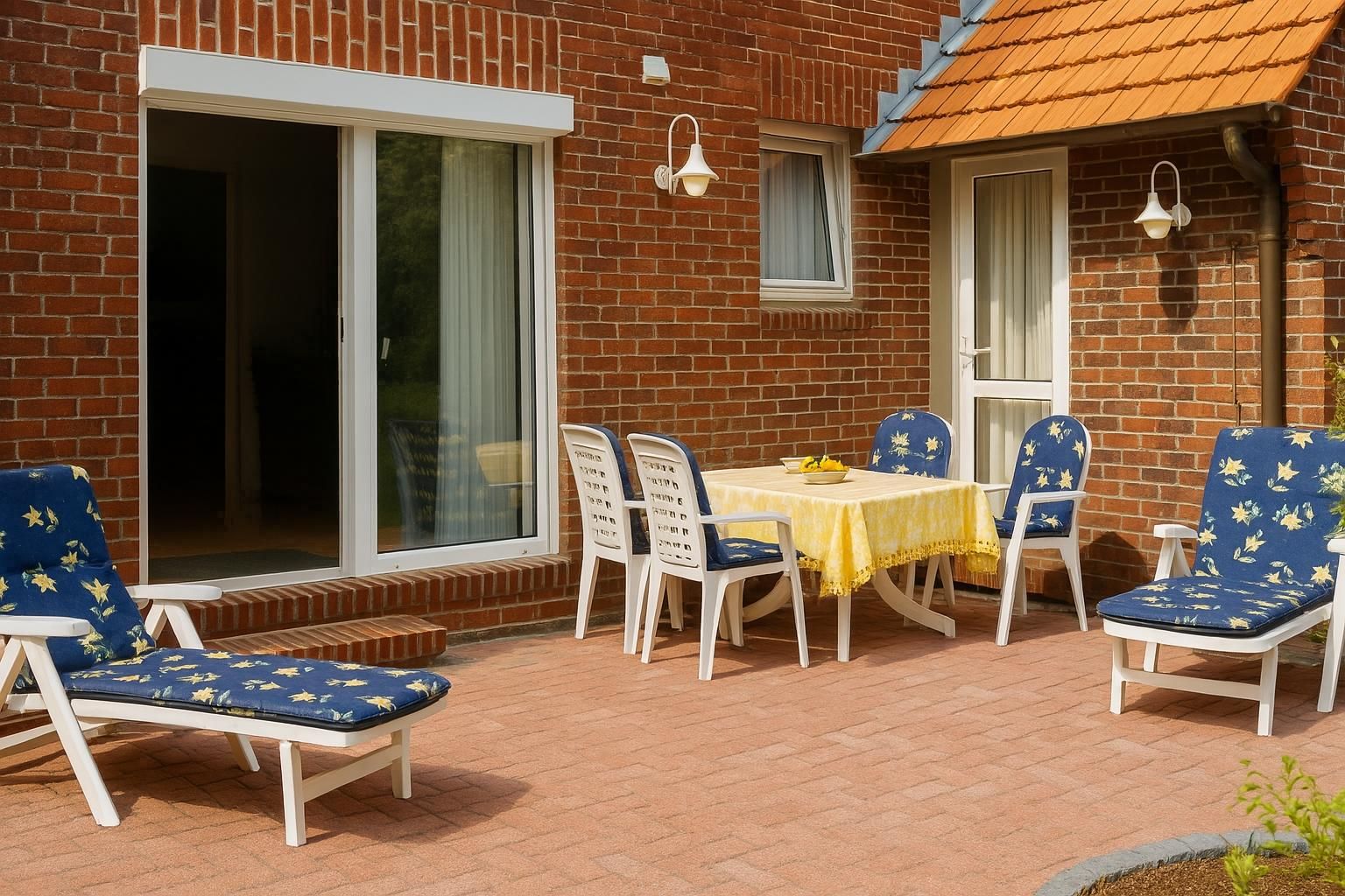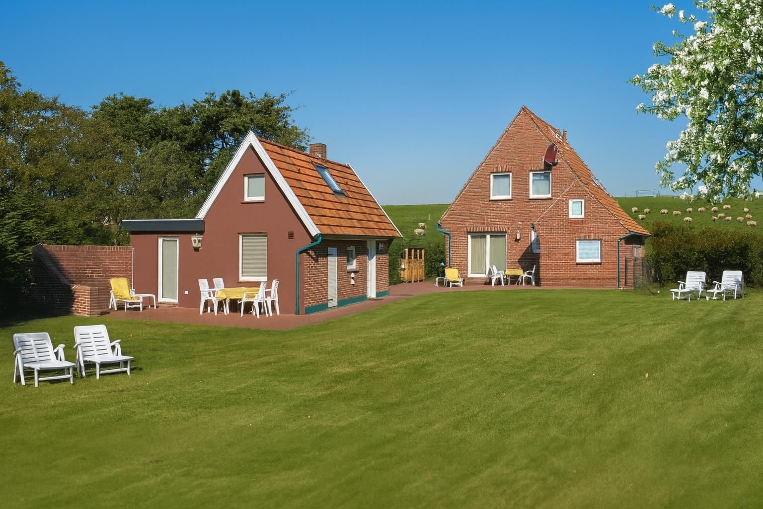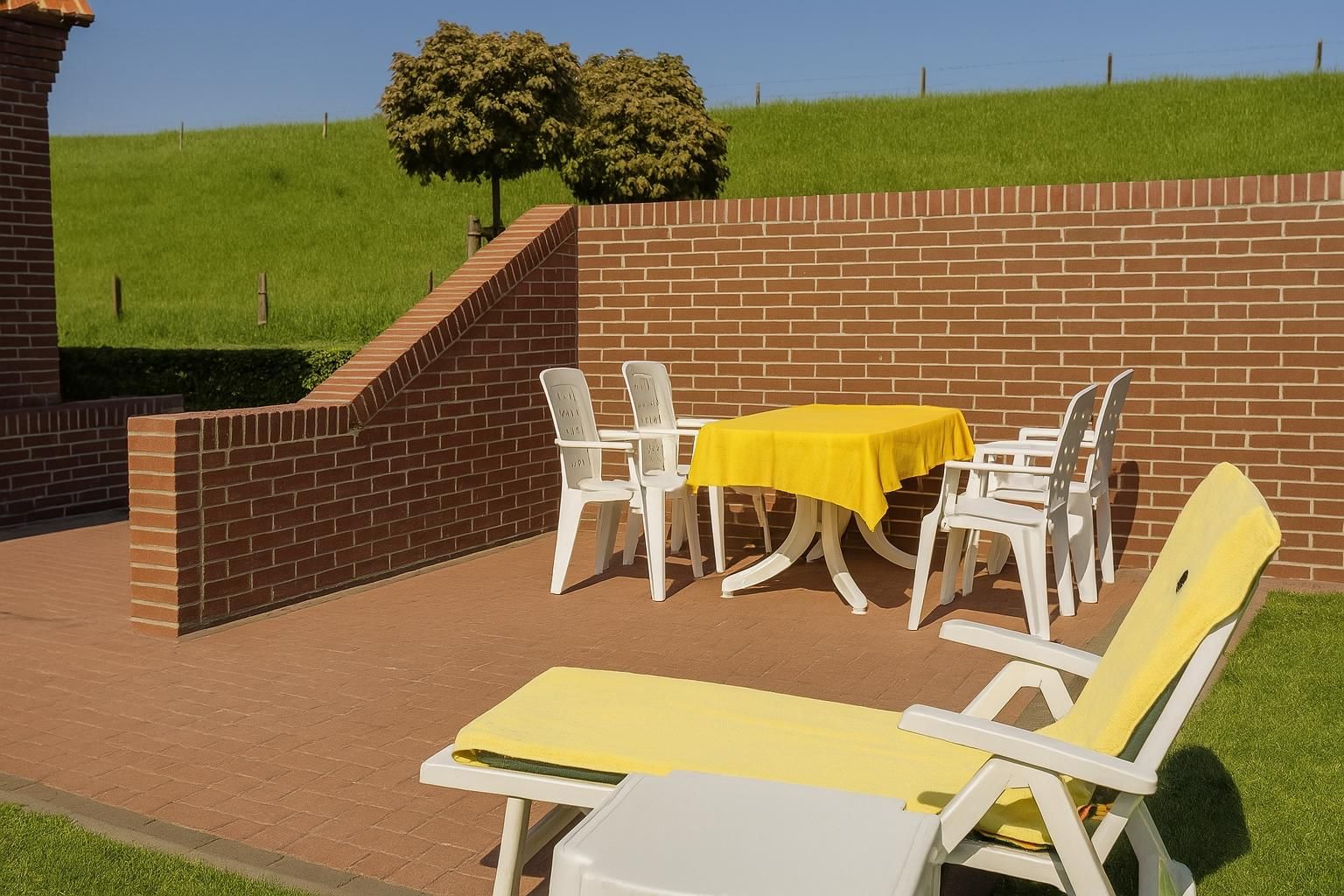 Die Ferienwohnung verfügt über einen eigenen Gartenanteil mit Terrasse nebst Gartenmöbeln, der vom Rest des Gartens abgegrenzt ist. So kann man seinen Nachmittagskaffee auch ganz in Ruhe in der Sonne genießen. Aber auch der große Garten mit kleinem Spielplatz ist für die Gäste mitnutzbar.Die Küche ist voll ausgestattet mit Herd, Backofen, Dunstabzug, großem Gefrierschrank, Kühlschrank und Spülmaschine. In den Schränken befindet sich alles von elektrischem Dosenöffner bis zum Waffeleisen. Auch eine Grundausstattung von Kaffeefilter bis Salz und Pfeffer ist (sofern nicht vom Vormieter verbraucht) vorhanden. Vom Esstisch aus hat man einen herrlichen Blick auf den Deich.Das Badezimmer ist ausgestattet mit Dusche, WC und Waschbecken. Außerdem befindet sich hier die Waschmaschine und der Wäschetrockner. Waschpulver ist (sofern nicht vom Vormieter verbraucht) ebenfalls vorhanden. Im Bad ist auch ein Fön, ein Bügeleisen, ein Staubsauger sowie dieverse Putzmittel verstaut.