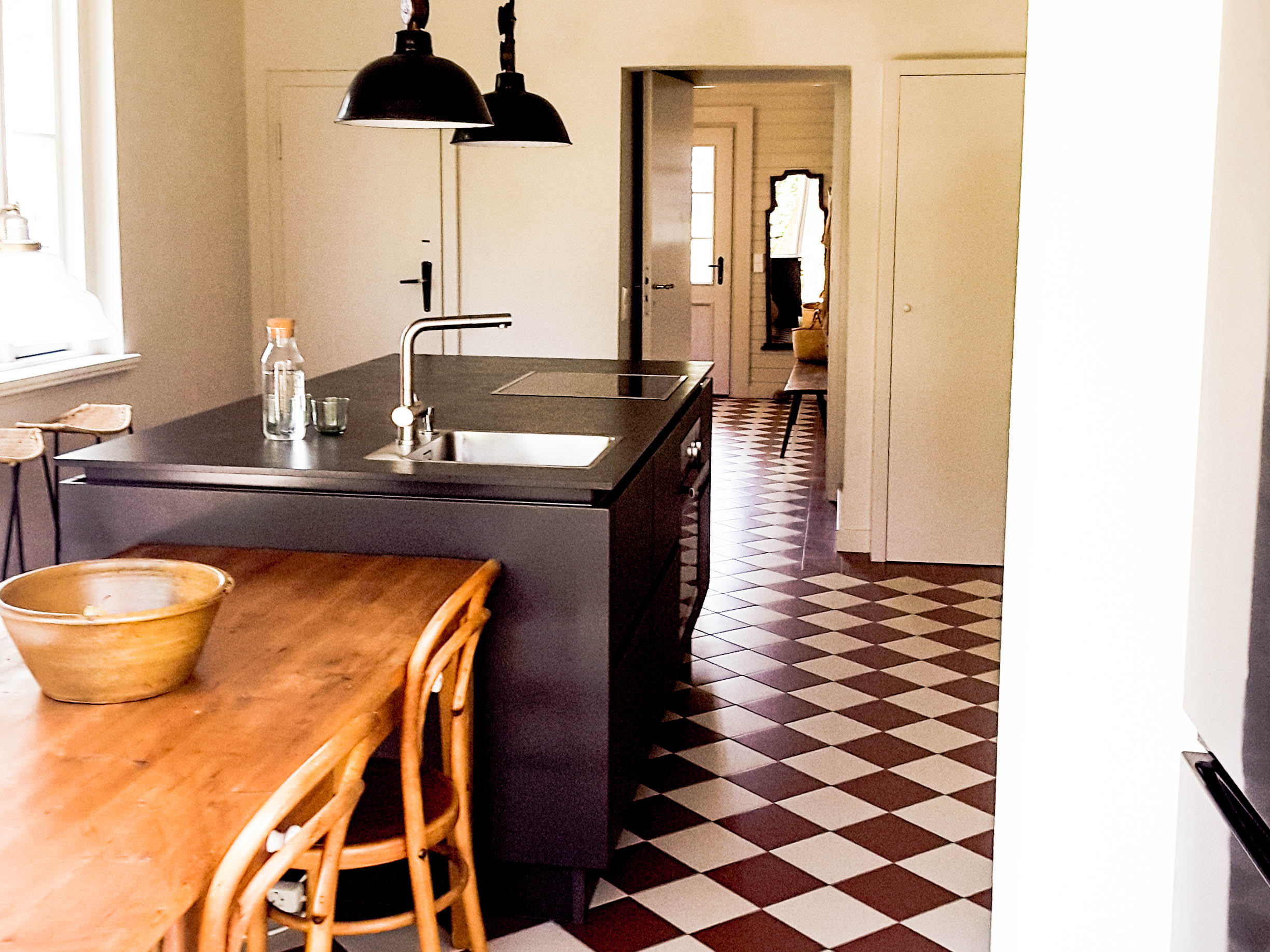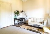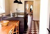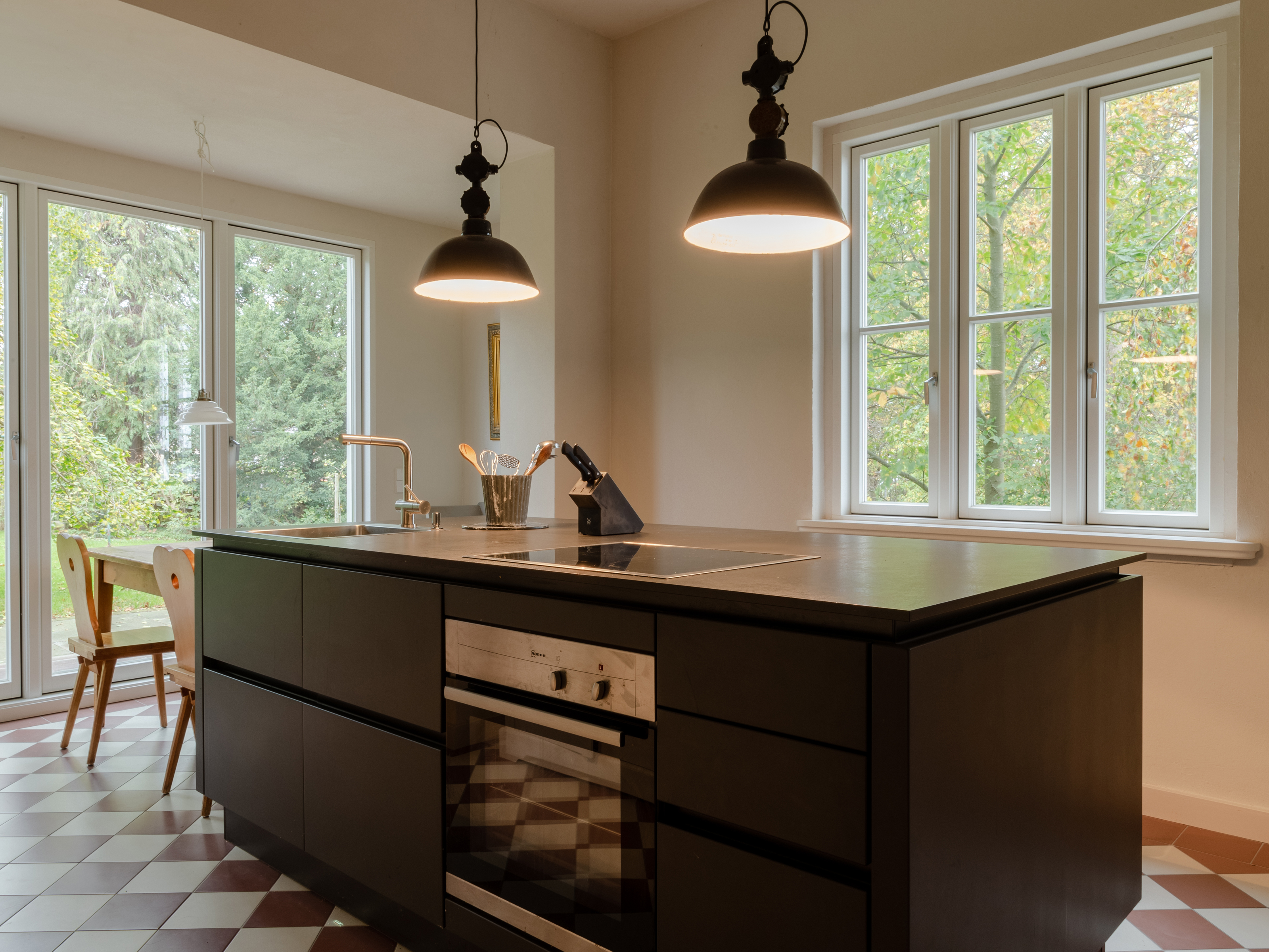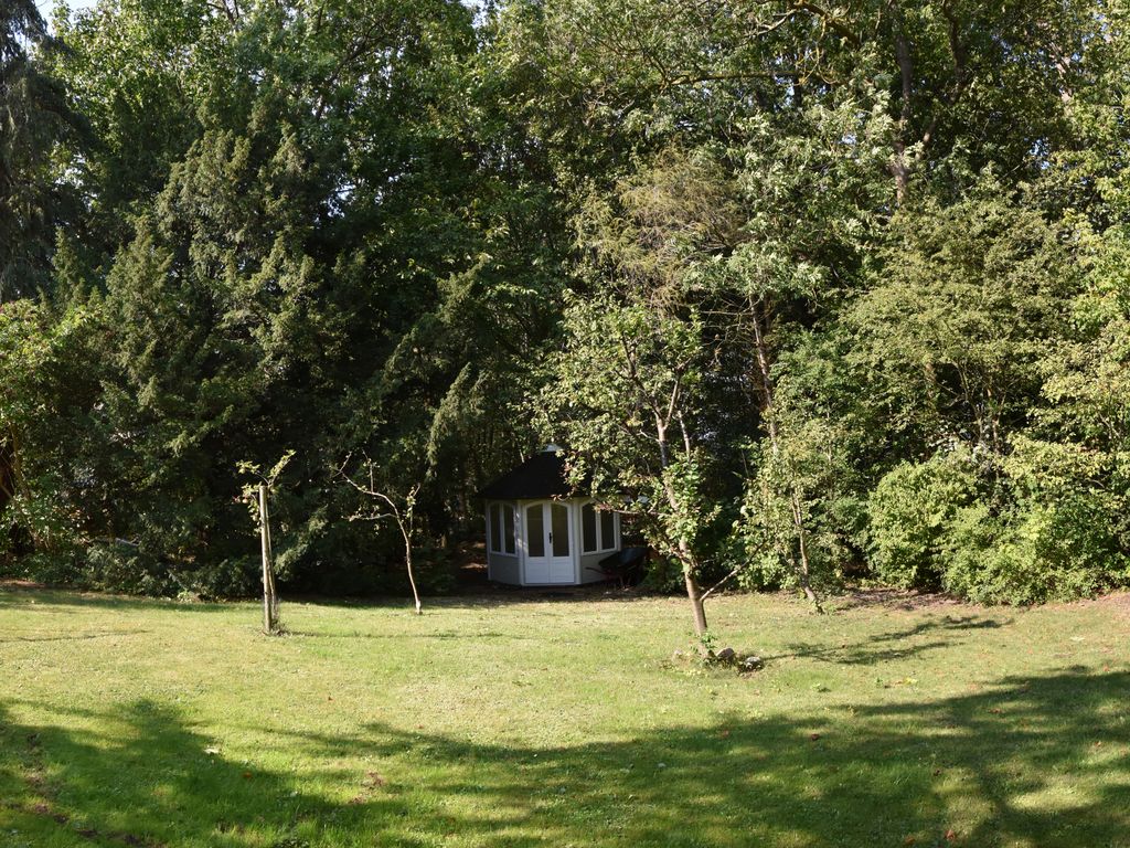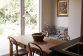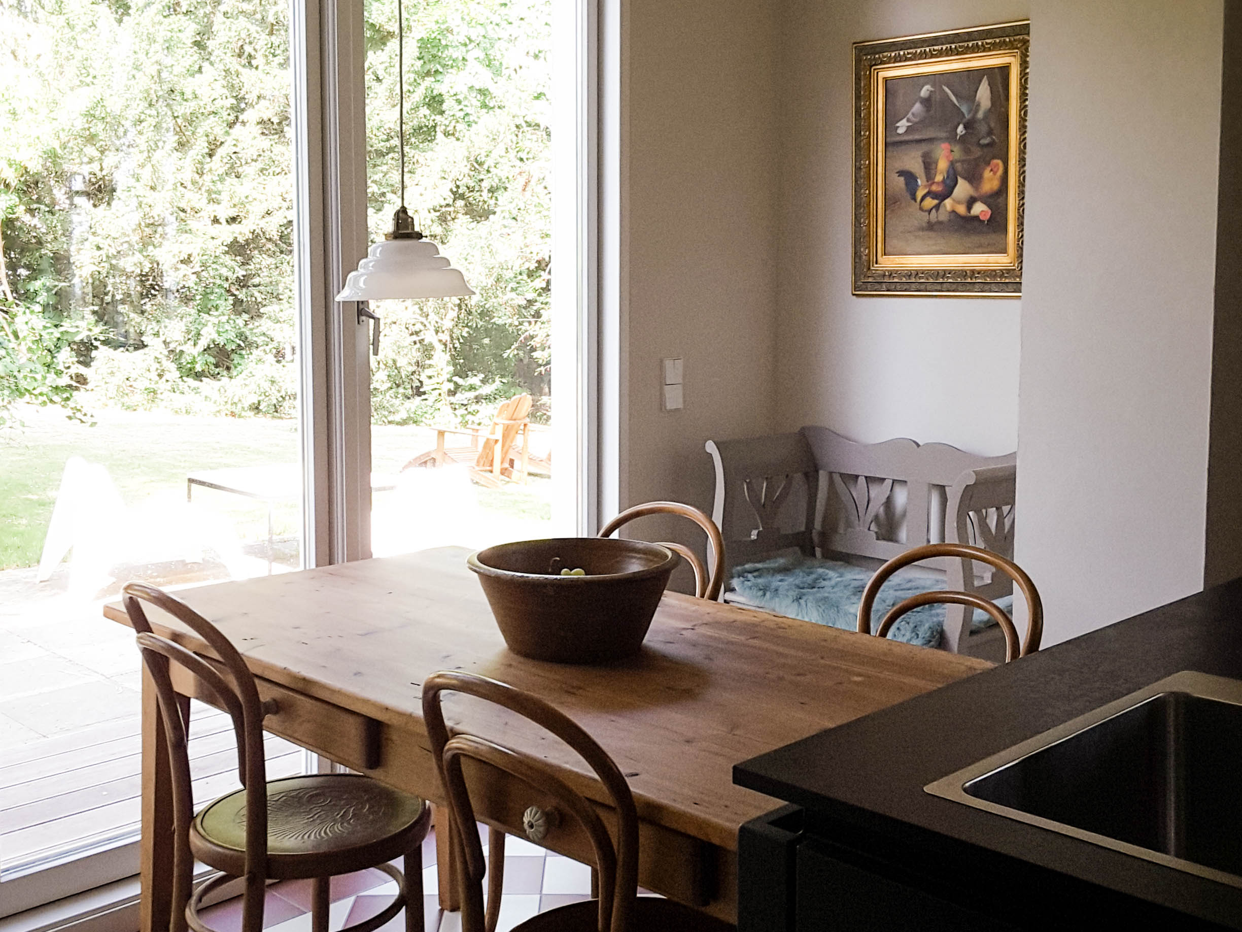 Ebenfalls im Erdgeschoss befindet sich die große Küche mit Sitzgelegenheit und Blick in den sehr großen Garten. Dort kann man noch den alten Baumbestand, Ginko, Eibe, Hängebuche, genießen und in der Hängematte oder den Liegestühlen entspannen. Das Haus bietet Platz für 10 Gäste.