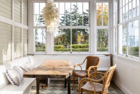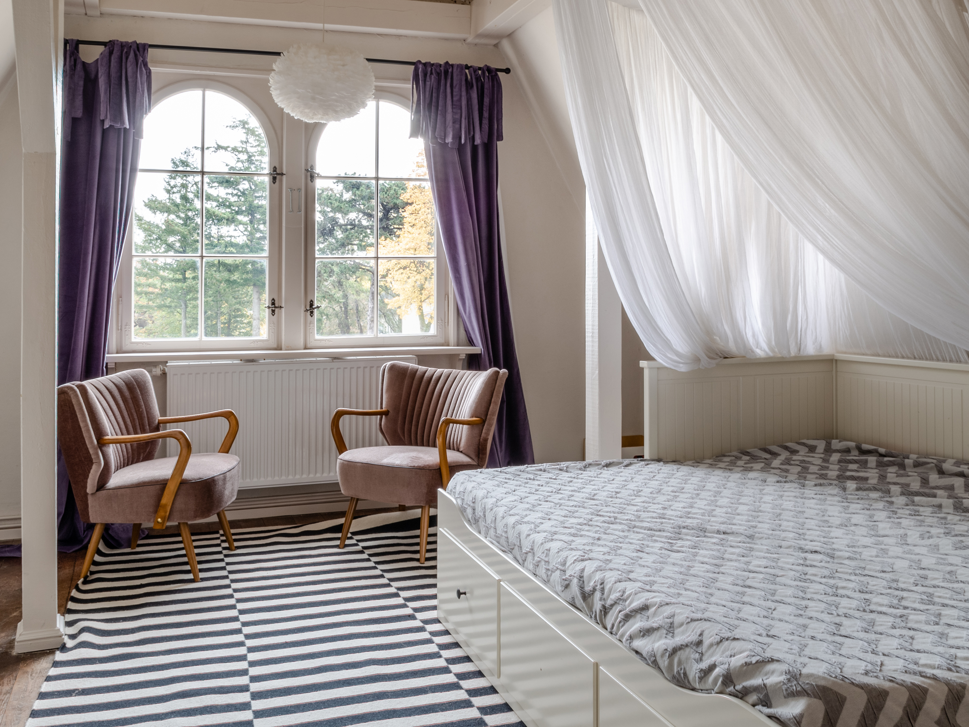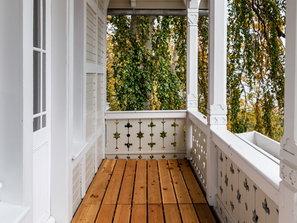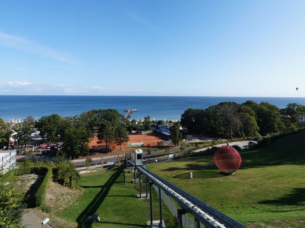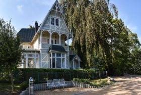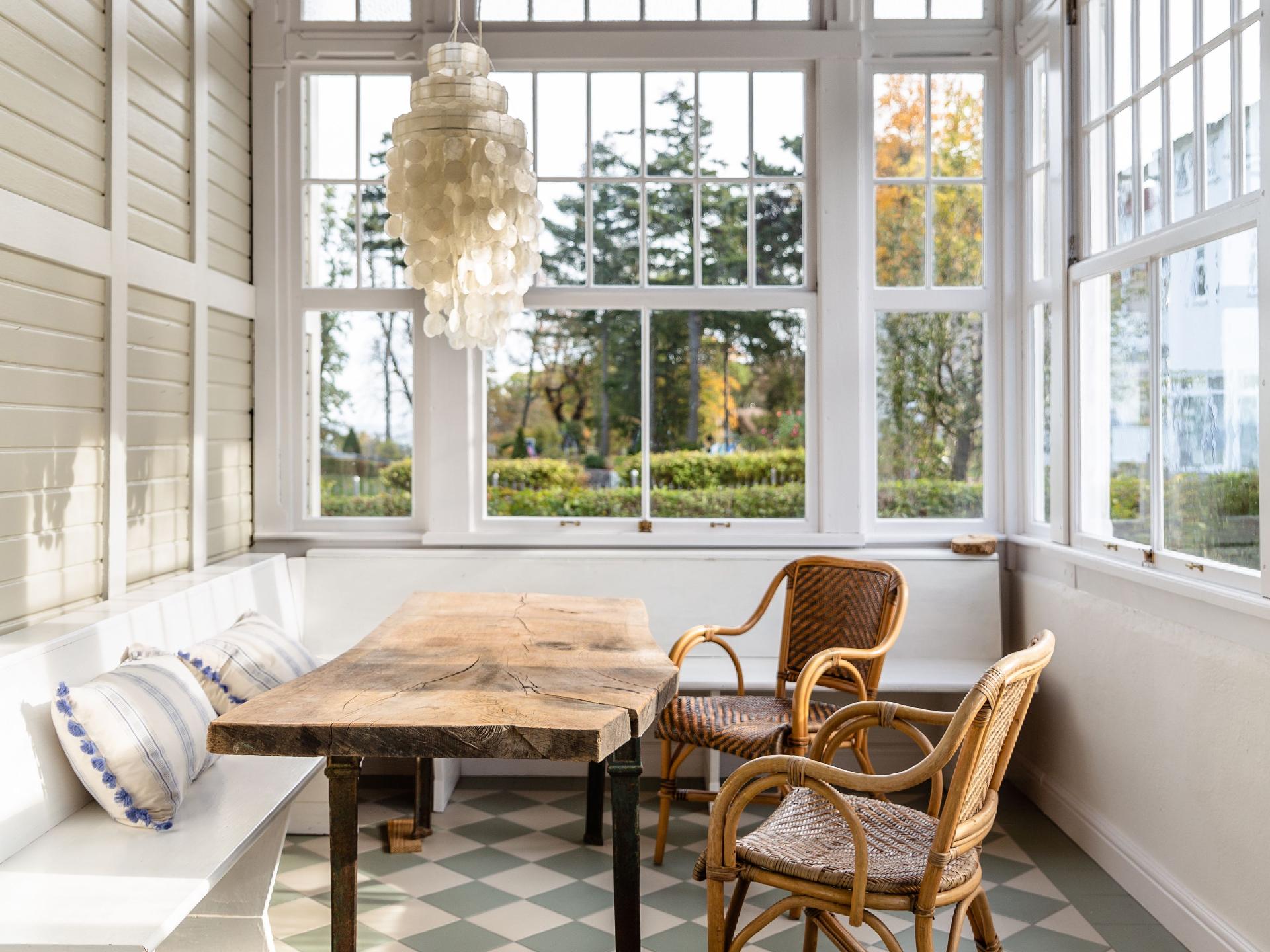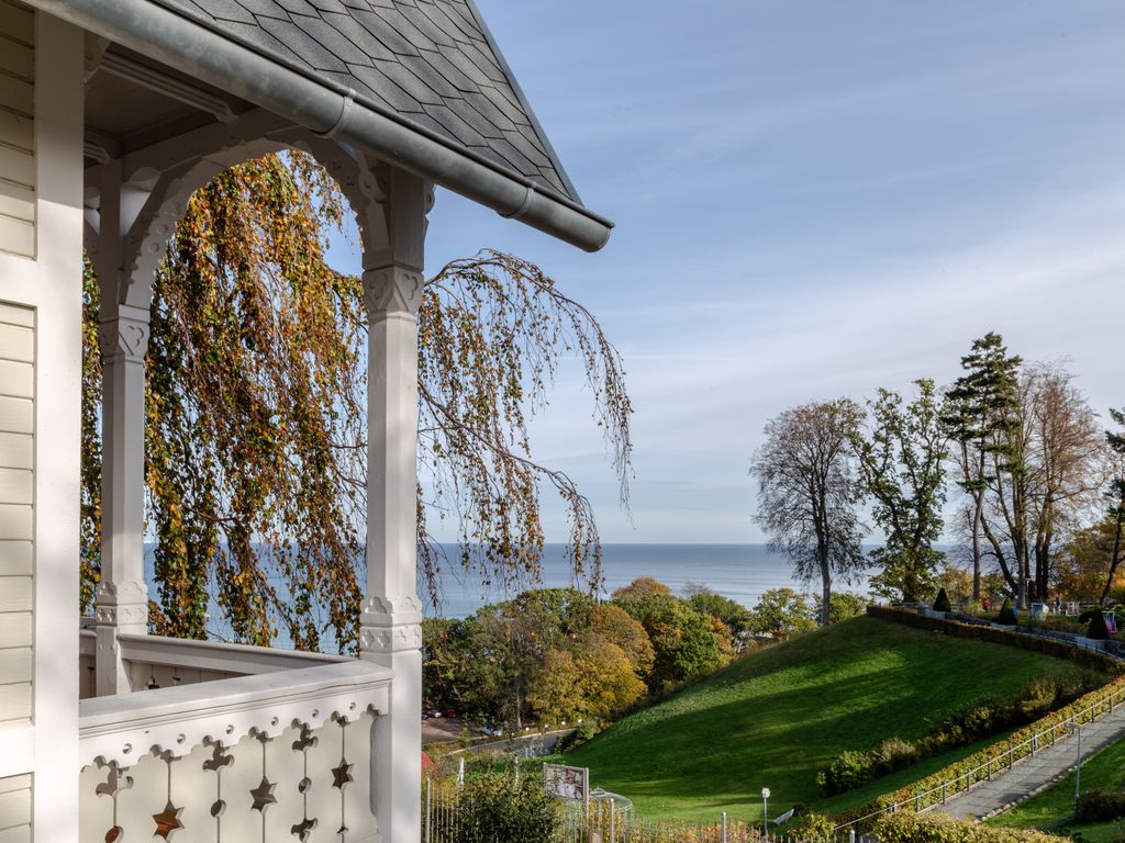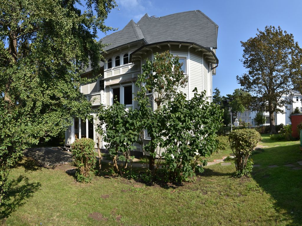 Das Haus wurde 2016/19 sensibel rekonstruiert, mit dem Anspruch, den historischen Villencharakter dem Baudenkmal wiederzugeben. In den oberen Geschossen befinden sich fünf Doppelschlafzimmer, drei mit Terrasse nach Süden, Osten und Westen. Es gibt vier Duschbäder. Verbunden sind die Schlafräume, die sich über zwei Etagen erstrecken durch das zentrale Treppenhaus, dessen Wände ganz mit Holz verkleidet sind. Im Erdgeschoss befinden sich, neben dem Haupteingang und der Garderobe die gemeinsam genutzten Räume. Mit den historischen Wandverkleidungen aus Pitchpineholz, zeigt das kleinere Wohnzimmer, Fernsehraum und Bibliothek den ganzen Charme der alten Bäderarchitektur. Das große Esszimmer und die Veranda bieten durch einen Erker Ostseeblick nach Nordost und Zugang in den vorderen Bereich des Gartens. Dort steht ein rustikaler Saunawagen der gerne genutzt werden kann. Neben dem Saunawagen steht ein kleines Nebengebäude, indem die Waschmaschine und eine weiter Toilette untergebracht ist.