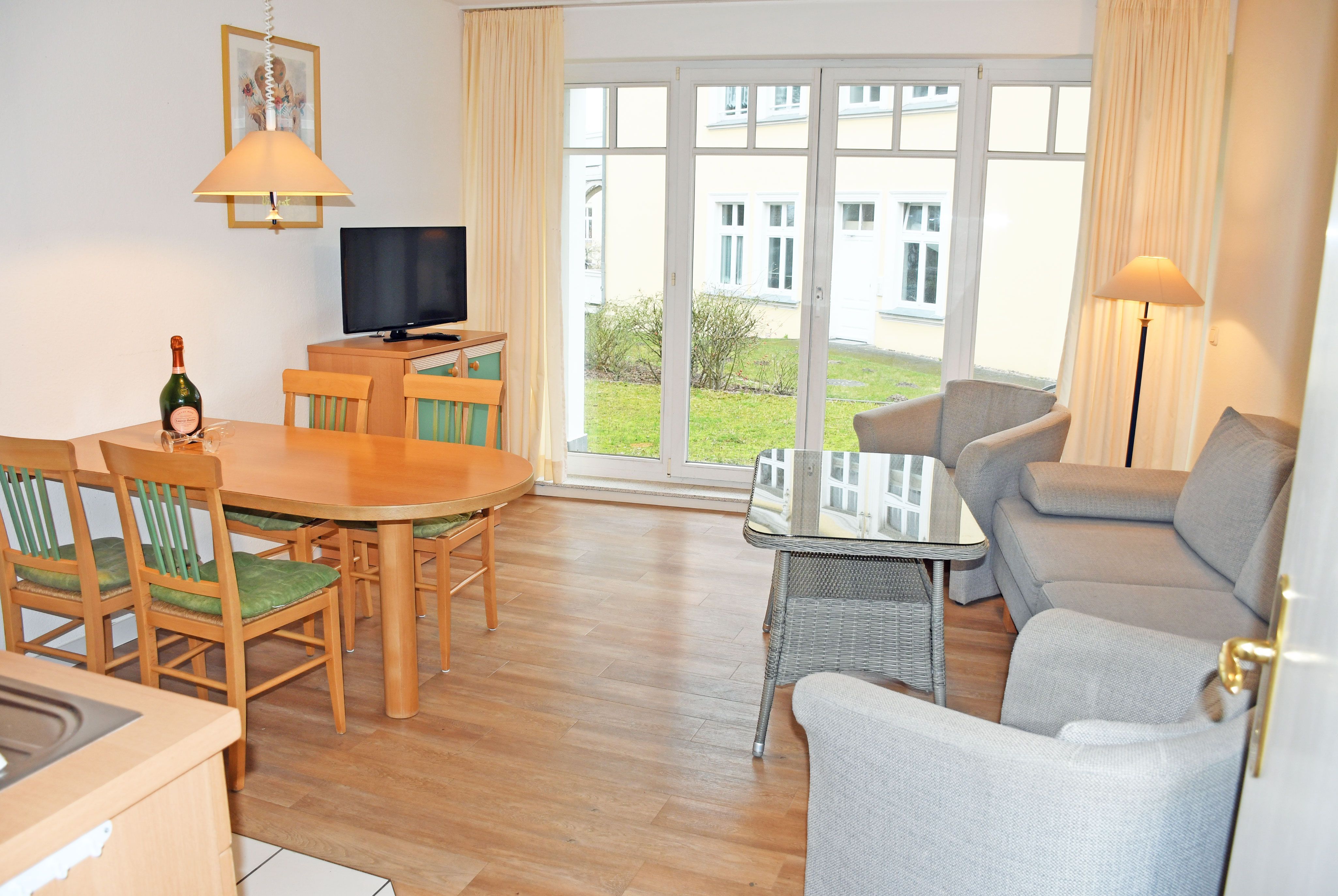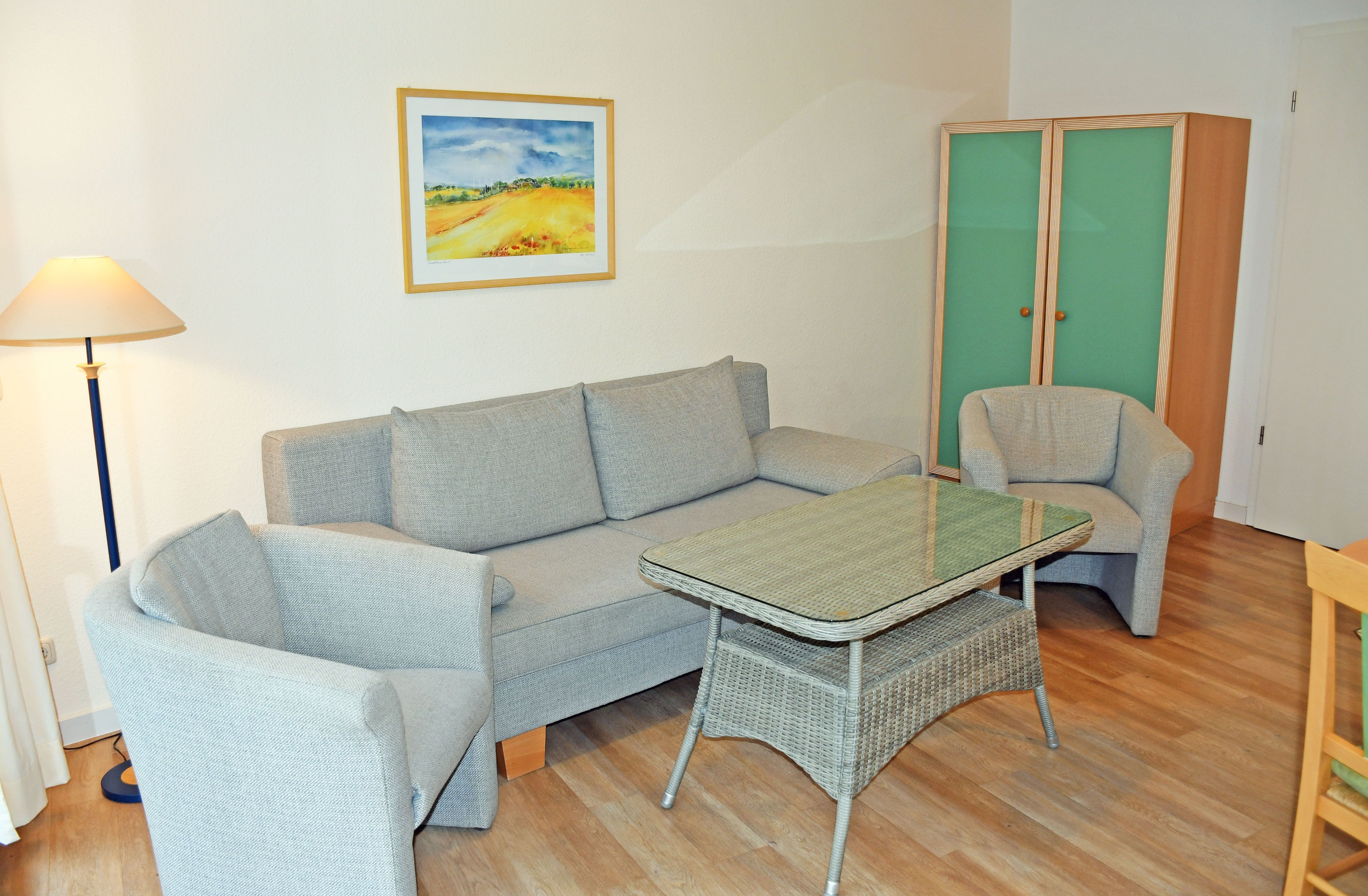 Unsere ruhig gelegene, helle und lichtdurchflutete 2-Raum-Ferienwohnung 22 mit Terrasse ist wie folgt ausgestattet:
