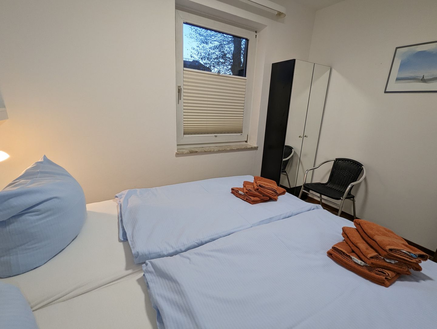 Diese Wohnung ist wie folgt aufgeteilt: WOHNBEREICH (ein Sofa, 2 Sessel, ein Couchtisch, Sat-TV, CD-Player, kostenloses Internet), Süd-West-Terrasse mit Gartenmöbel und Gartenblick, vollausgestattete WOHNKÜCHE mit Essbereich (u.a. Esstisch mit 4 Stühlen, Geschirrspüler, Mikrowelle, Backofen, Ceranfeld, Kühlschrank mit Gefrierfach, Kaffeemaschine, Toaster, Eierkocher, Besteck und Töpfe), SCHLAFZIMMER mit einem Doppelbett (180 x 200 cm) und einem Kleiderschrank, ein zweites SCHLAFZIMMER mit einem Einzelbett und einem Kleiderschrank, BADEZIMMER mit Dusche, Fenster, WC, Handtuchwärmer, Waschbecken, Spiegelschrank und Föhn, FLUR mit einer kleinen Garderobe für Jacken und Schuhe. Zur Wohnung gehört ein Parkplatz am Haus.