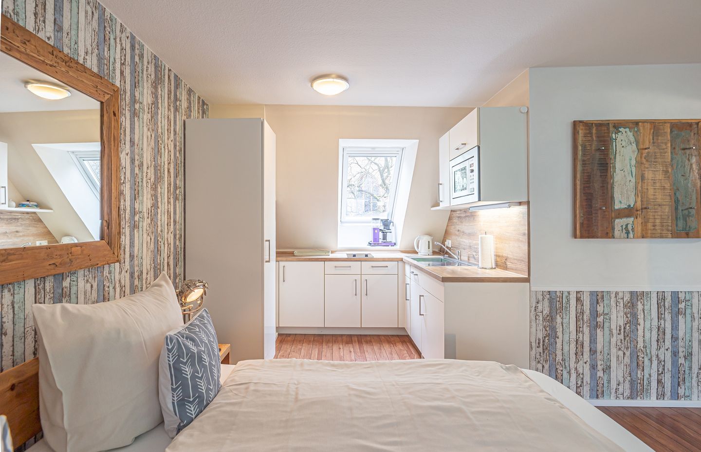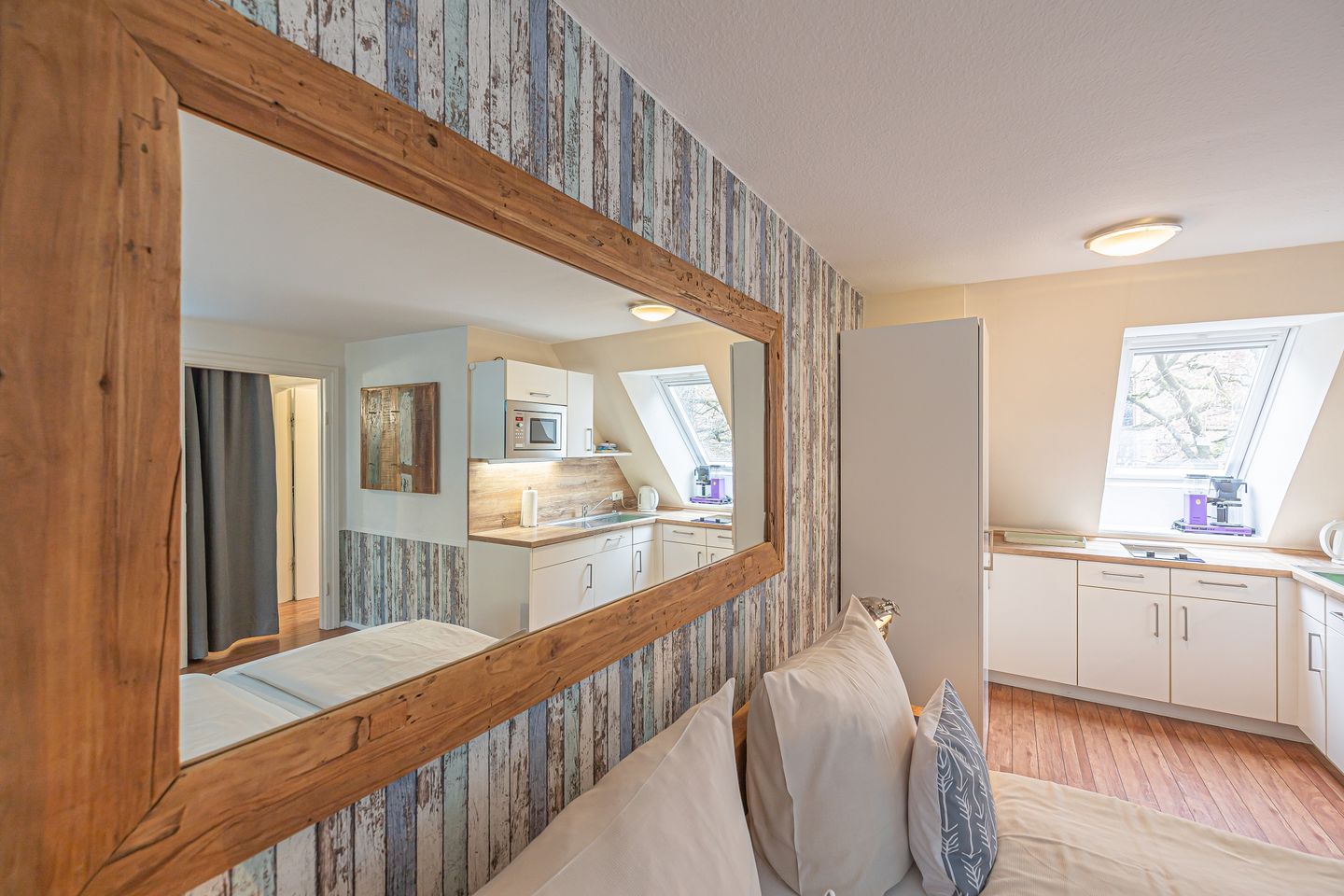 Historisches Ambiente mit moderner Ausstattung: Genießen Sie den herrlichen Ausblick vom Esstisch Ihres Apartments auf den ältesten Marktplatz Flensburgs, den Neptunbrunnen und das lebendige Treiben der umliegenden Cafés, Restaurants und Kneipen. Der kombinierte Wohn- und Schlafbereich ist liebevoll maritim gestaltet und verfügt über eine charmante, gut ausgestattete Küche – ideal für Selbstversorger. Ein modernes Tageslicht-Duschbad mit Waschmaschine rundet das Angebot ab und bietet Komfort für Ihren gesamten Aufenthalt. Natürlich sind auch kostenfreies WLAN und ein Smart-TV vorhanden.
