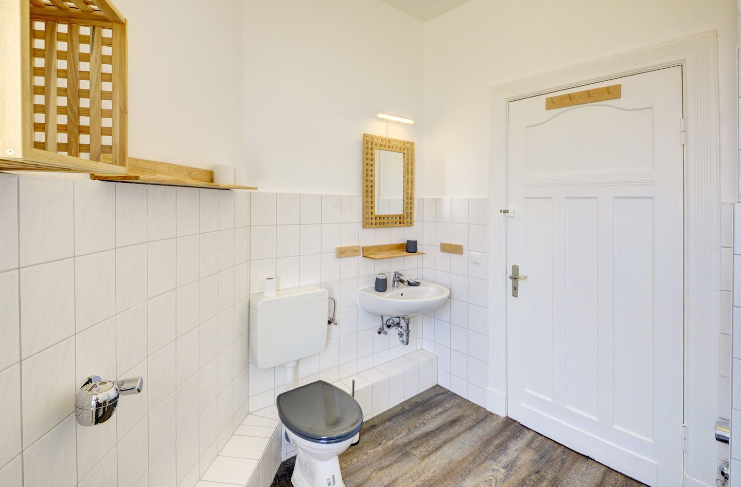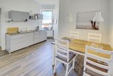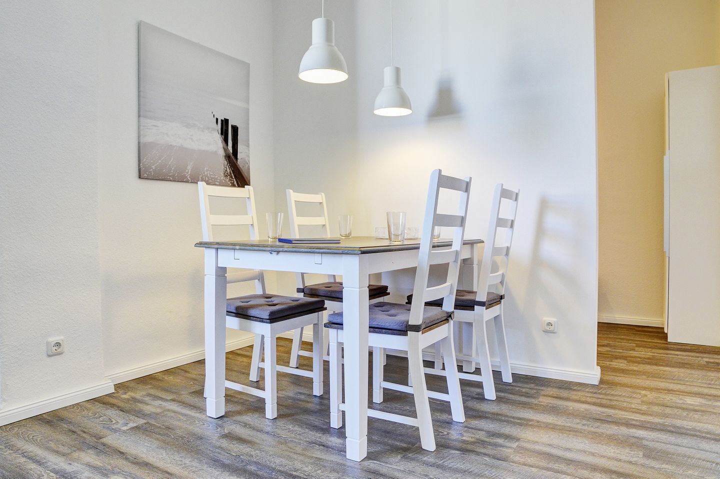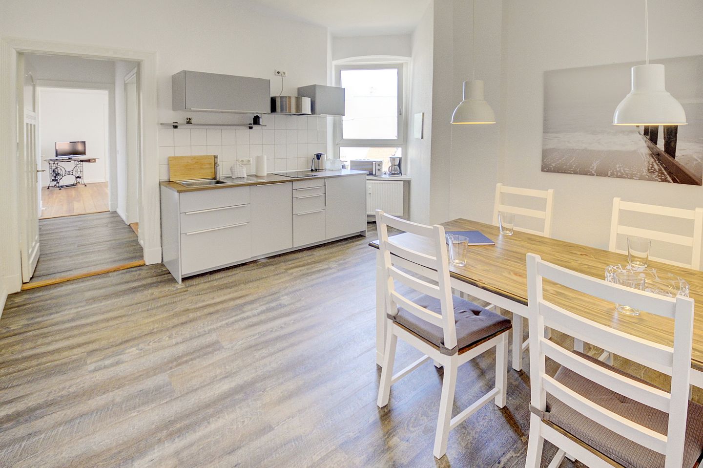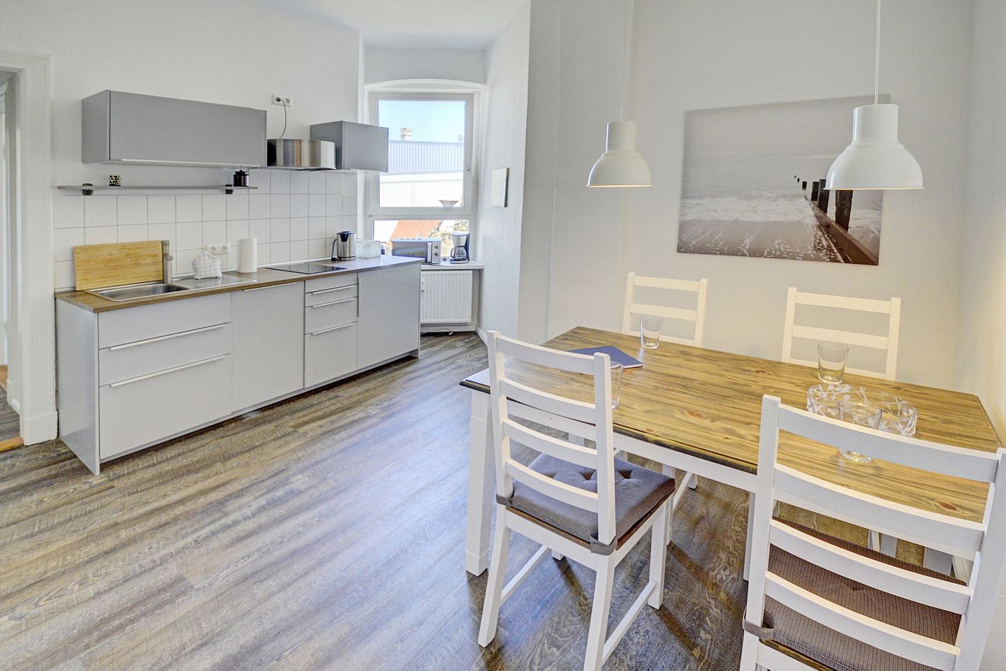 Die Wohnung verfügt über zwei komfortable Schlafzimmer, eines davon mit Etagenbetten, die mit geschmackvollen Dielenboden ausgestattet sind und eine gemütliche Atmosphäre ausstrahlen. Hier finden Sie den idealen Rückzugsort nach einem erlebnisreichen Tag. Das moderne Badezimmer ist mit einer Dusche mit Wanne ausgestattet und bietet Ihnen den Komfort, den Sie sich für Ihren Urlaub wünschen. Die offene Küche ist vollständig ausgestattet und lässt keine Wünsche offen. Sie finden hier ein Cerankochfeld, eine Spülmaschine, eine Mikrowelle, einen Kühlschrank mit Gefrierfach sowie eine Kaffeemaschine und einen Toaster. Ein Esstisch im Esszimmer lädt dazu ein, gemeinsam zu essen und die Erlebnisse des Tages zu teilen.