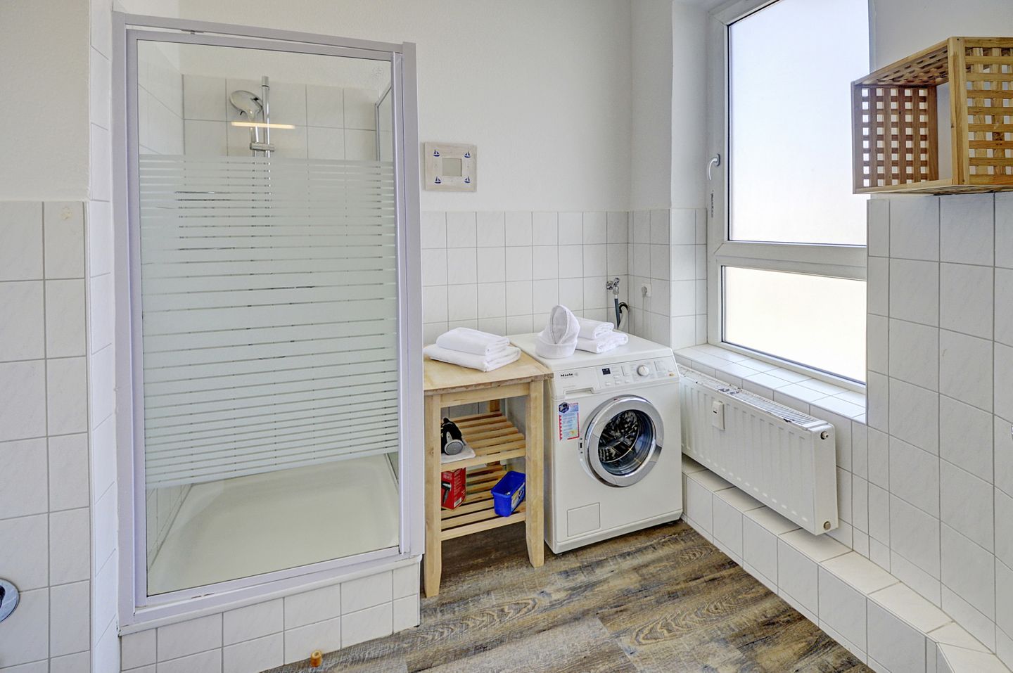 Das Badezimmer bietet eine Dusche mit Wanne, perfekt zum Entspannen nach einem langen Tag. Es ist mit einem Haartrockner ausgestattet, und die Erstausstattung an Handtüchern und Geschirrhandtüchern sorgt dafür, dass Sie sich um nichts kümmern müssen. Zudem finden Sie eine Waschmaschine vor, die Ihnen während Ihres Aufenthalts zur Verfügung steht.
