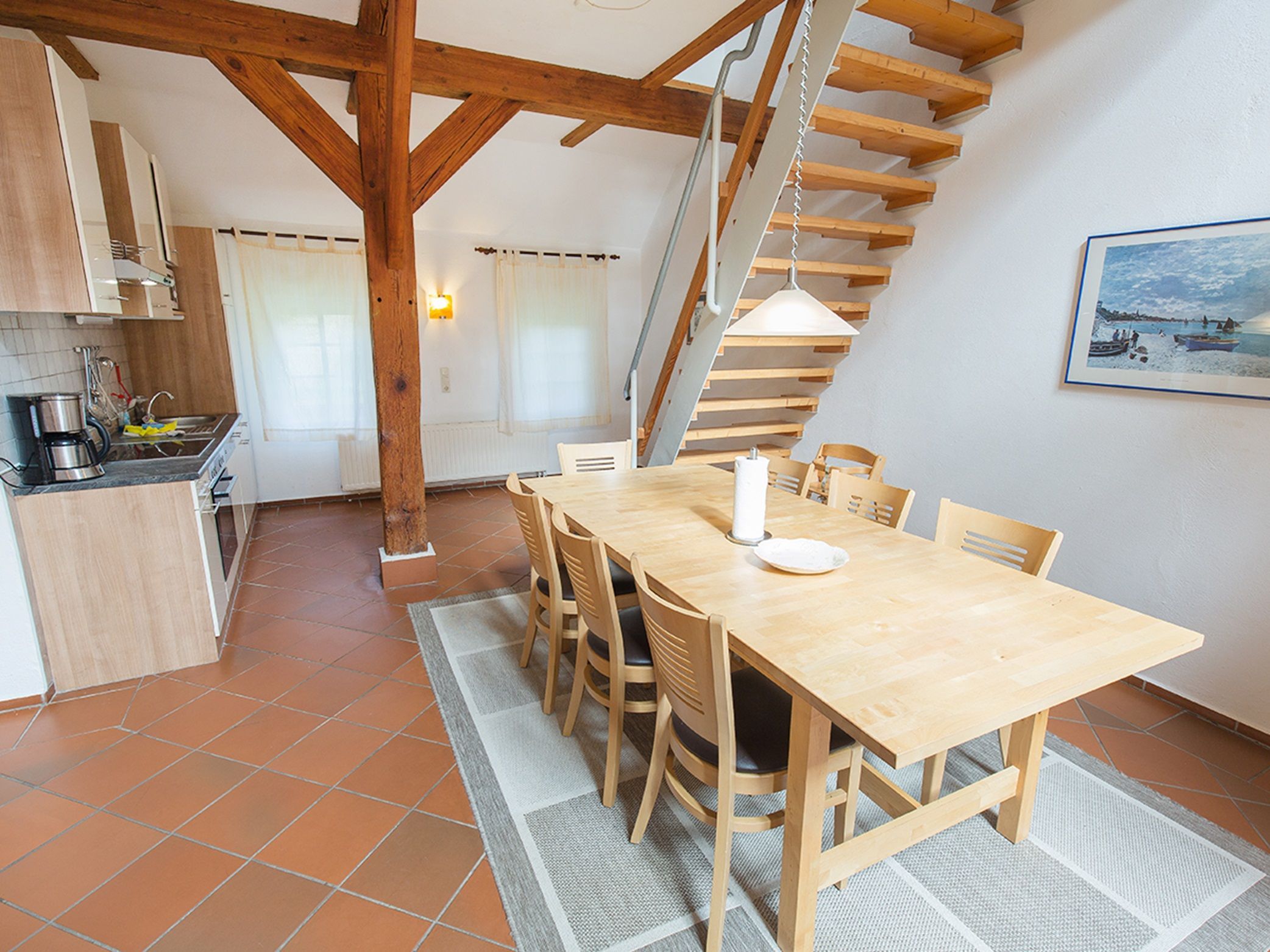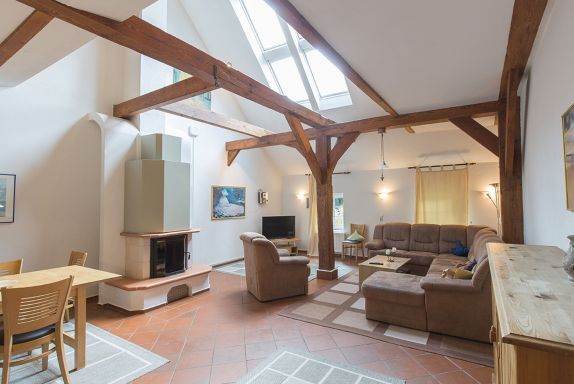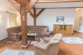 Von der freundlichen Diele mit Garderobe aus gelangen Sie unmittelbar in den Wohnraum mit Kaminofen, großer Sitzlandschaft und Sessel. Direkt dahinter befindet sich die separate voll ausgestattete Küche mit Essbereich in behaglichen Farbtönen. Ein Duschbad mit WC gibt es auf der unteren Ebene. Eine offene Holztreppe führt ins Obergeschoß. Hier befindet sich das weitere Duschbad mit WC sowie die beiden Schlafräume mit je zwei Einzelbetten und viel Platz für Kleidung. Eine weitere offene Holztreffe führt auf die Dach-Schlafempore mit 2 weiteren Einzelbetten - dieser Schlafbereich ist nicht abschließbar. Nutzen Sie ihre eigene große Terrasse mit Blick auf das weitläufige Gelände. Die Wohnung hat einen separaten Zugang und eine eigene möblierte Terrasse. Genügend Parkplätze befinden sich direkt vor dem Gebäude.