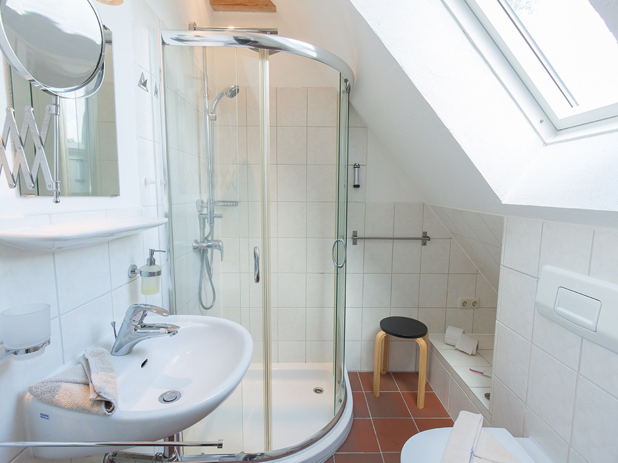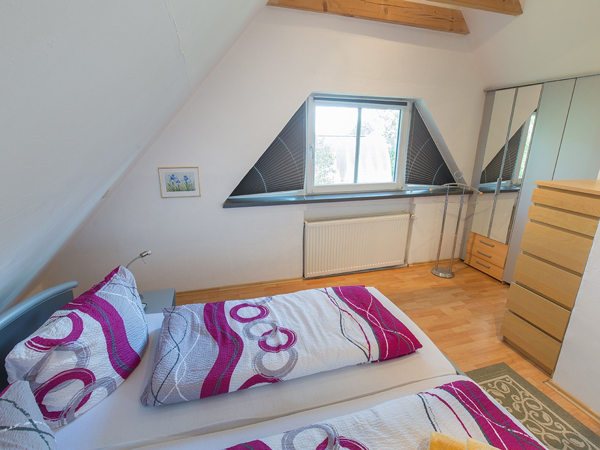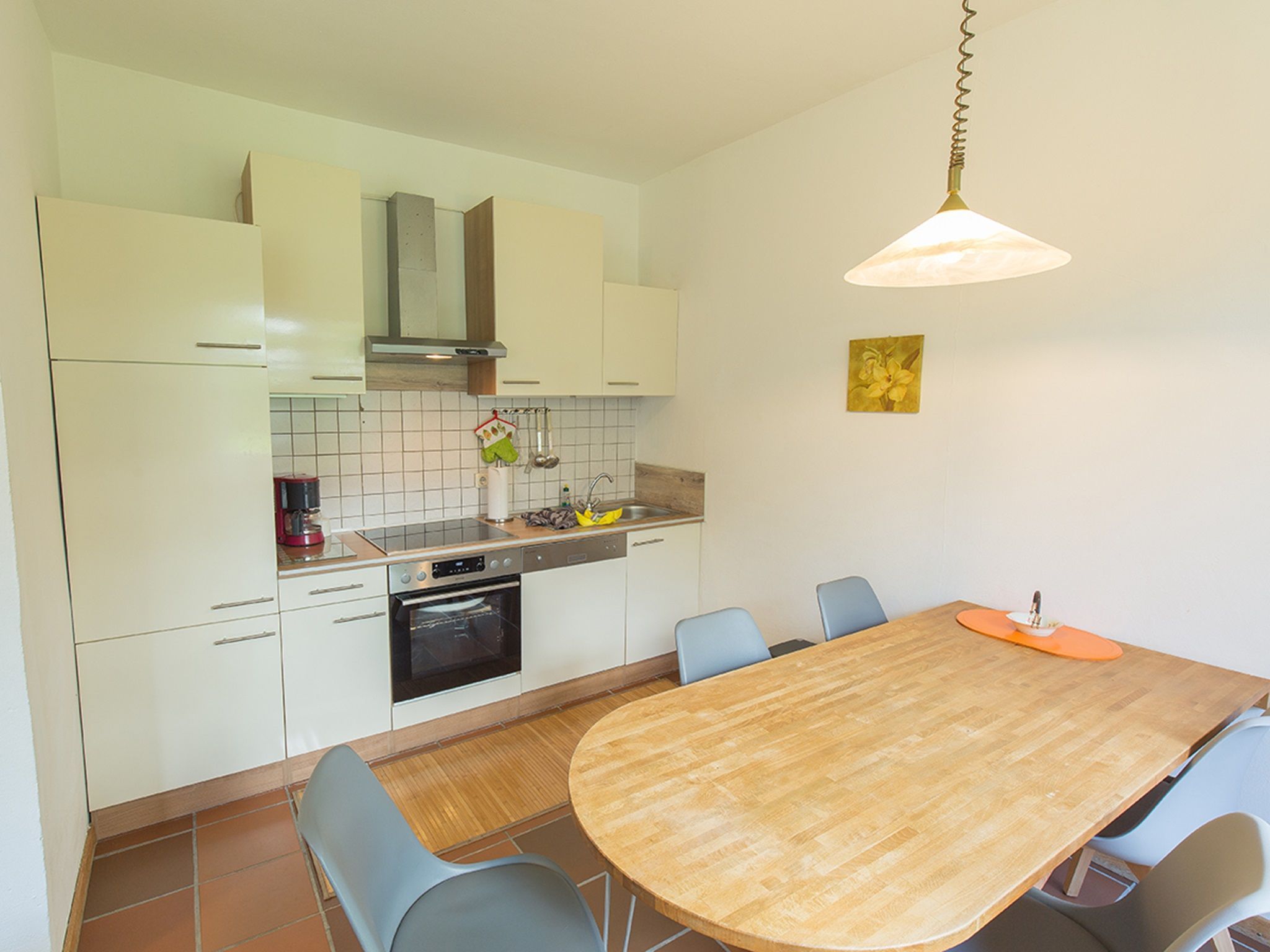 Ab Diele gelangen Sie in den großen gemütlichen Wohn-/Ess-/Kochbereich mit Kaminofen und dem ersten Badzimmer mit Wanne. Eine offene Holztreppe führt ins Obergeschoß zum zweiten Badezimmer mit Dusche sowie den beiden Schlafräumen. Ein Schlafzimmer hat ein komfortables Doppelbett und das andere insgesamt drei Einzelbetten. Nutzen Sie ihre eigene große Terrasse mit Blick ins Grüne.
