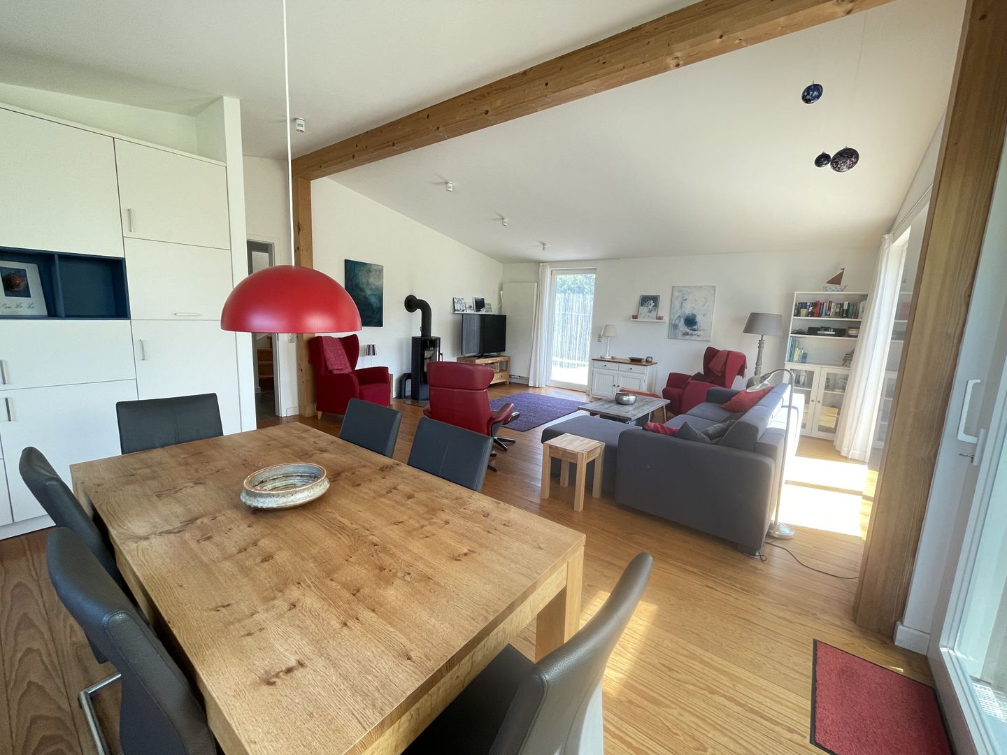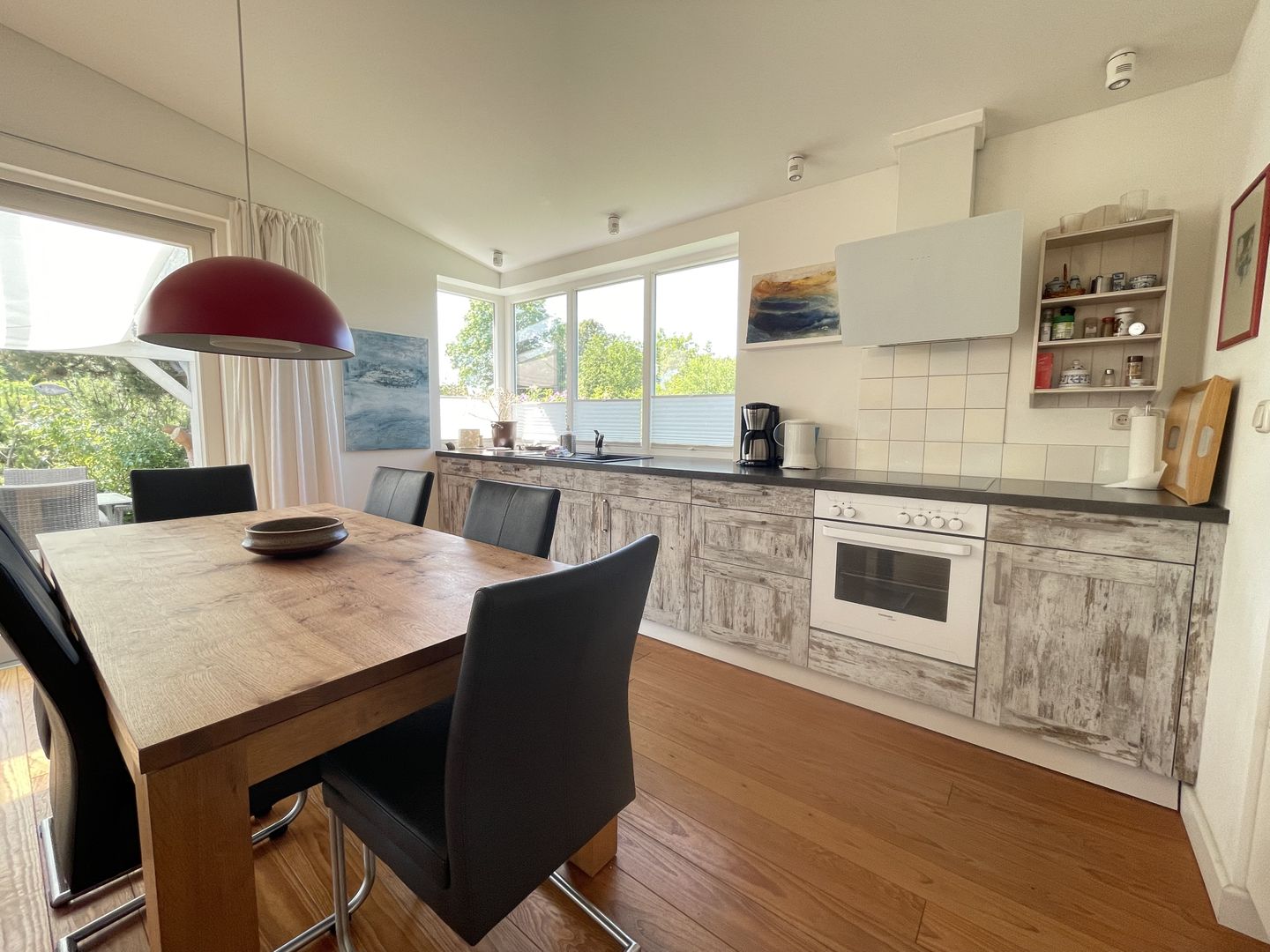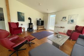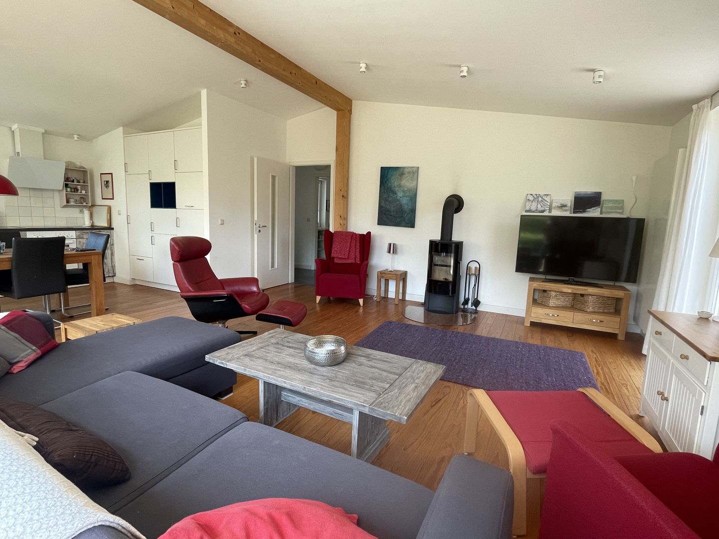 Im Erdgeschoss befindet sich zudem ein Bad mit Dusche (Haarfön vorhanden), ein Gäste-WC, eine Sauna und ein großer Wohnraum mit integrierter Küche (Geschirrspüler, Mikrowelle mit Grill, Kühlschrank mit Gefrierfach, E-Herd mit Umluft, Cerankochfeld, Waschmaschine und Trockner, Toaster, Wasserkocher, Kaffeemaschine) und dänischem Ofen.